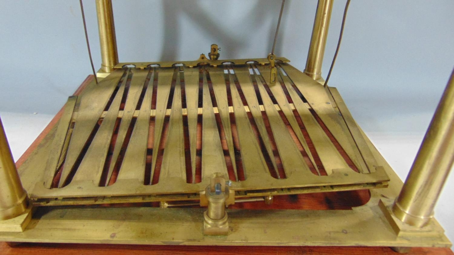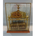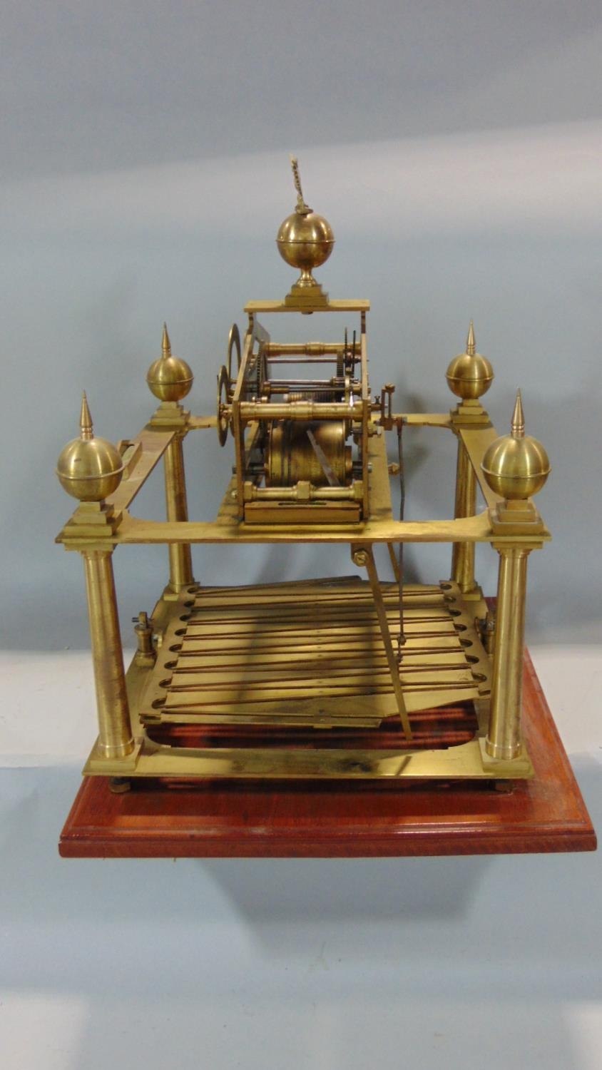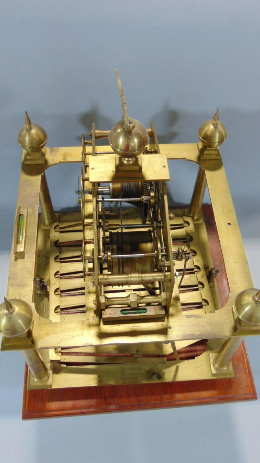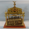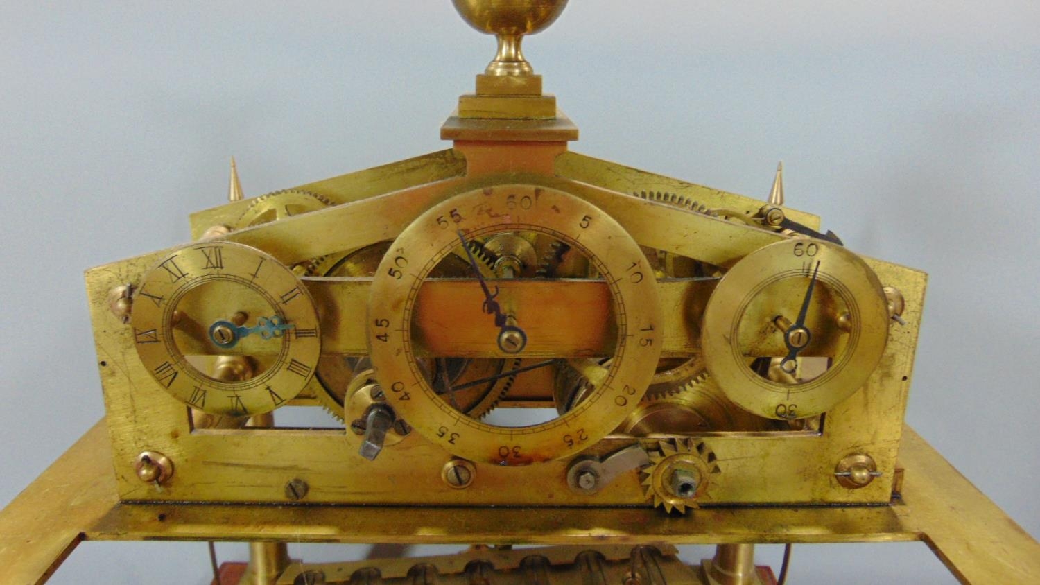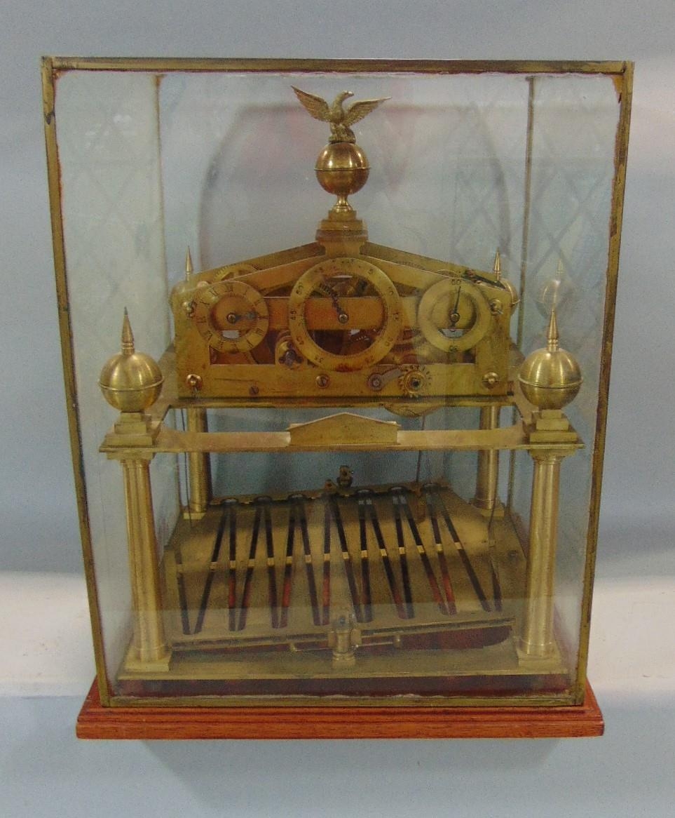 Glass cased Congreve clock, with three dials and rolling ball movement, mounted by an open winged eagle, upon an oak plinth base, 45cm high