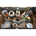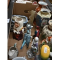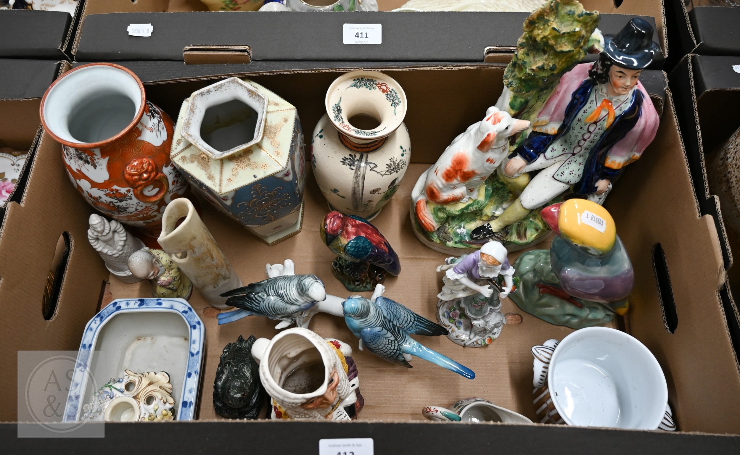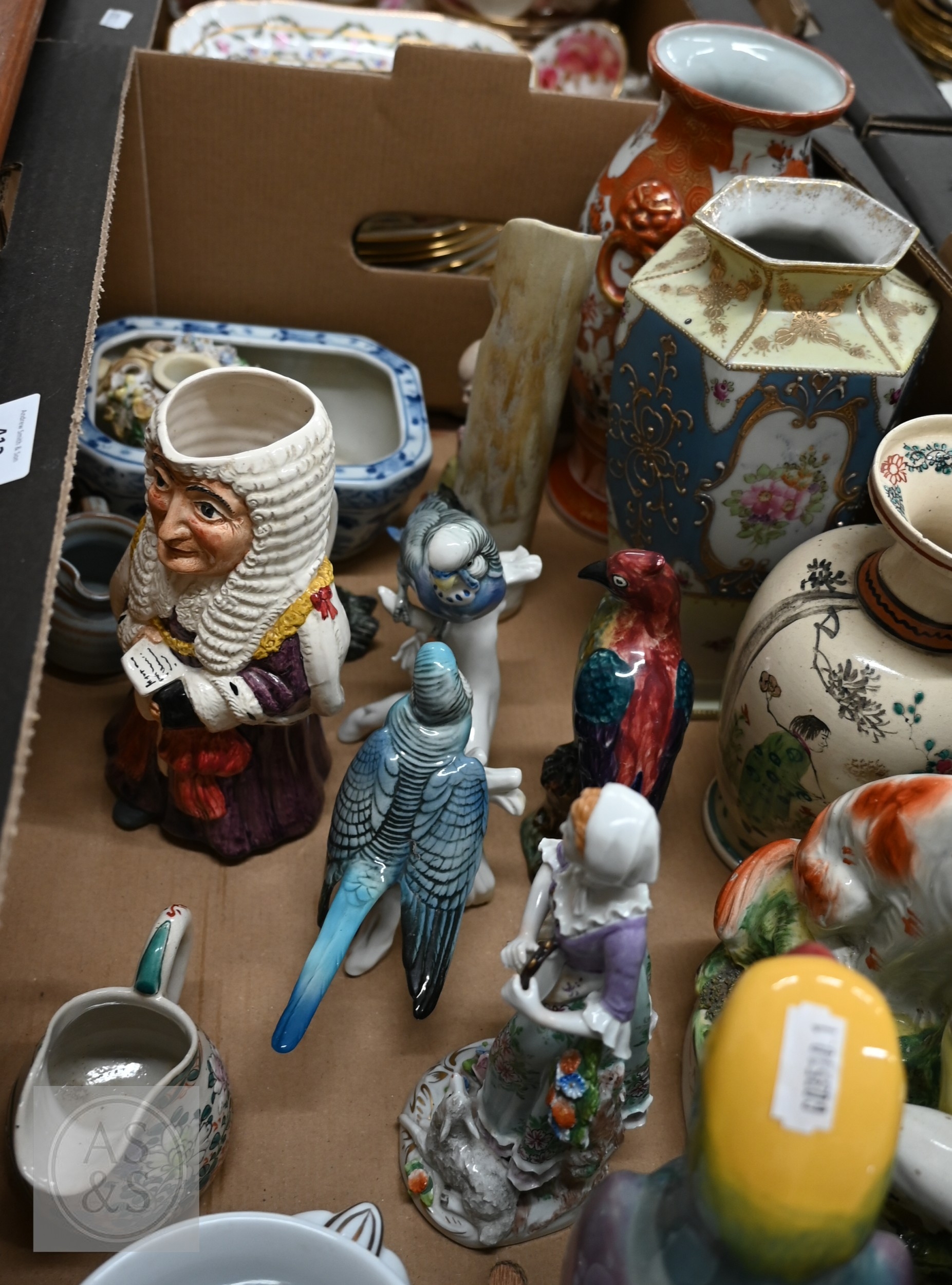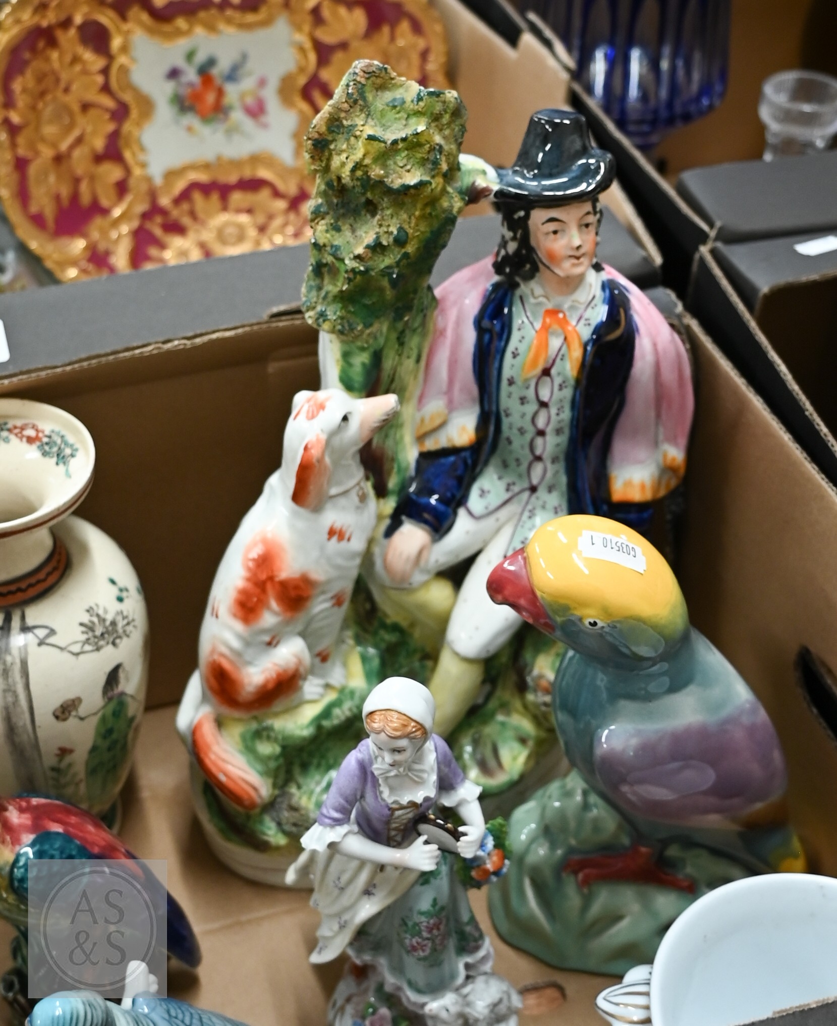 A group of two Karl Ens budgerigars, to/w a Sitzendorf shepherdess with tambourine, Staffordshire pottery group of a man with dog, jug modelled as a judge, etc (box)