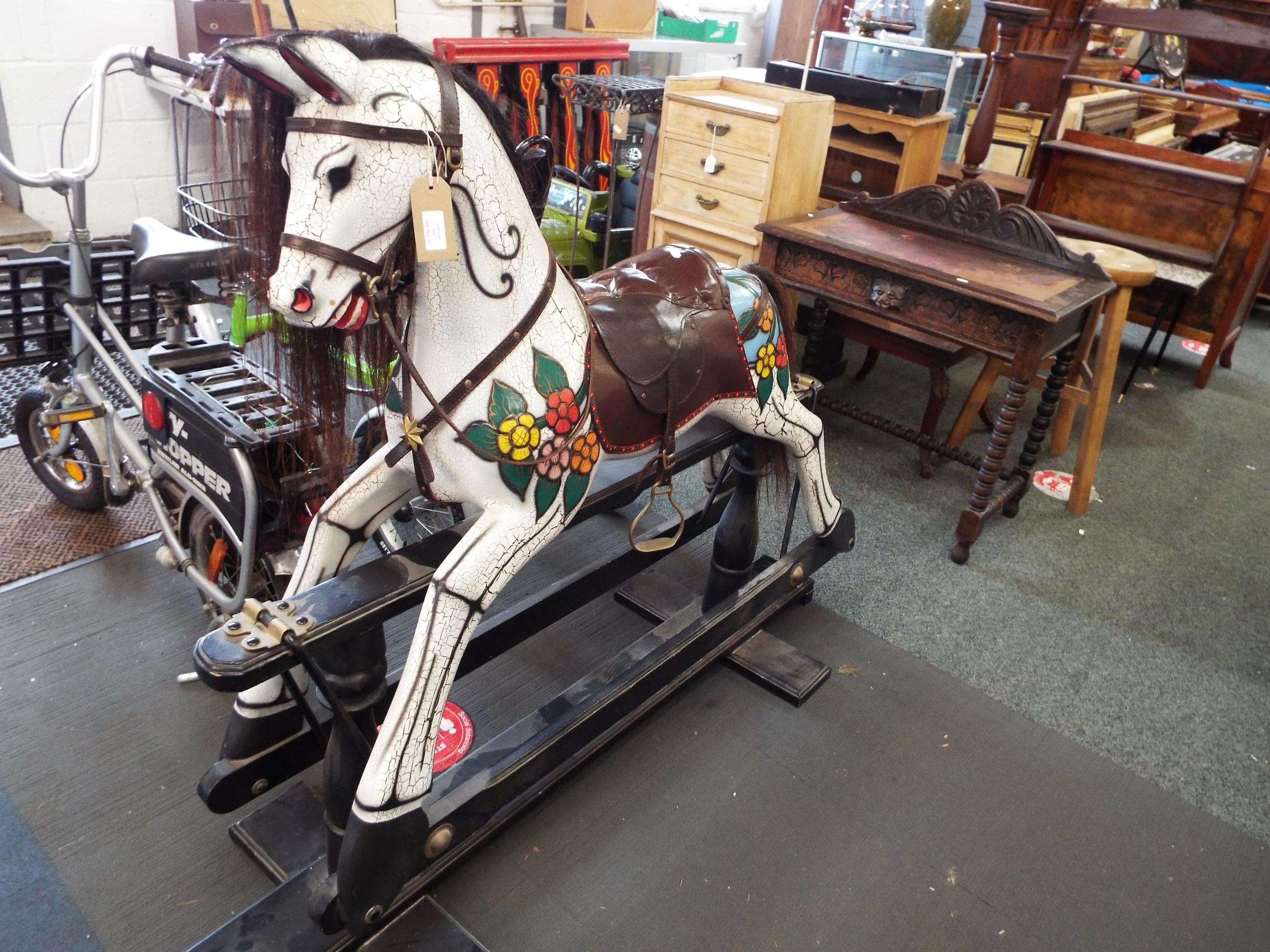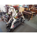A good quality grey rocking horse having crackle effect and floral decoration, leather saddle mounted on a wooden safety frame