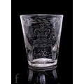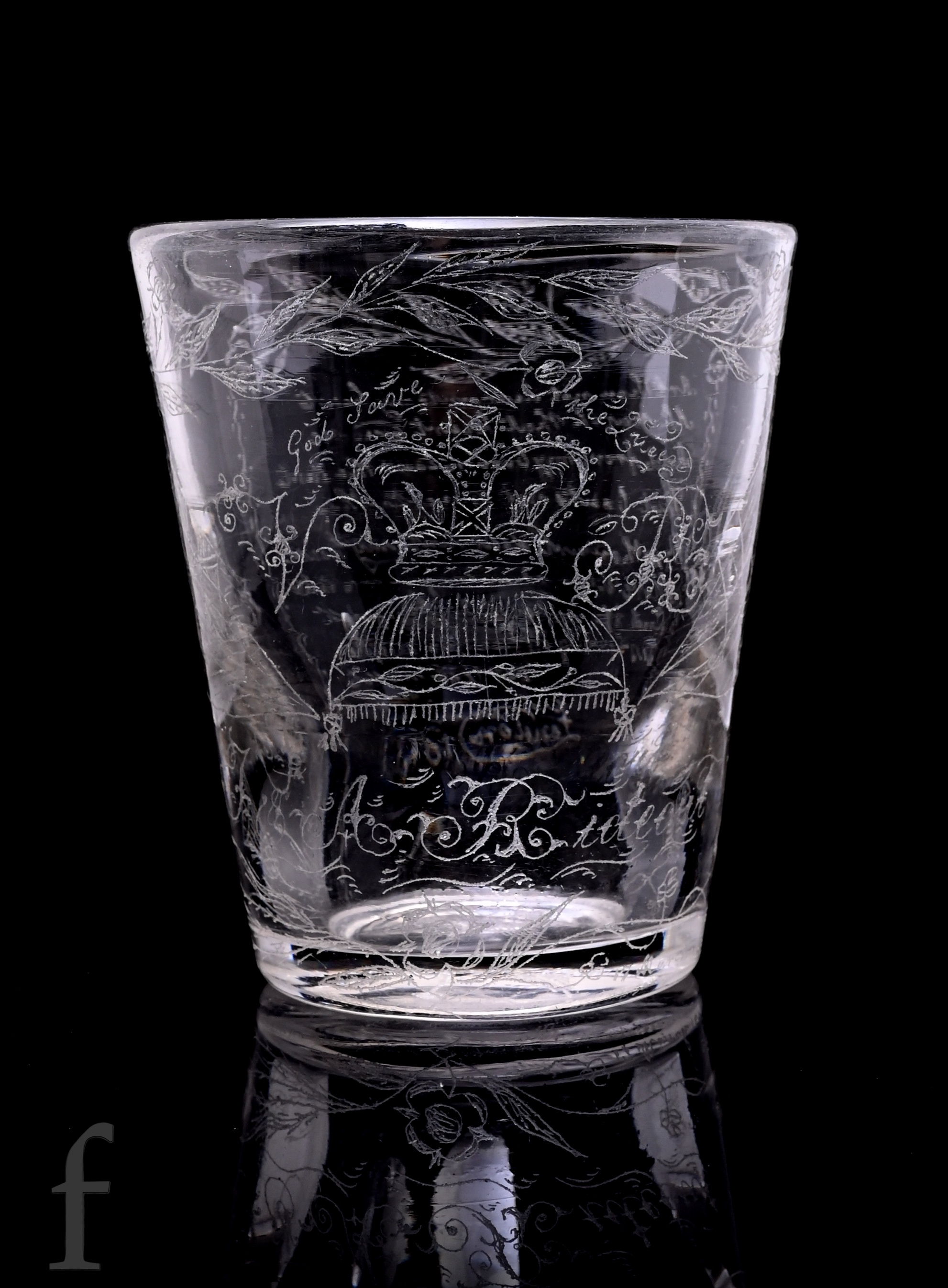 A 19th Century tumbler of flared form with optic base, the body diamond point engraved in the manner of T. Sutherland and dedicated to an F & A Rideout, possibly a wedding gift, detailed with a crown in a cushion VR monogram, flags of the British Isles and poem verso titled 'Forget me not', height 10cm.