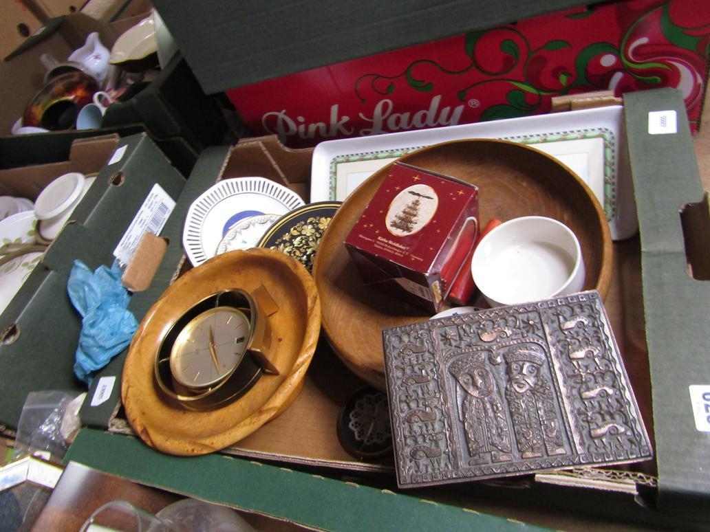 BOX TO INCL WOODEN BOWLS, CHINA, CLOCK ETC