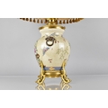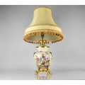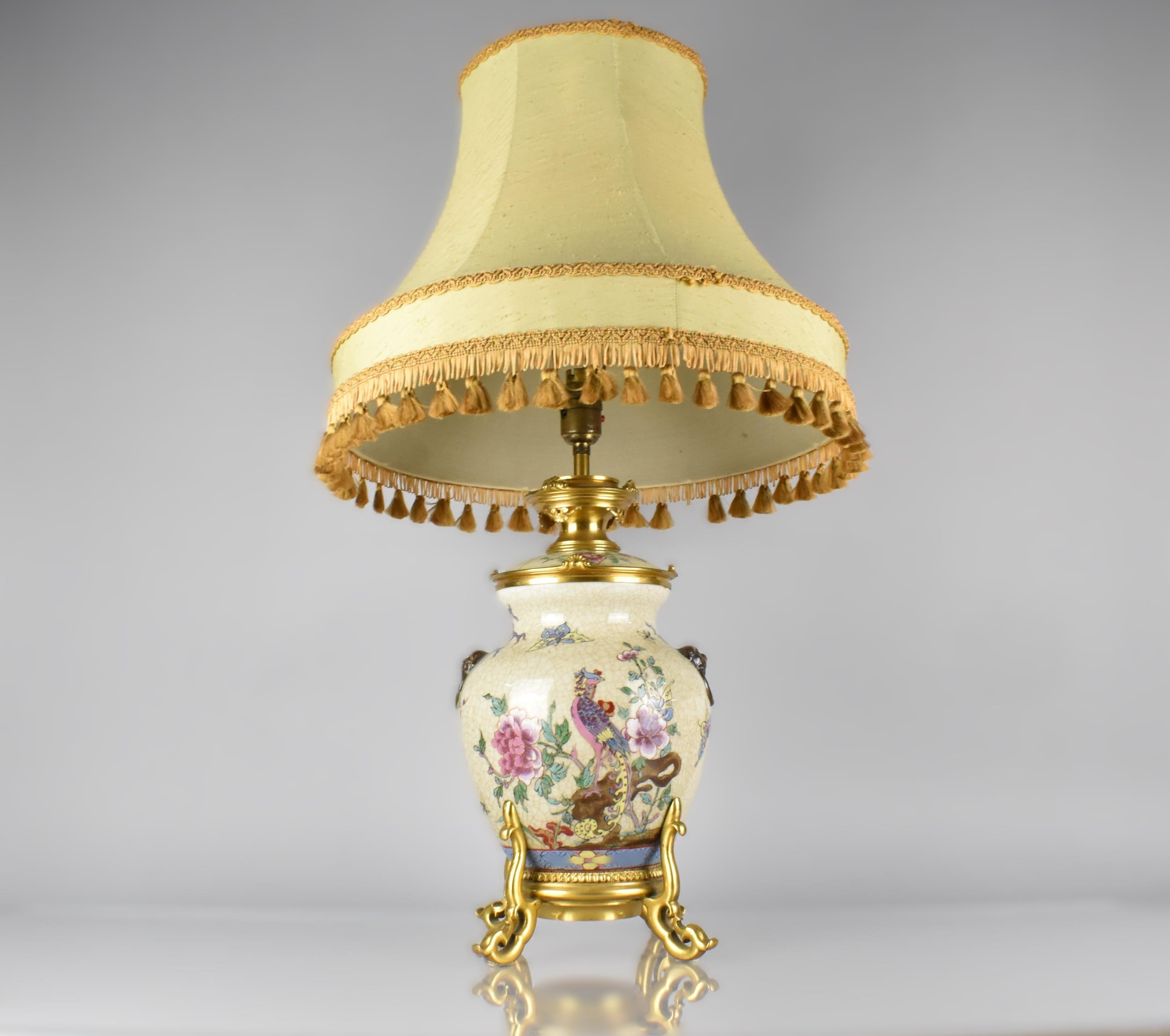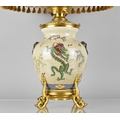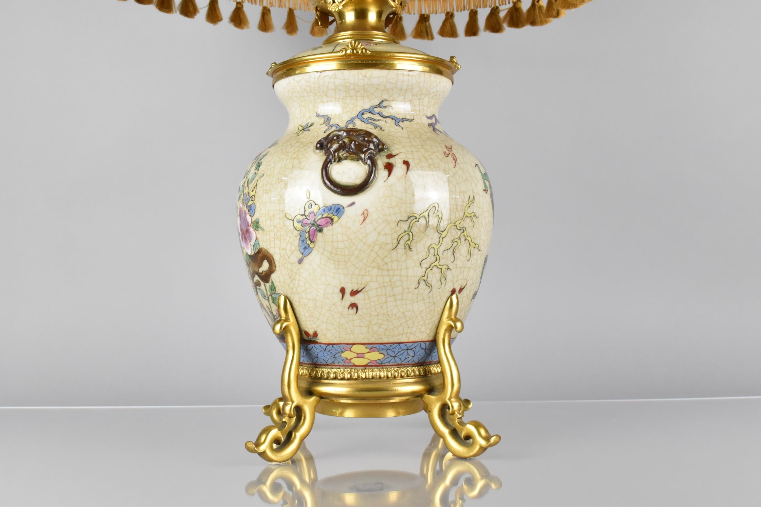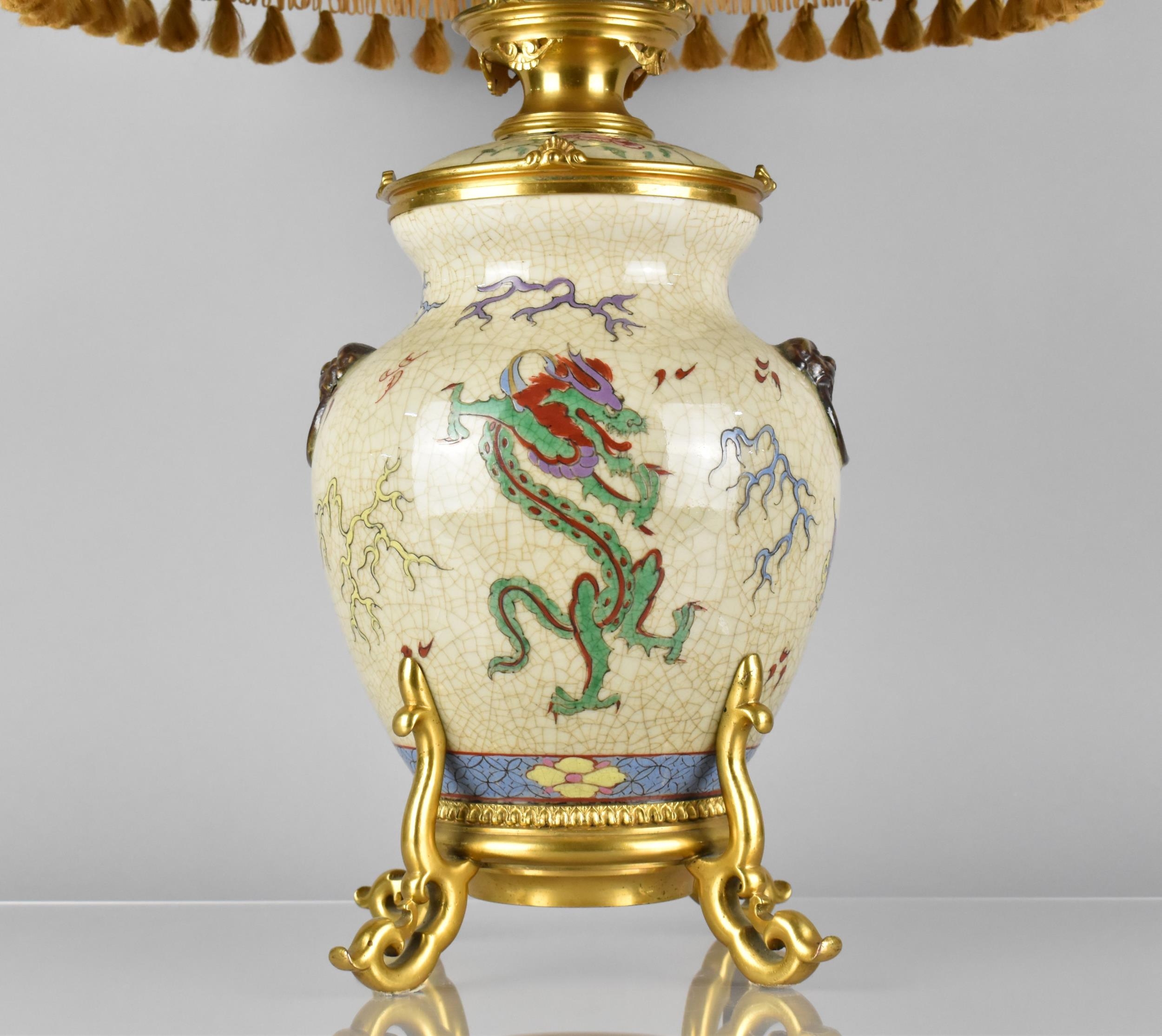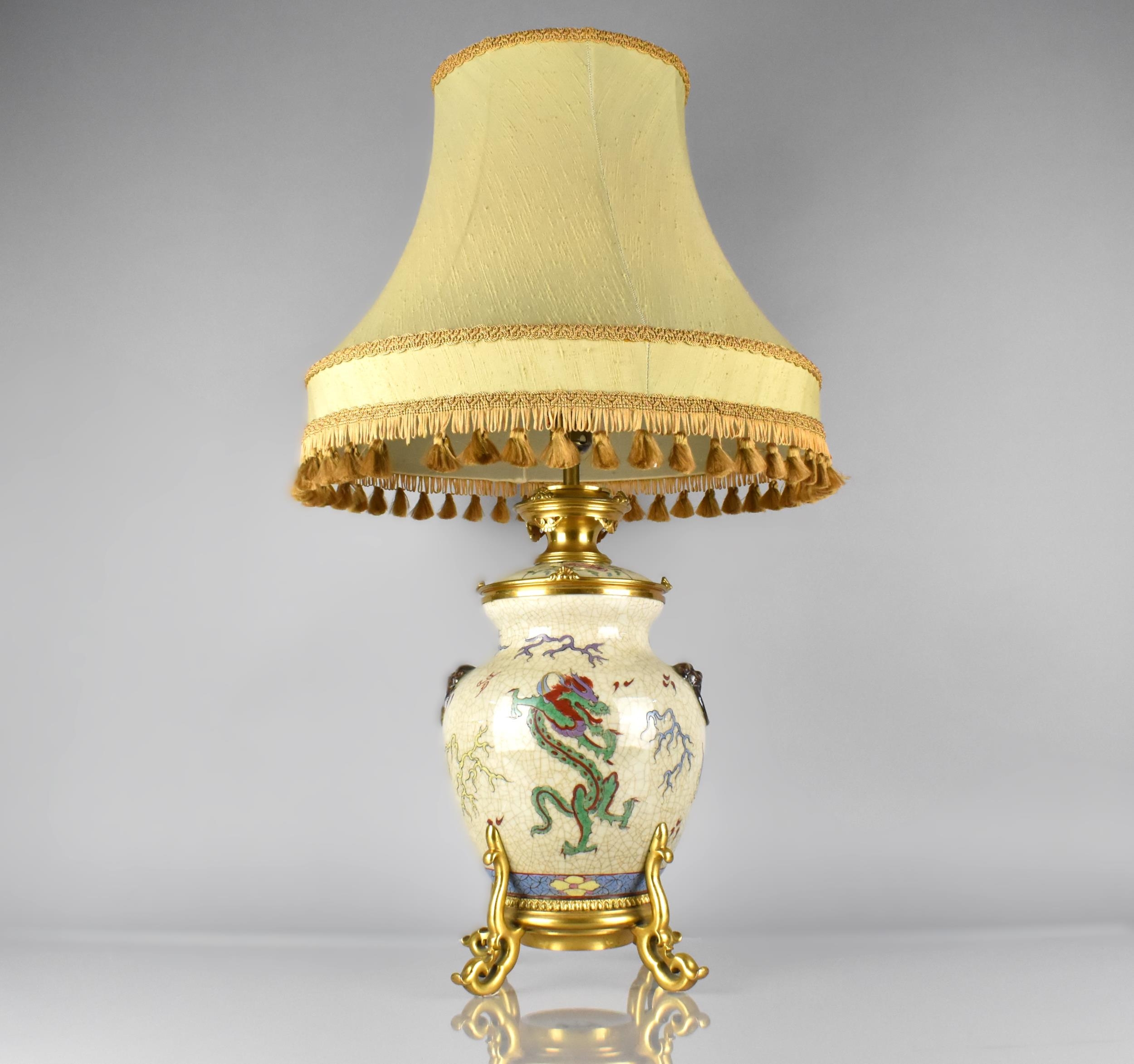 A Chinese Porcelain Crackle Glazed and Ormolu Mounted Table Lamp, The Chinese Body of the Globular Form Decorated in Polychrome Detailing Dragons and having Oxidised Faux Lion Ring Mask Handles with Shade 71cm High