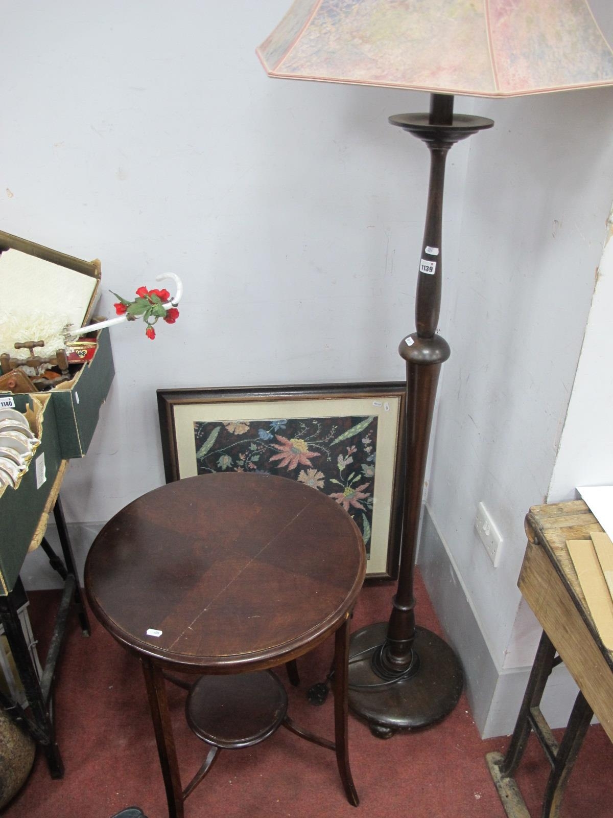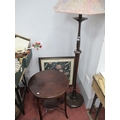 A Standard Lamp, circular mahogany table, fire screen (3).