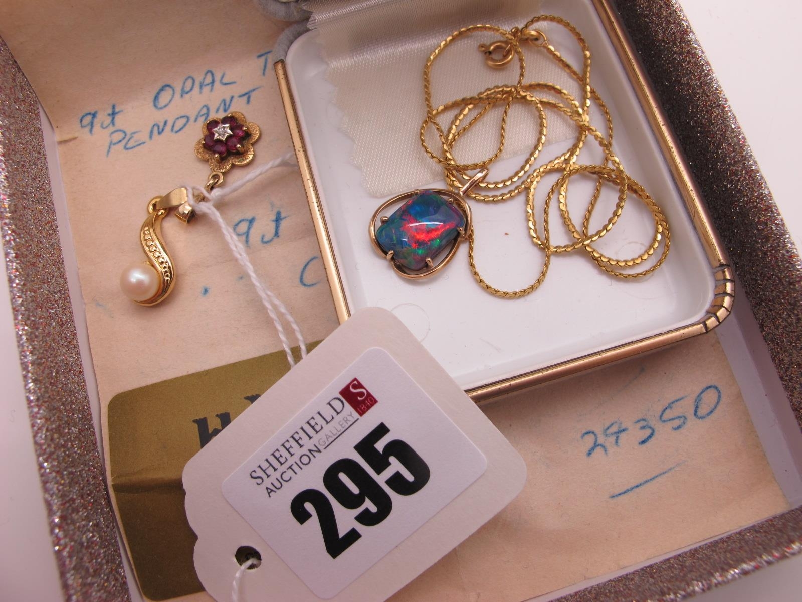 A 1980's Opal Triplet Single Stone Pendant, claw set, on a fine chain stamped "375" complete with original HoVans Jewellers (Australia) purchase receipt dated 11/11/85; together with a dainty cluster pendant, stamped "375" and another pendant.