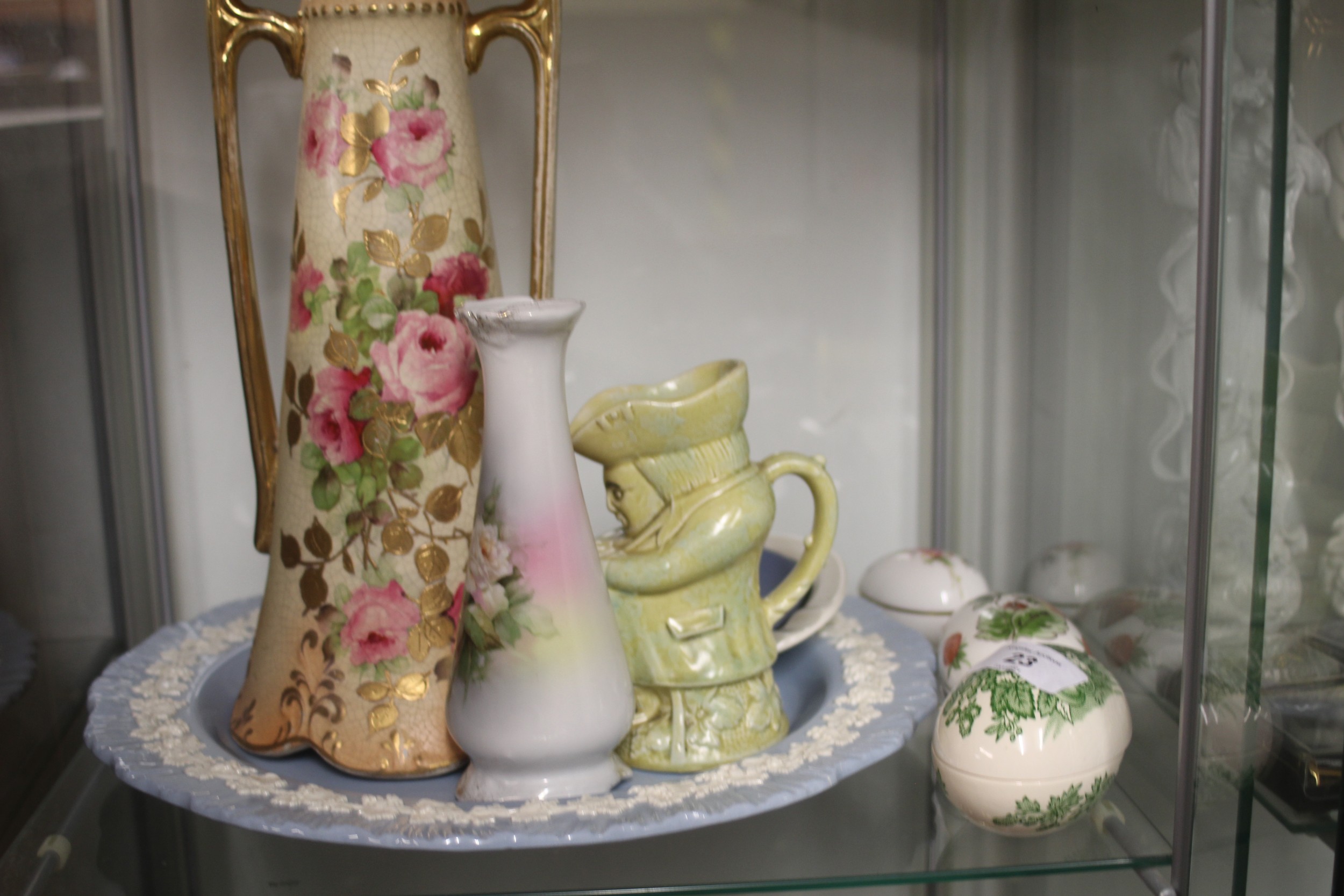 Assortment of China/Porcelain Items including Wedgwood (a Large Plate, a Small Ashtray and a Pope Paul II Souvenir Plate), Ovoid Lidded Trinket Boxes (Coalport, Hammersley, Masons), Two Vases and a Toby Jug
