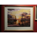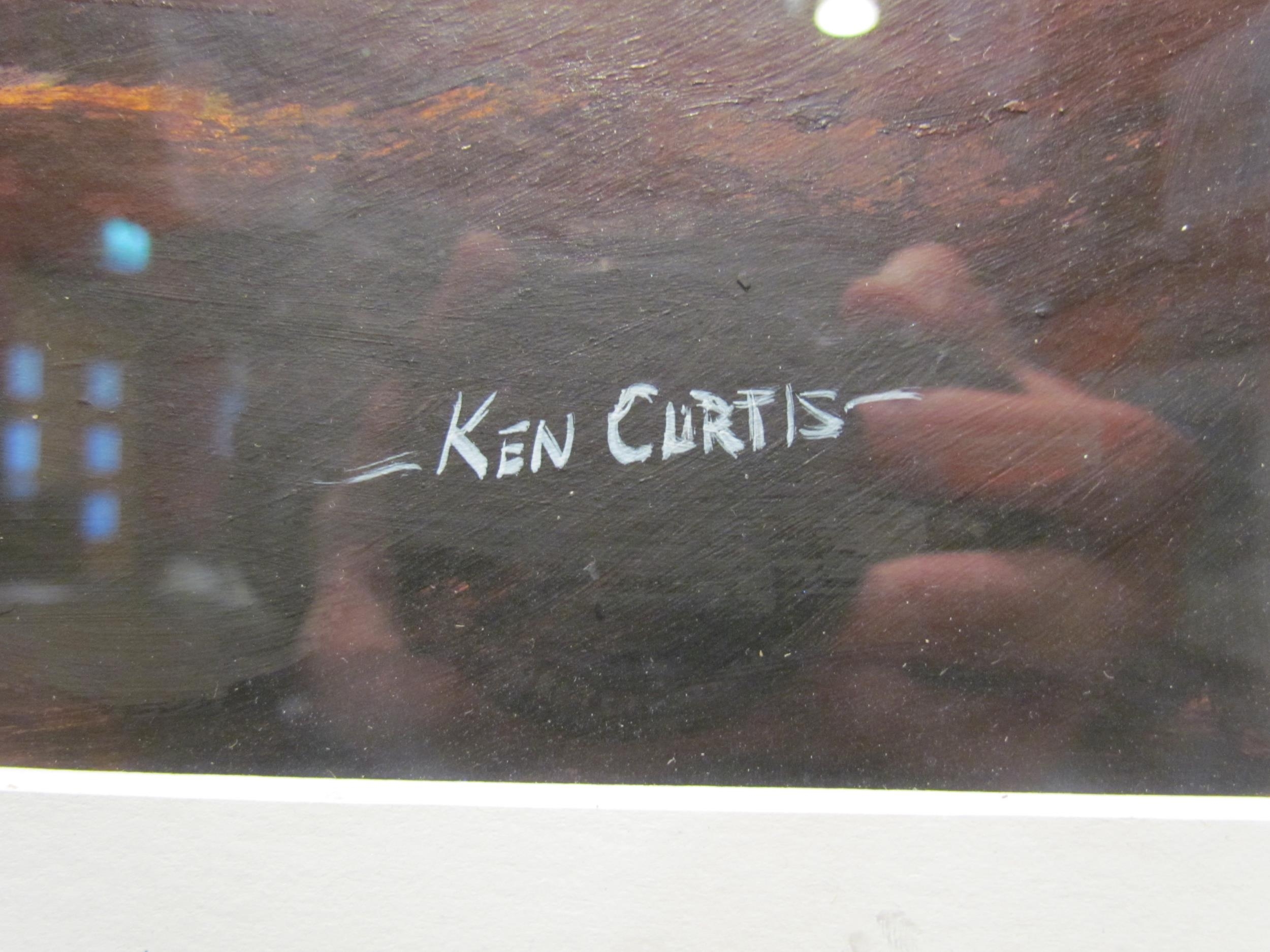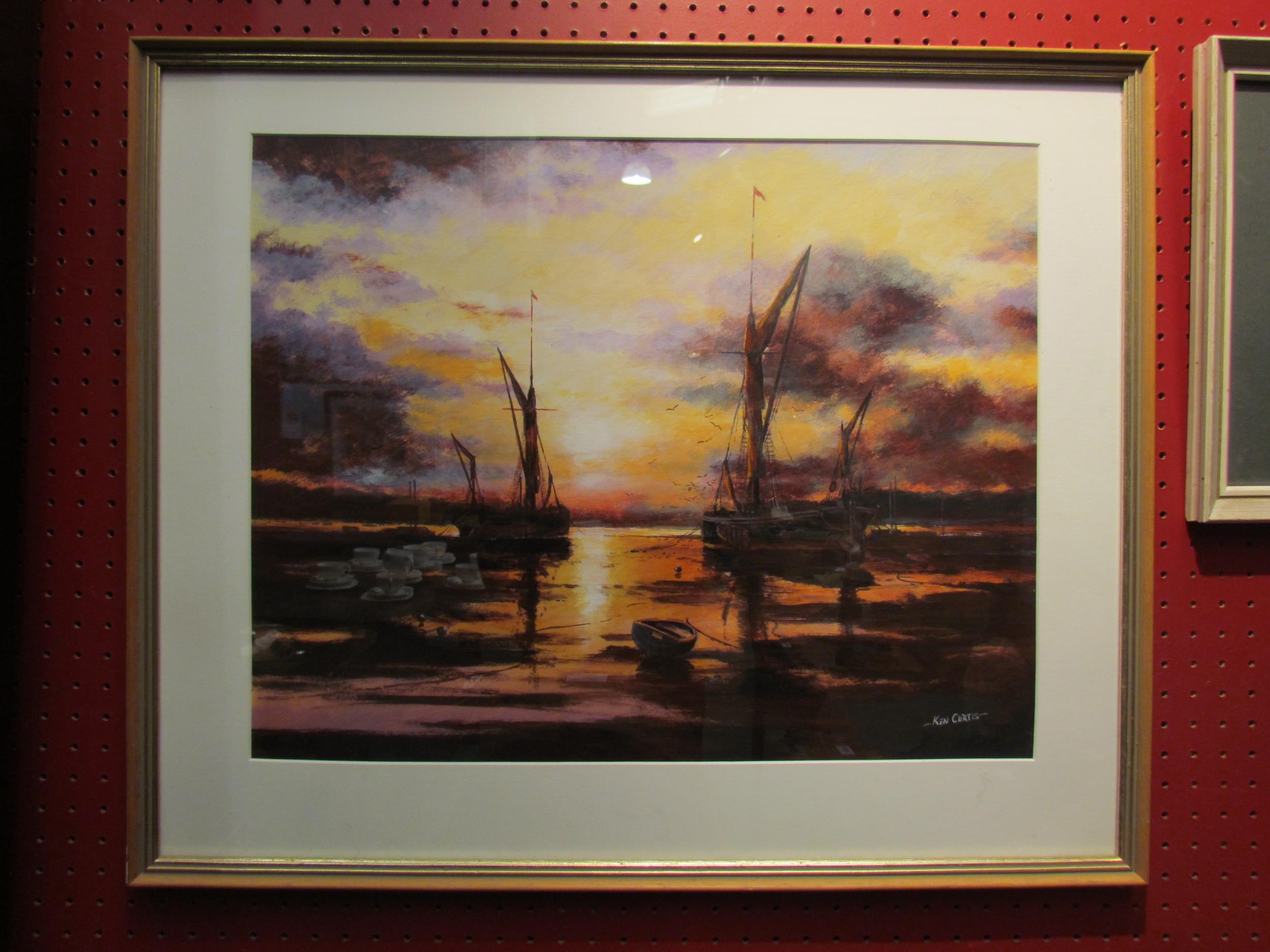 KEN CURTIS: An acrylic "Barges at Pin Mill", signed lower right, framed and glazed. 37.5cm x 47.5cm image size
