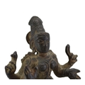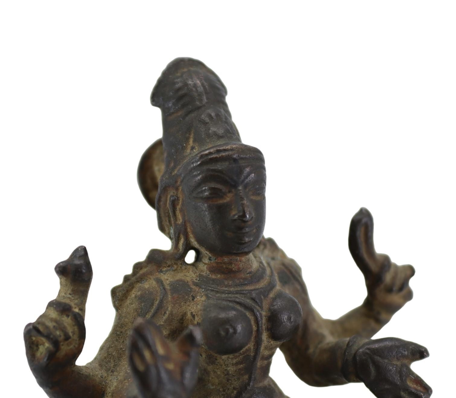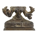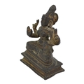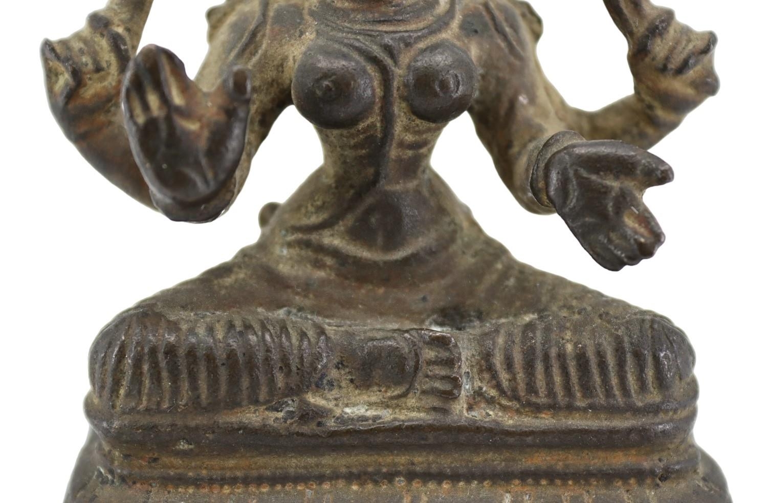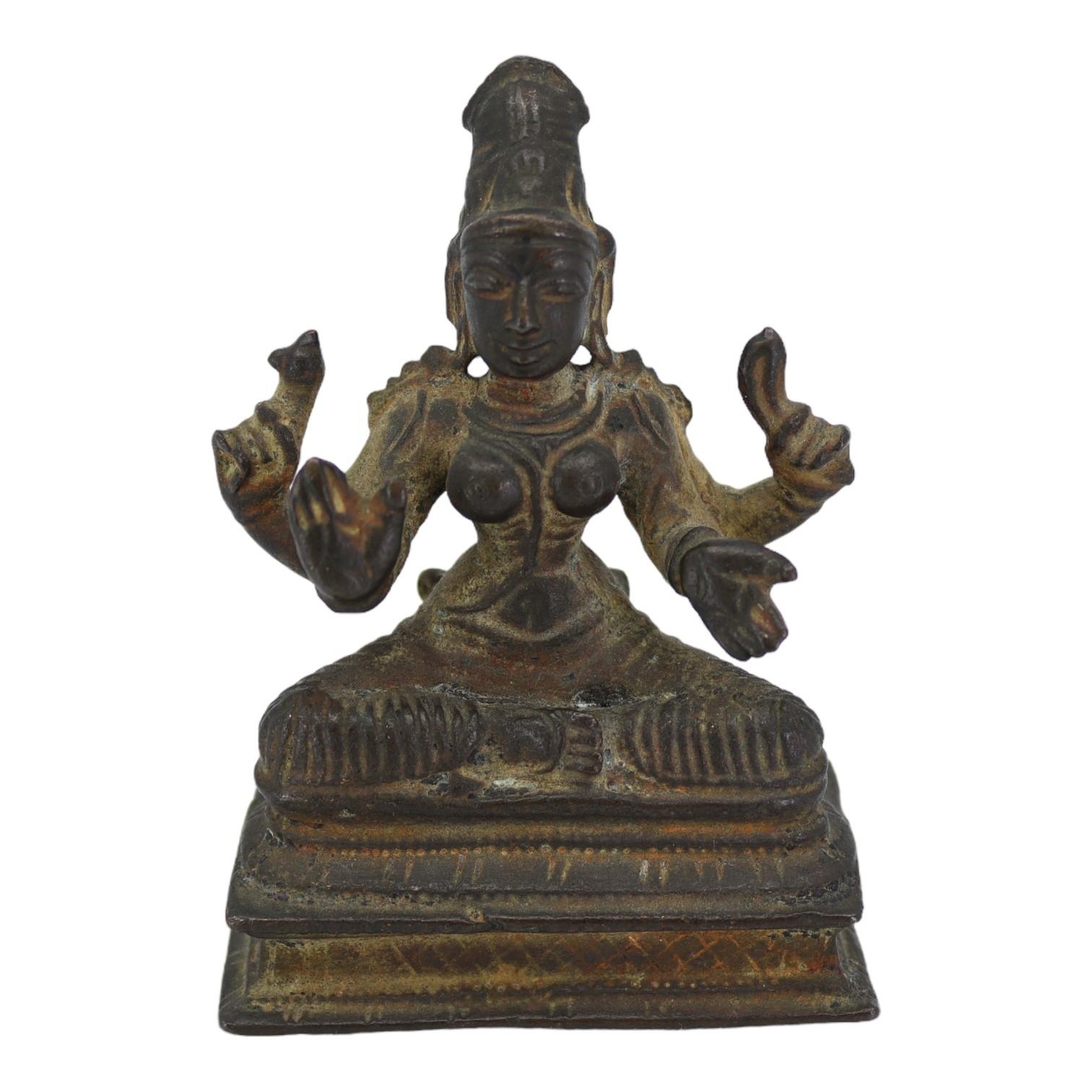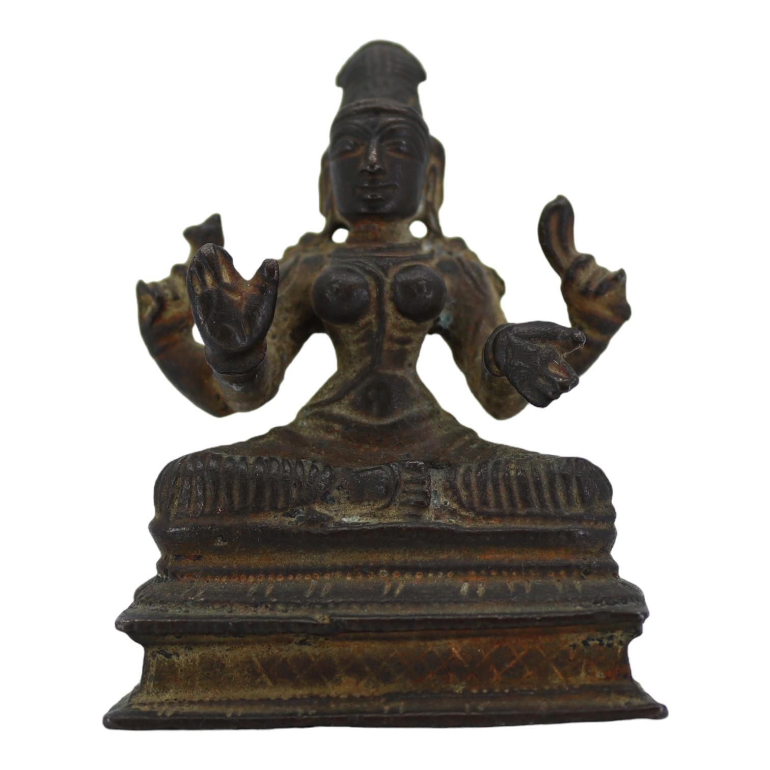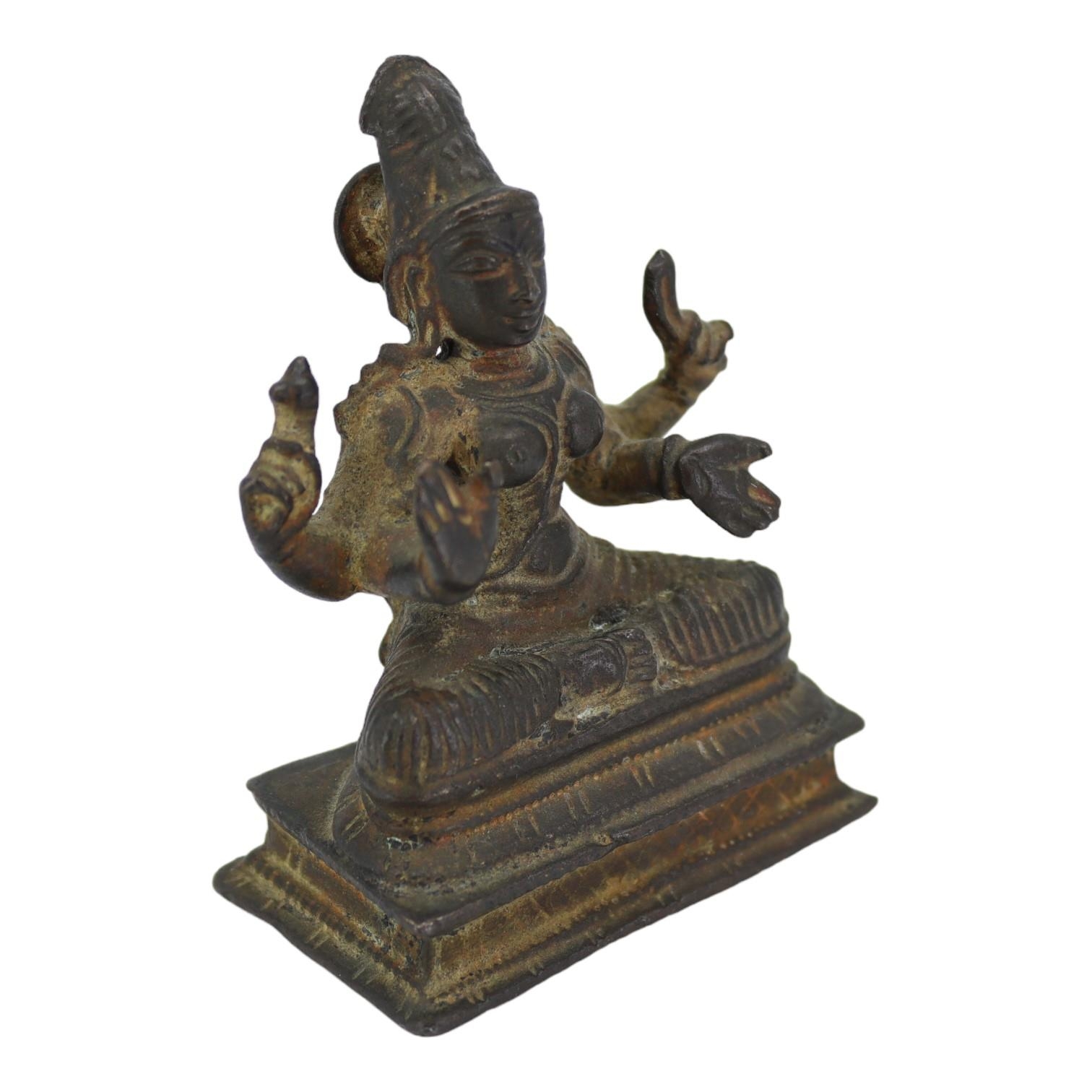 AN UNUSUAL 17TH CENTURY, POSSIBLY EARLIER, SOUTH INDIAN COPPER ALLOY FIGURE OF MOHINI OR PRAVATI IN FULLY SEATED MEDITATIVE POSE