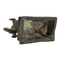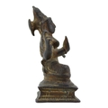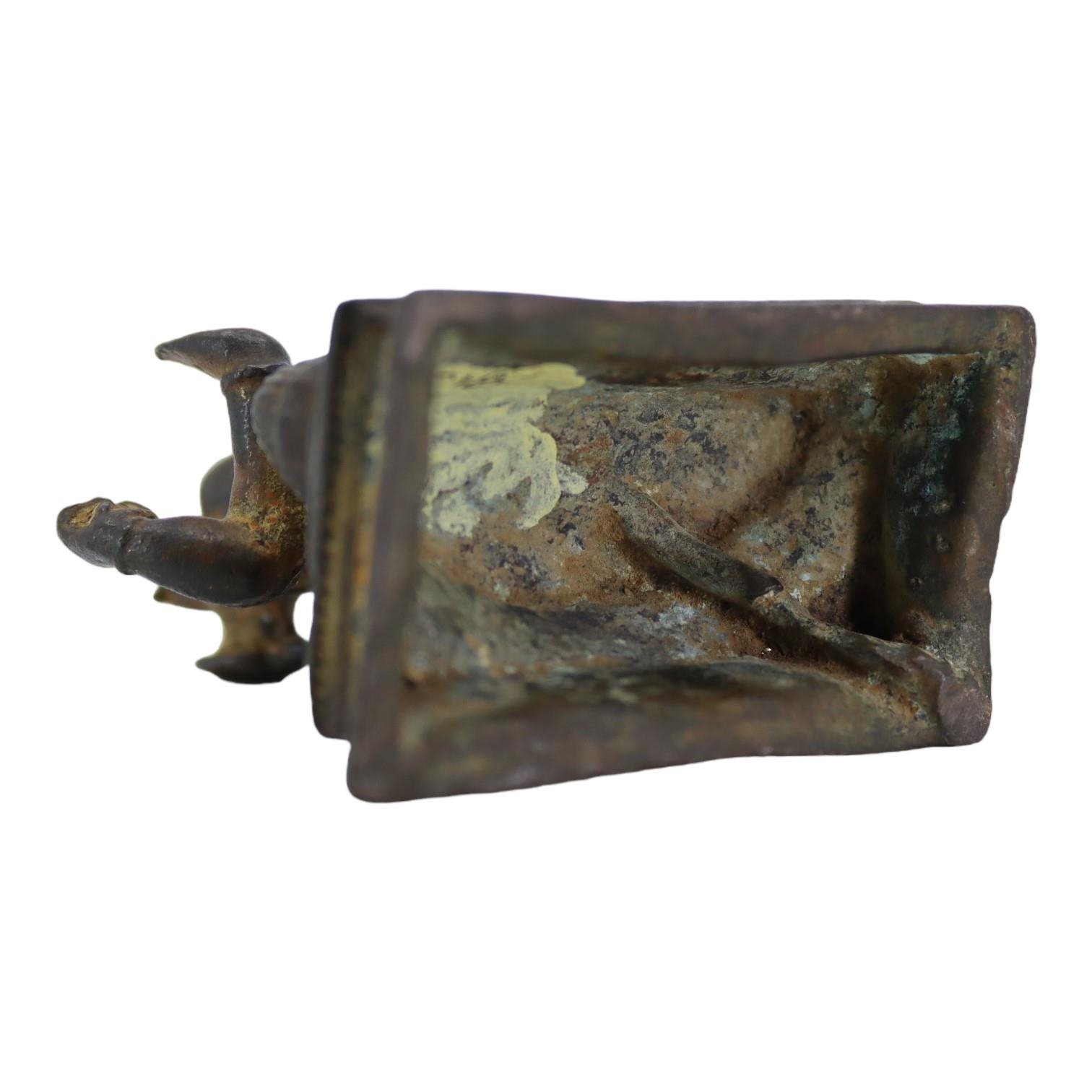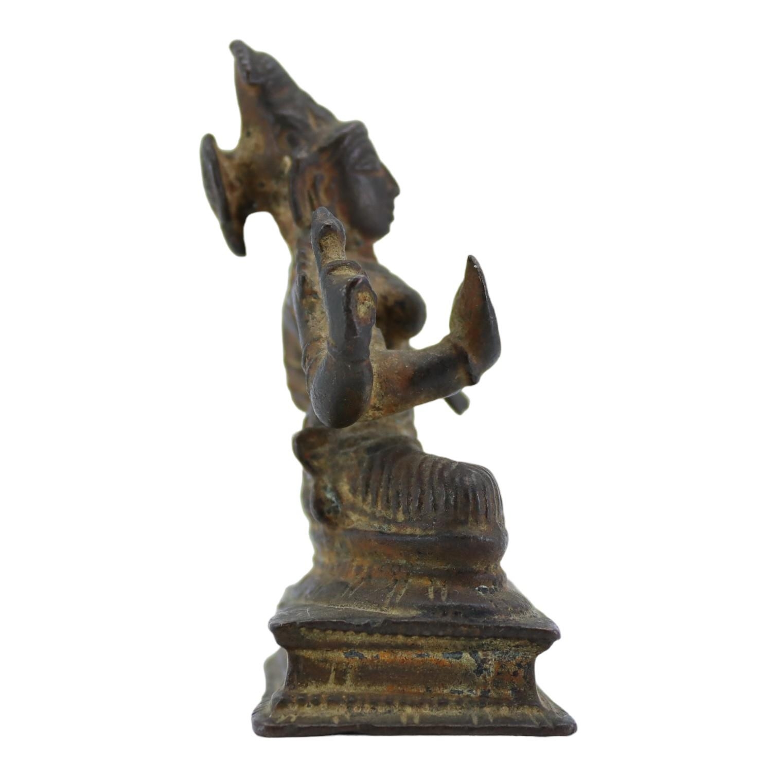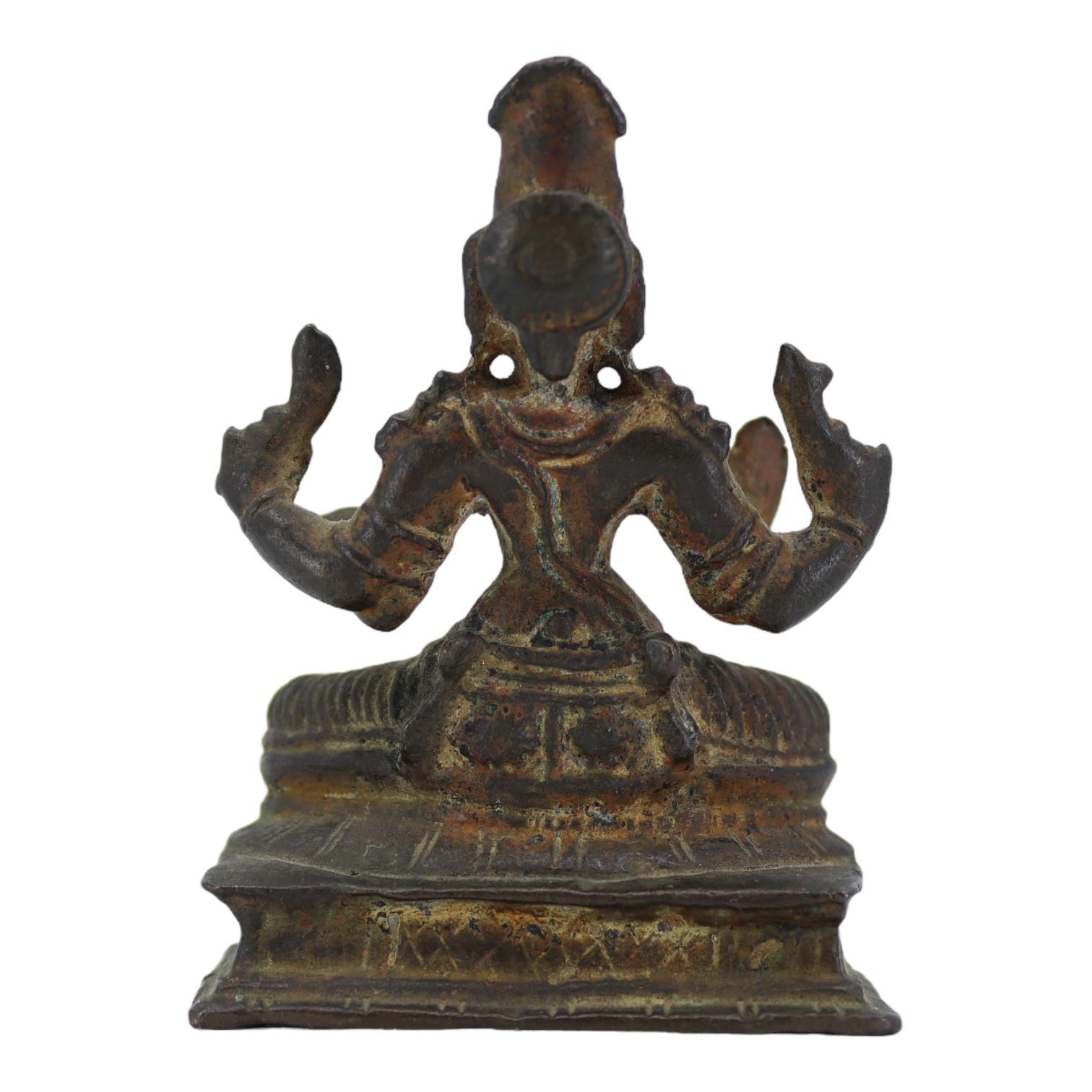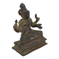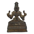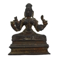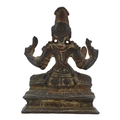 Depicted having four arms with Front hands performing mudras, showing left hand performing abhayamudra ( the gesture of protection and reassurance) and right hand performing varadamudra (the gesture of wish-granting), back hands shown holding objects, sat on lotus base raised on rectangular stepped plinth.