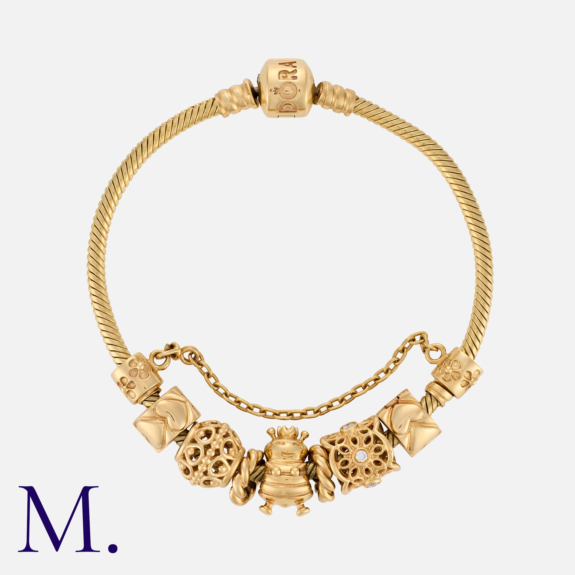 PANDORA, A Charm Bracelet in 14 carat yellow gold, the snake link bracelet adorned with a series of charms. Marked 585 for 14 carat gold.