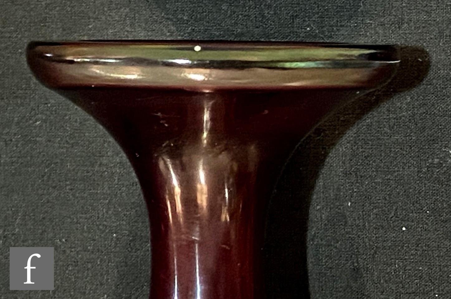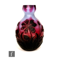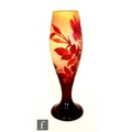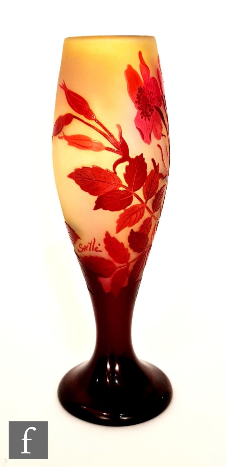 Galle - An early 20th Century cameo glass vase of footed swollen form, cased in ruby over a graduated amber and clear ground, cut with dog roses, with internal polishing and cameo signature, height 23.5cm.