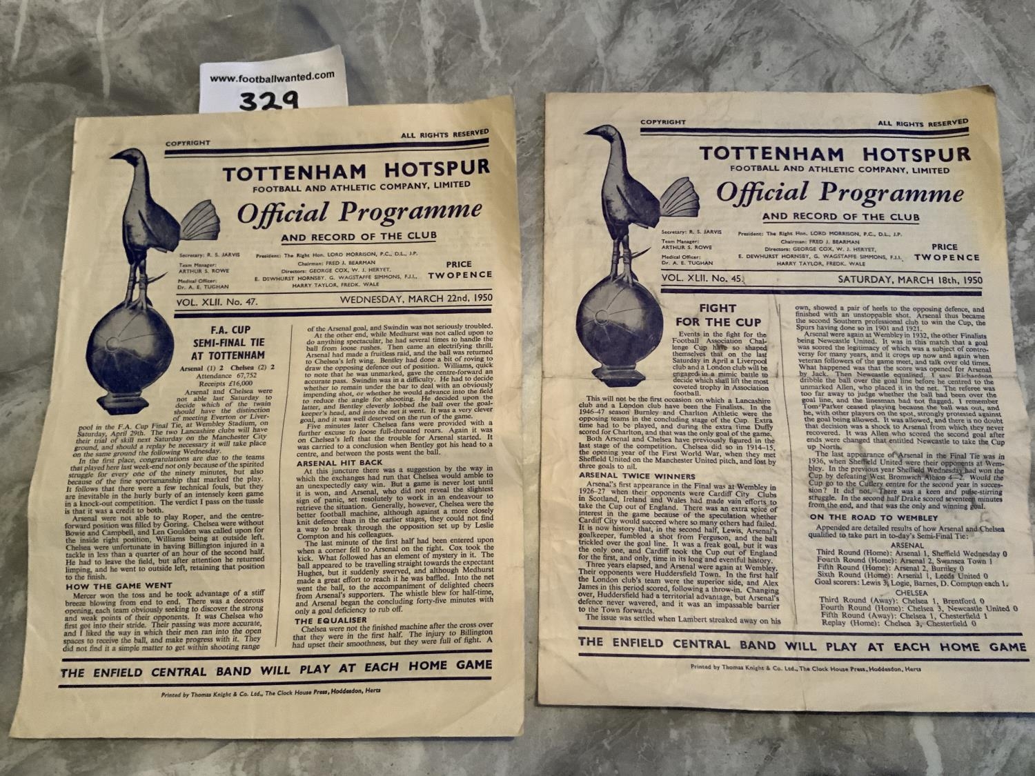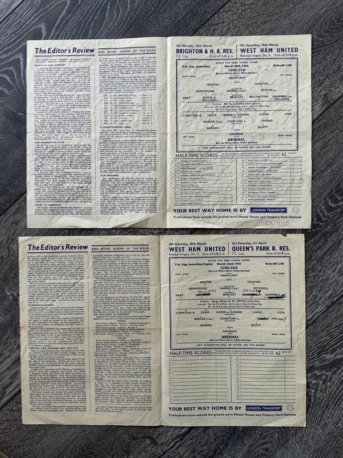 1950 FA Cup Semi Final Football Programmes: Chelsea v Arsenal 18 3 with creasing plus replay 4 days later in good condition with team changes. Both played at Tottenham. (2)