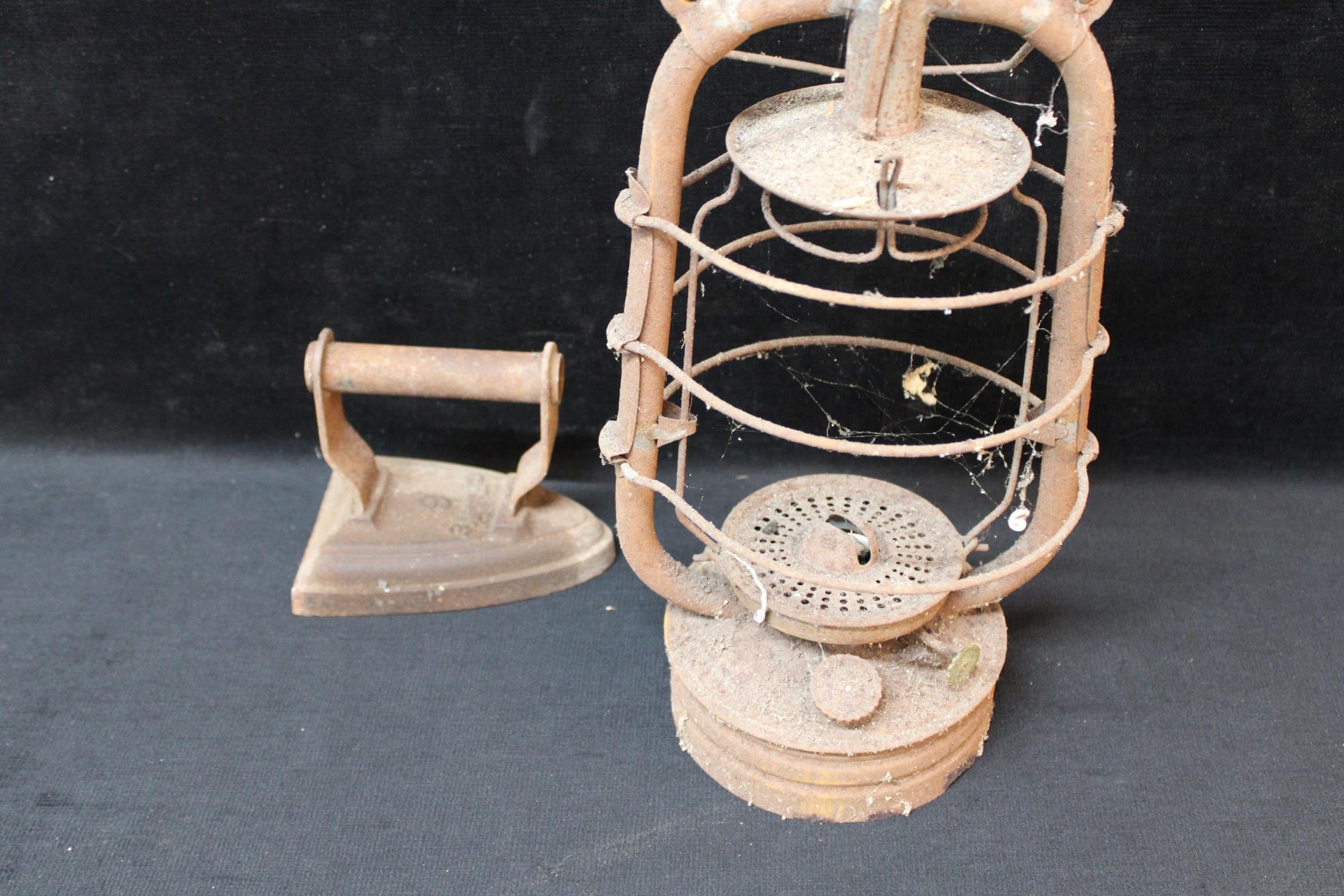 A smoothing iron and oil lamp frame