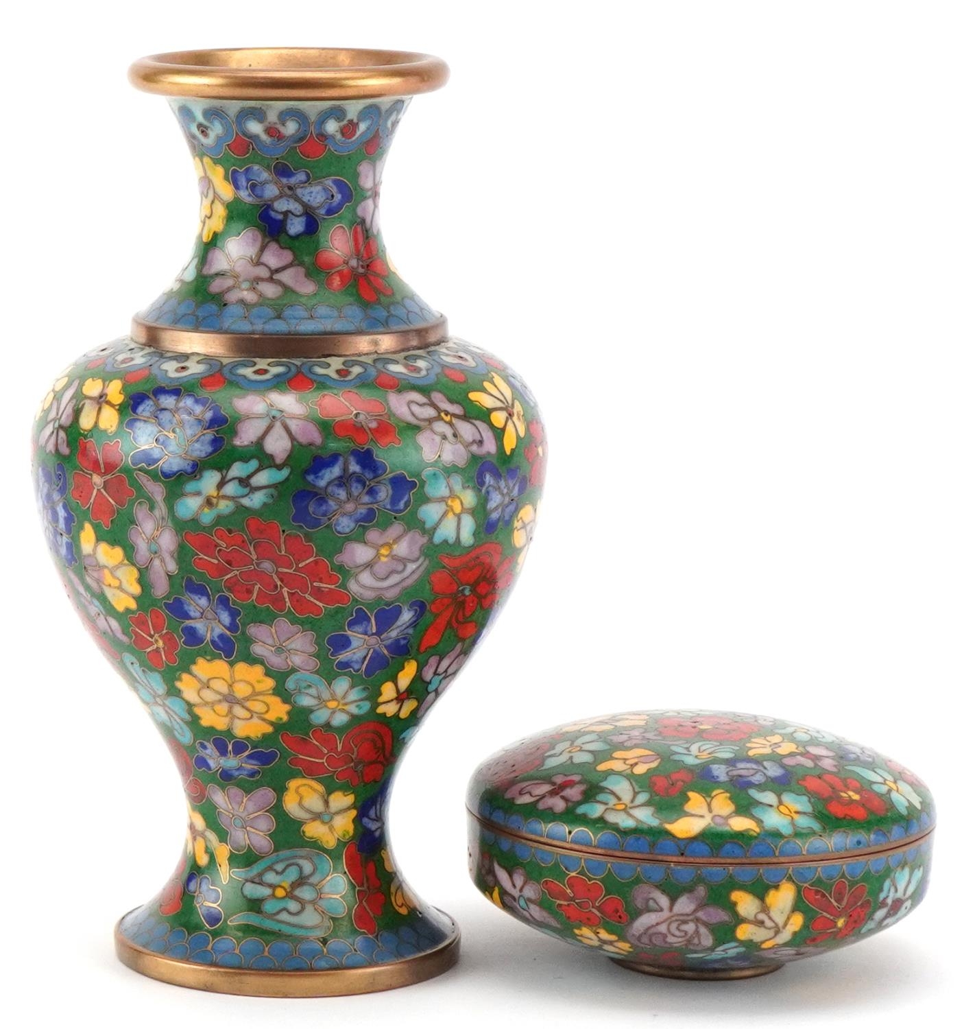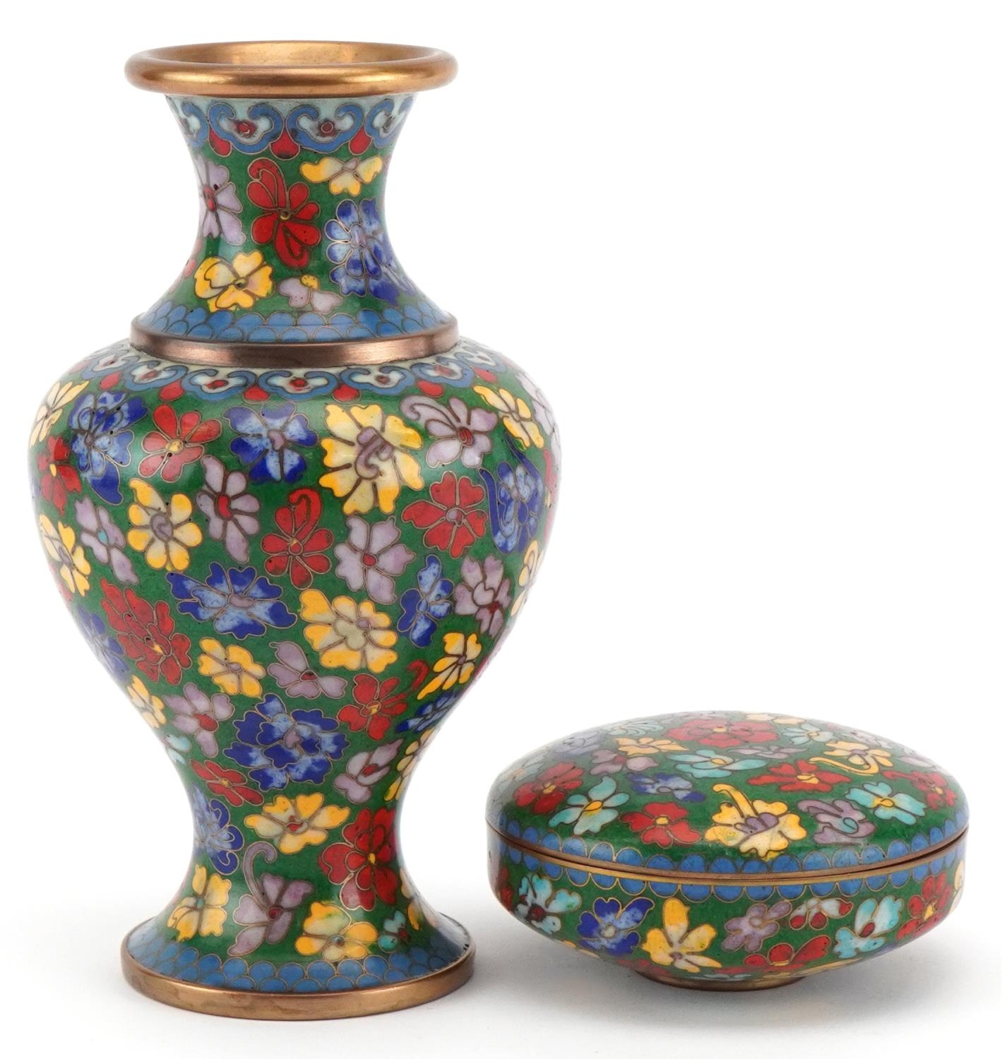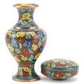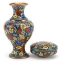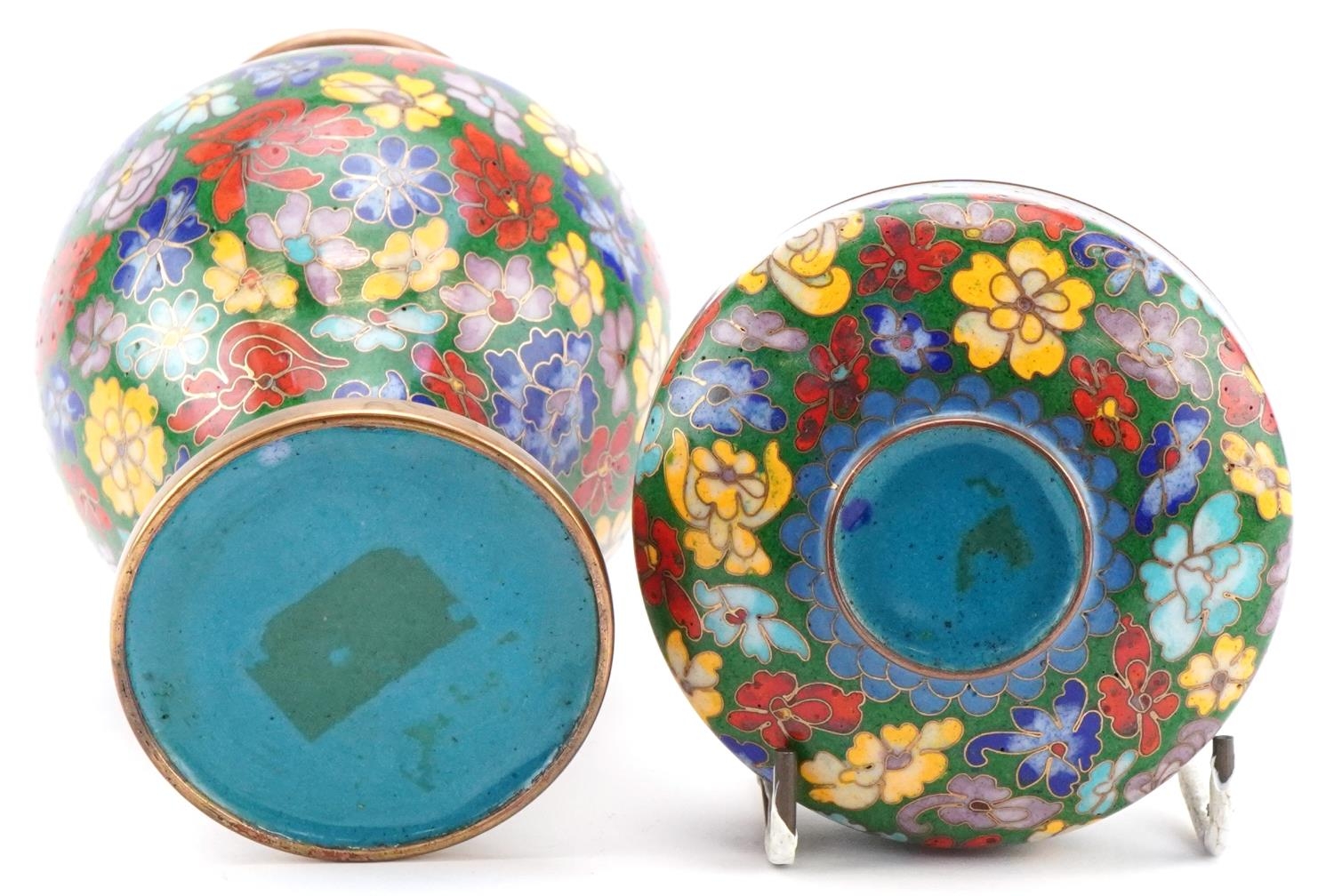 A Chinese cloisonné vase and dish set, 20th century, with floral decoration, 15cm high.