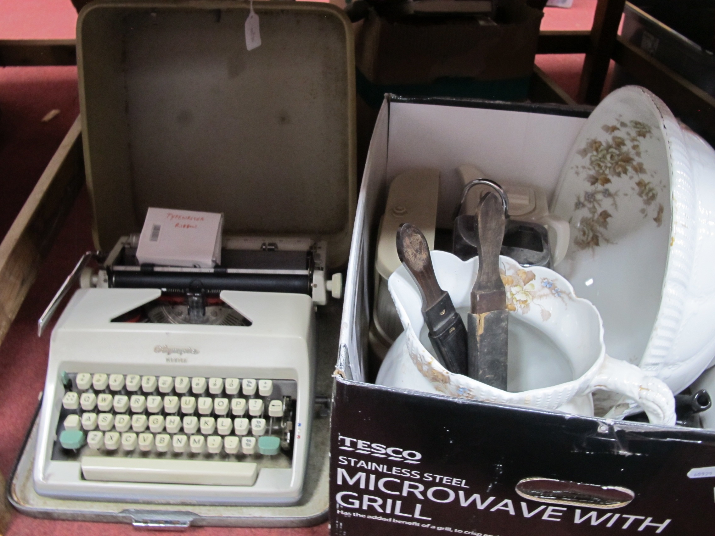 Goblin teasmade, wash jug and bowl, razor strops, teapot and Olympia typewriter. 1 Box
