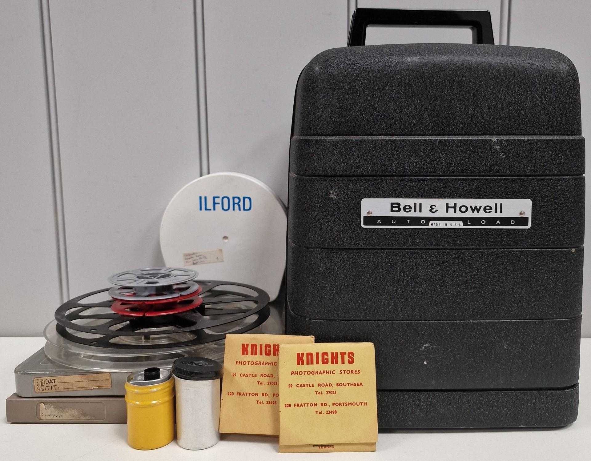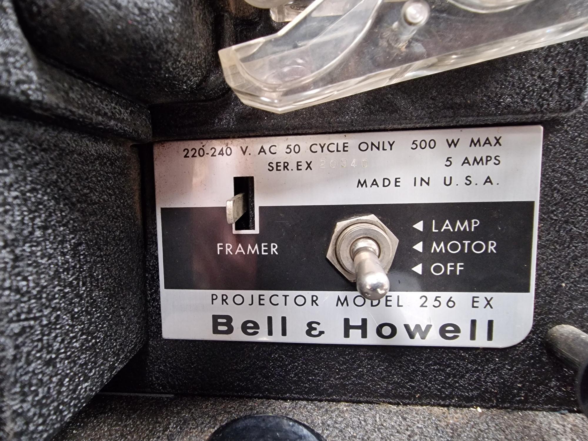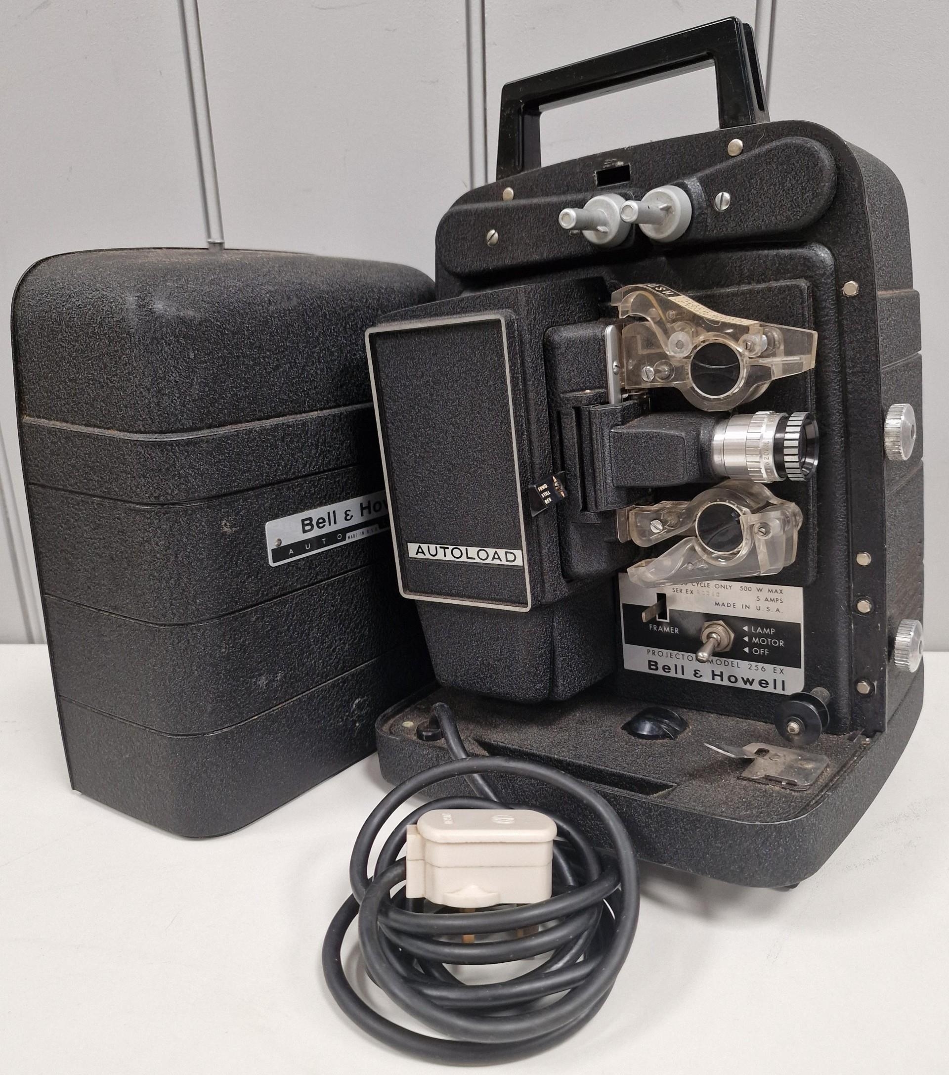 A vintage 8mm film projector & accessories, by 'Bell & Howell'. Modle no. 256EX. Will require wiring upgrade if use considered.