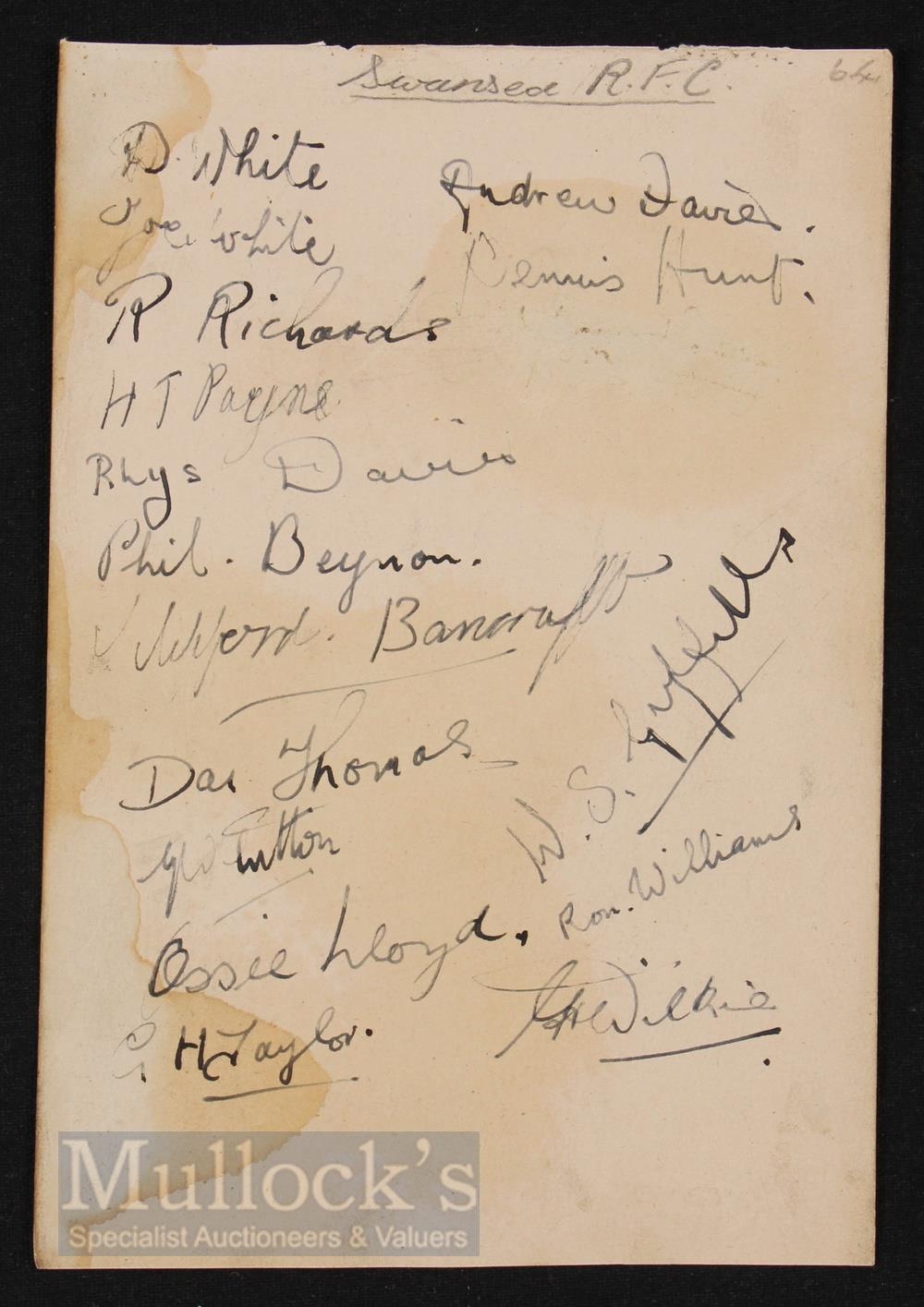 Autographs, 1930s, Swansea RFC & England Rugby Caps (22): Autograph book page containing the Swansea players to one side, including many famous All Whites names, and several English caps to the rear, inc Tommy Kemp and Cyril Holmes. Some staining to one edge, otherwise G