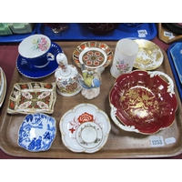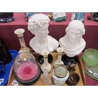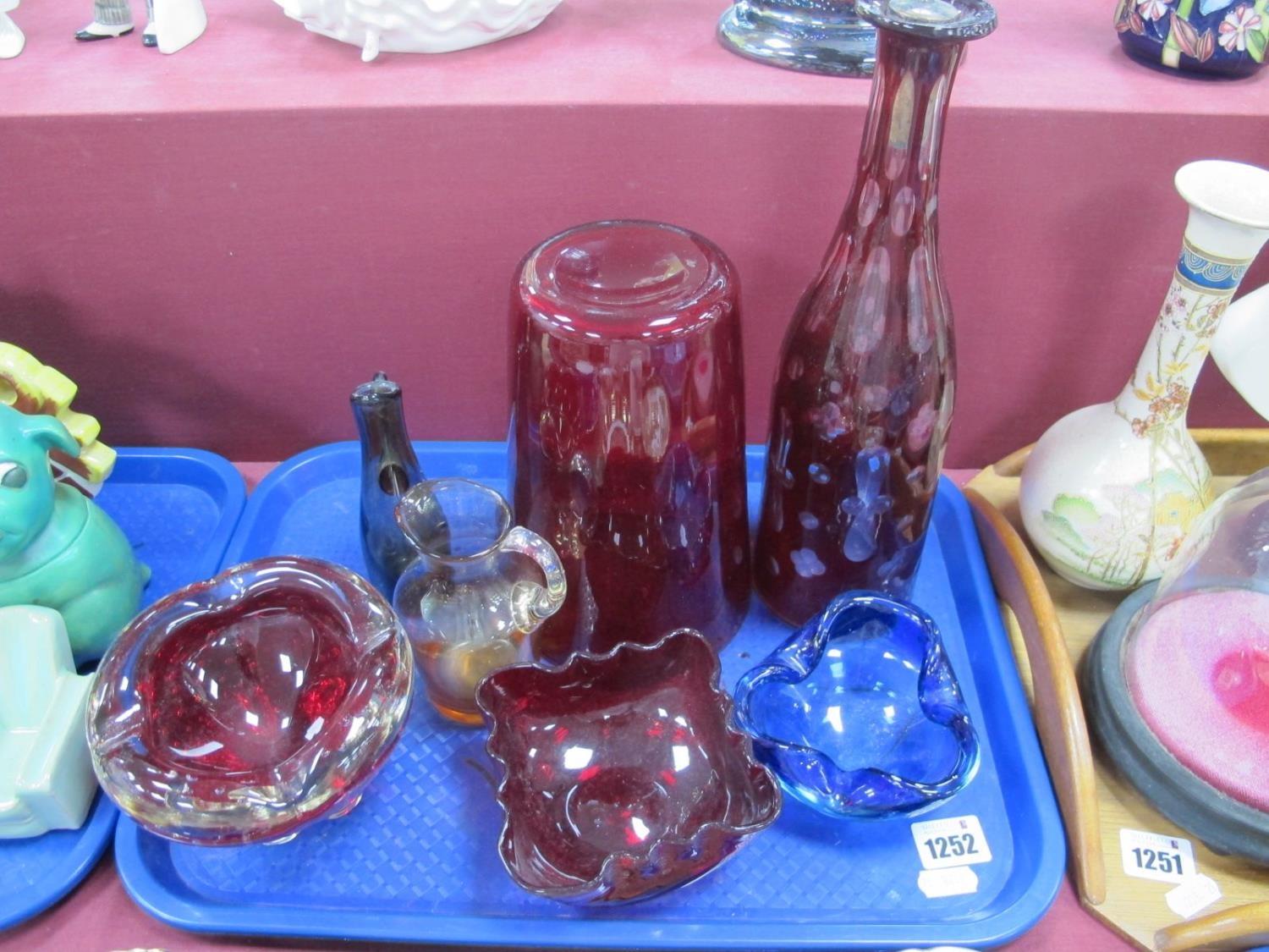 Whitefriars Ruby Glass Bucket Vase, 19cm high, ruby flash glass decanter, Venetian bowl, other glassware:- One Tray