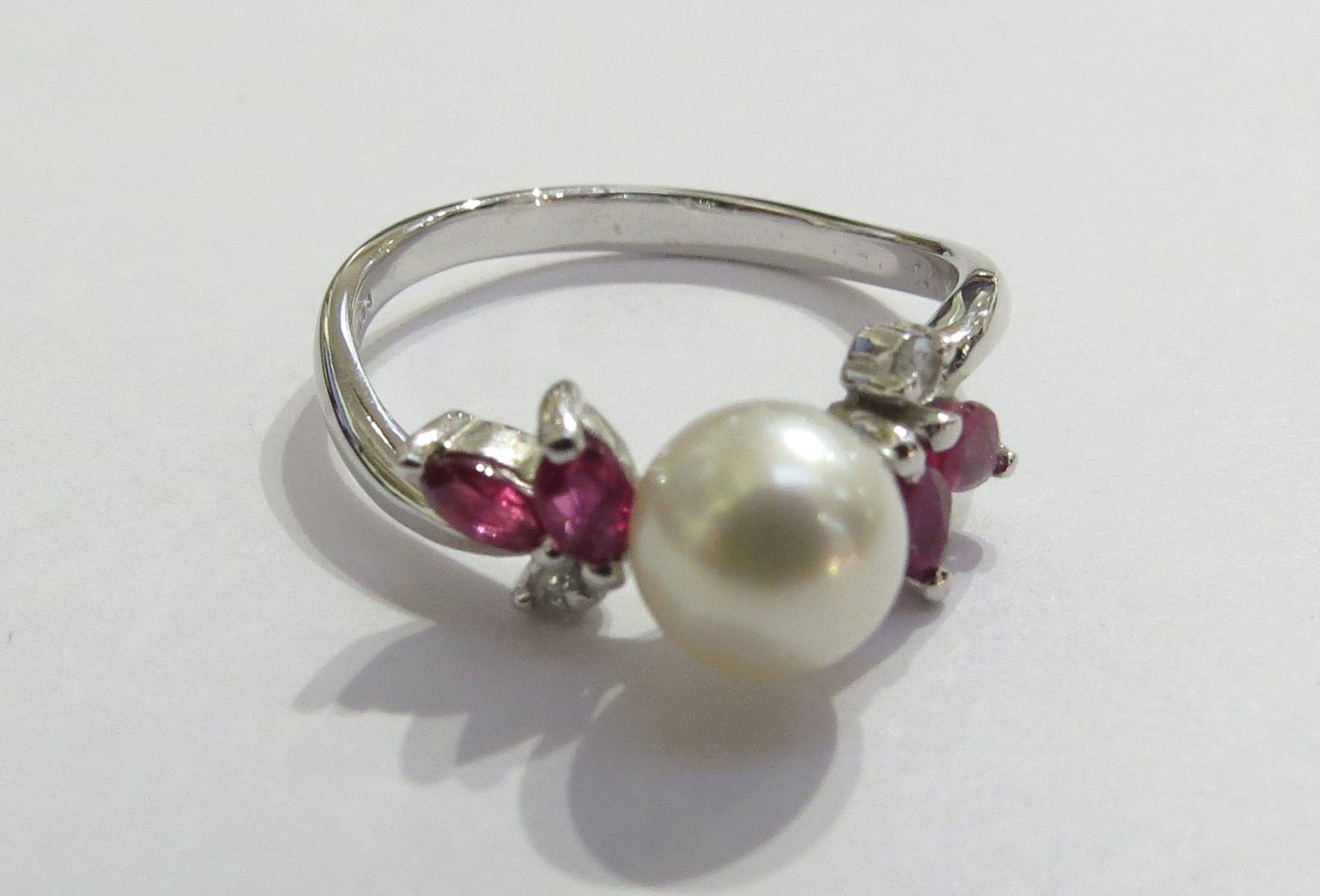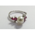 An 18ct white gold pearl, ruby and diamond ring. Size M, 2.8g
