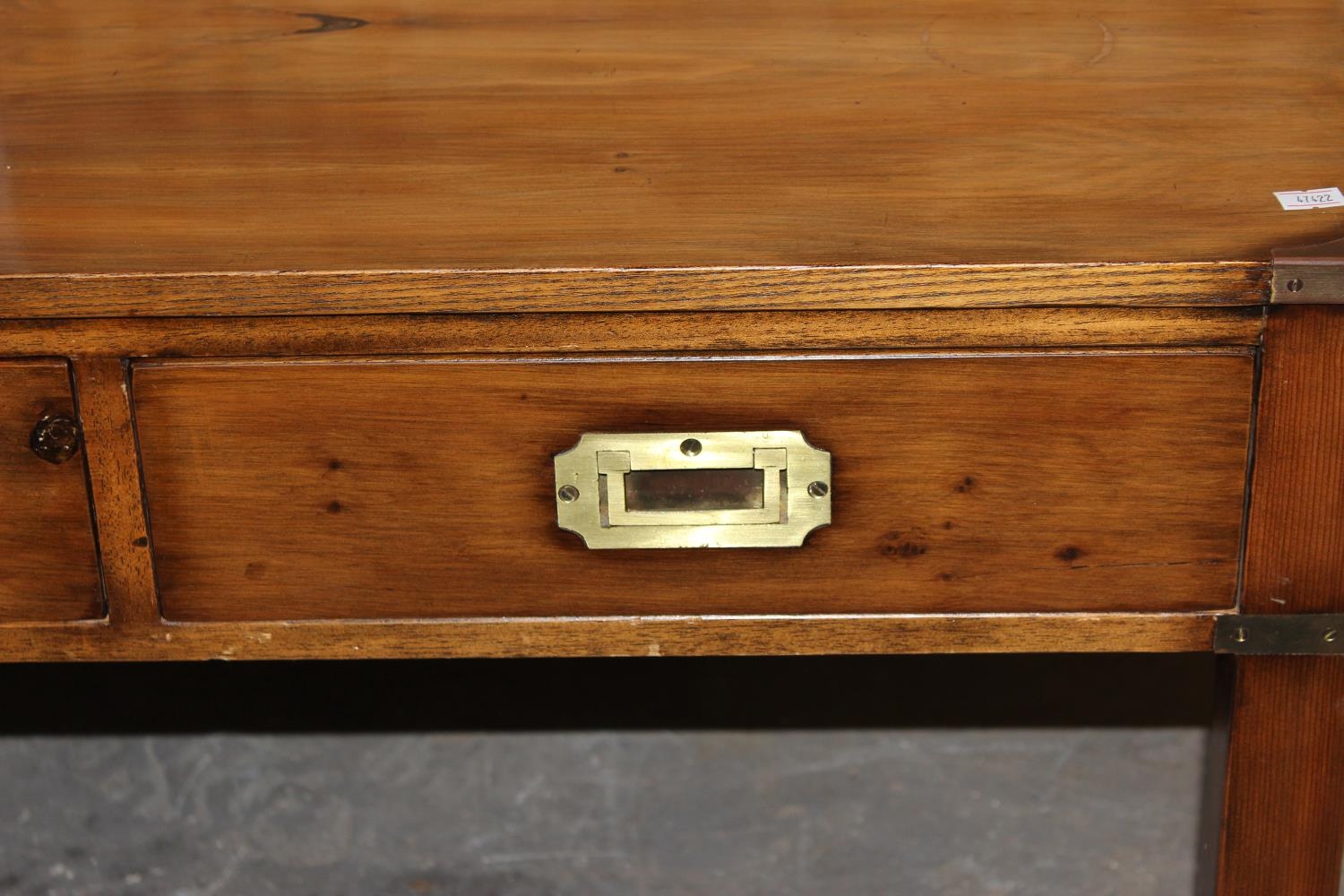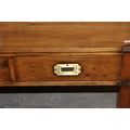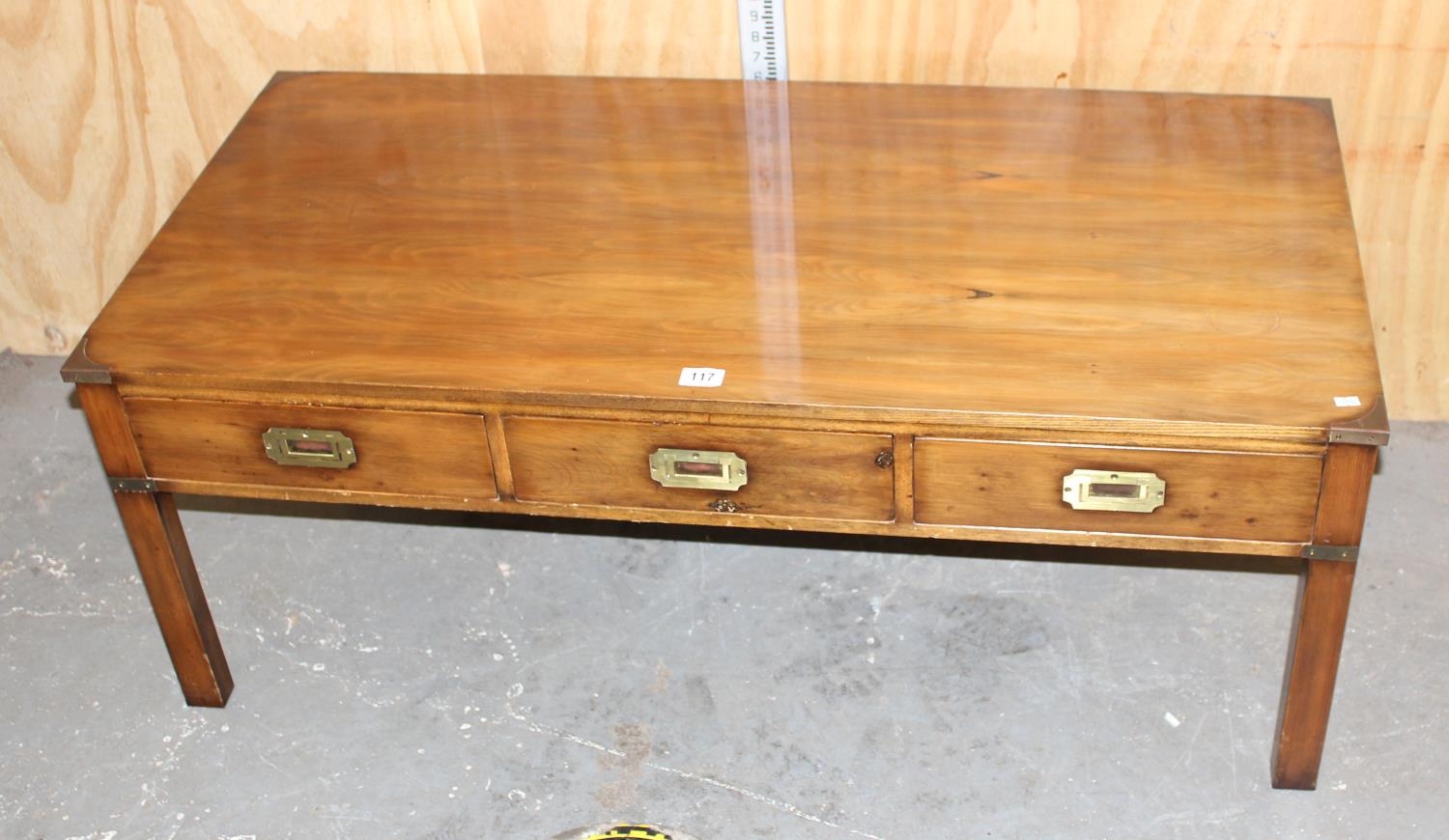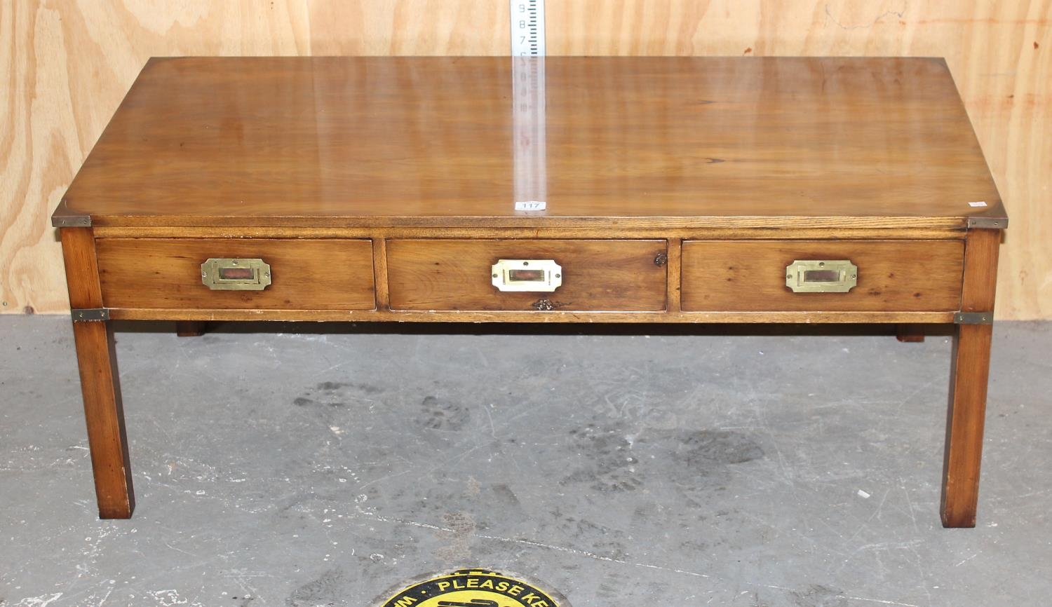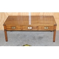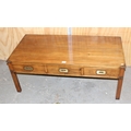 A modern polished wooden coffee table with campaign style brass handles and corners