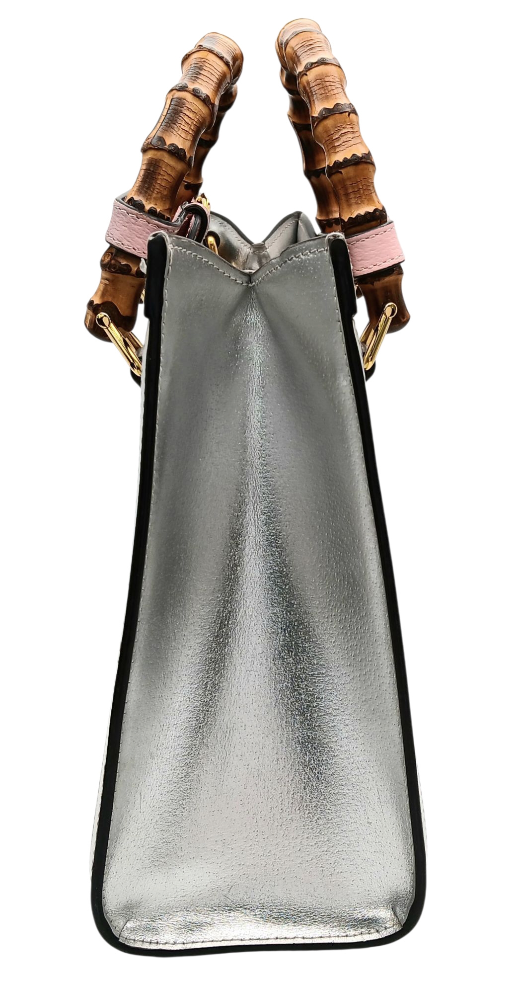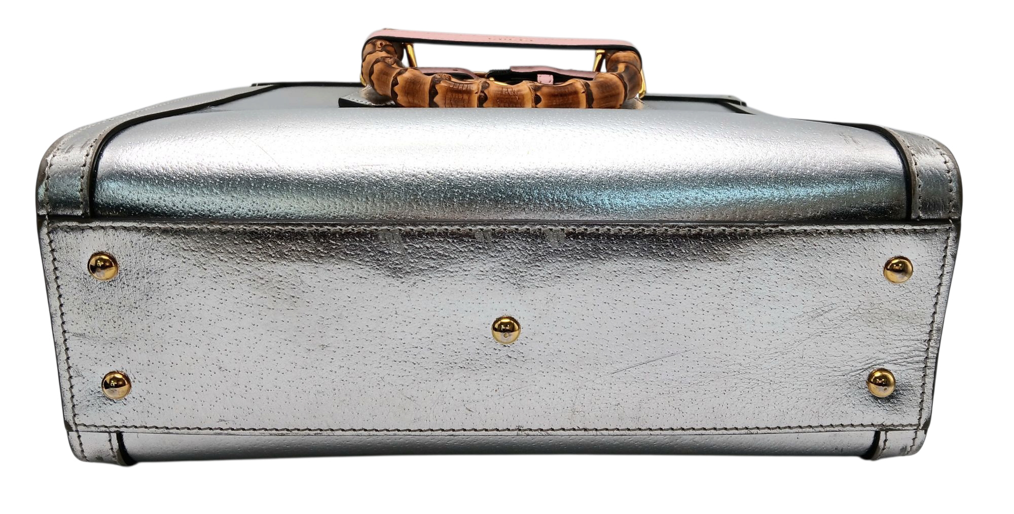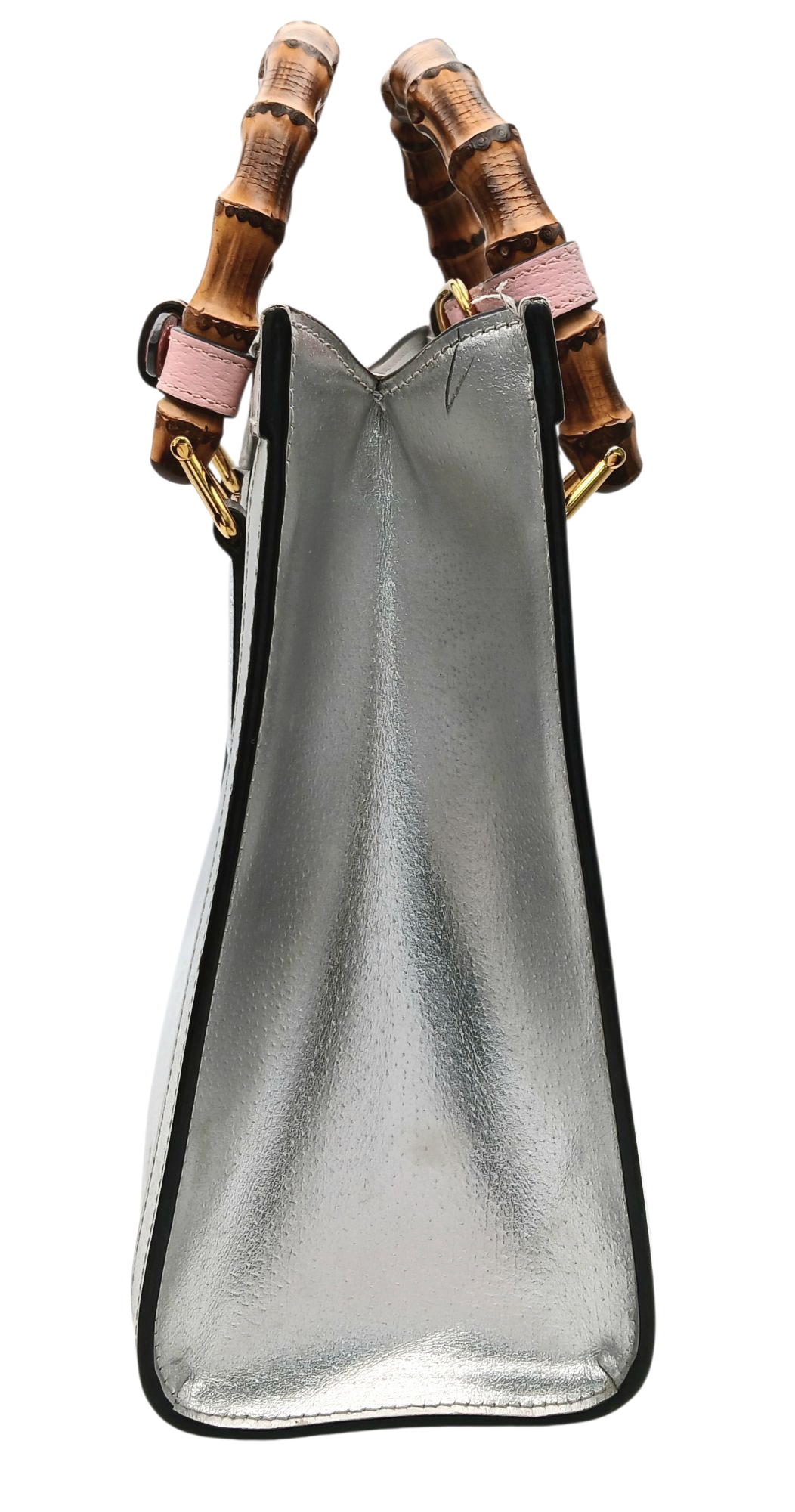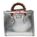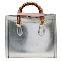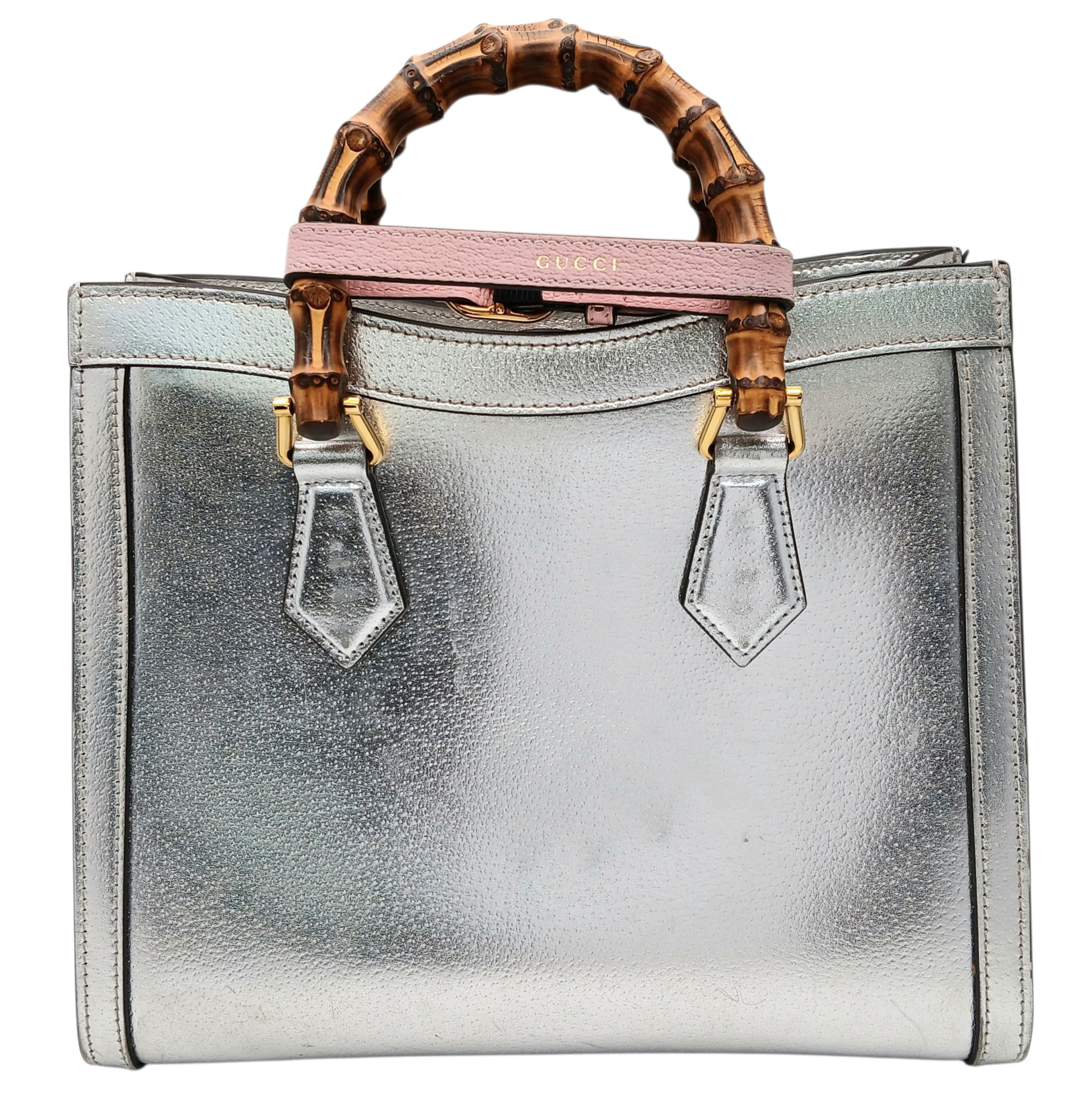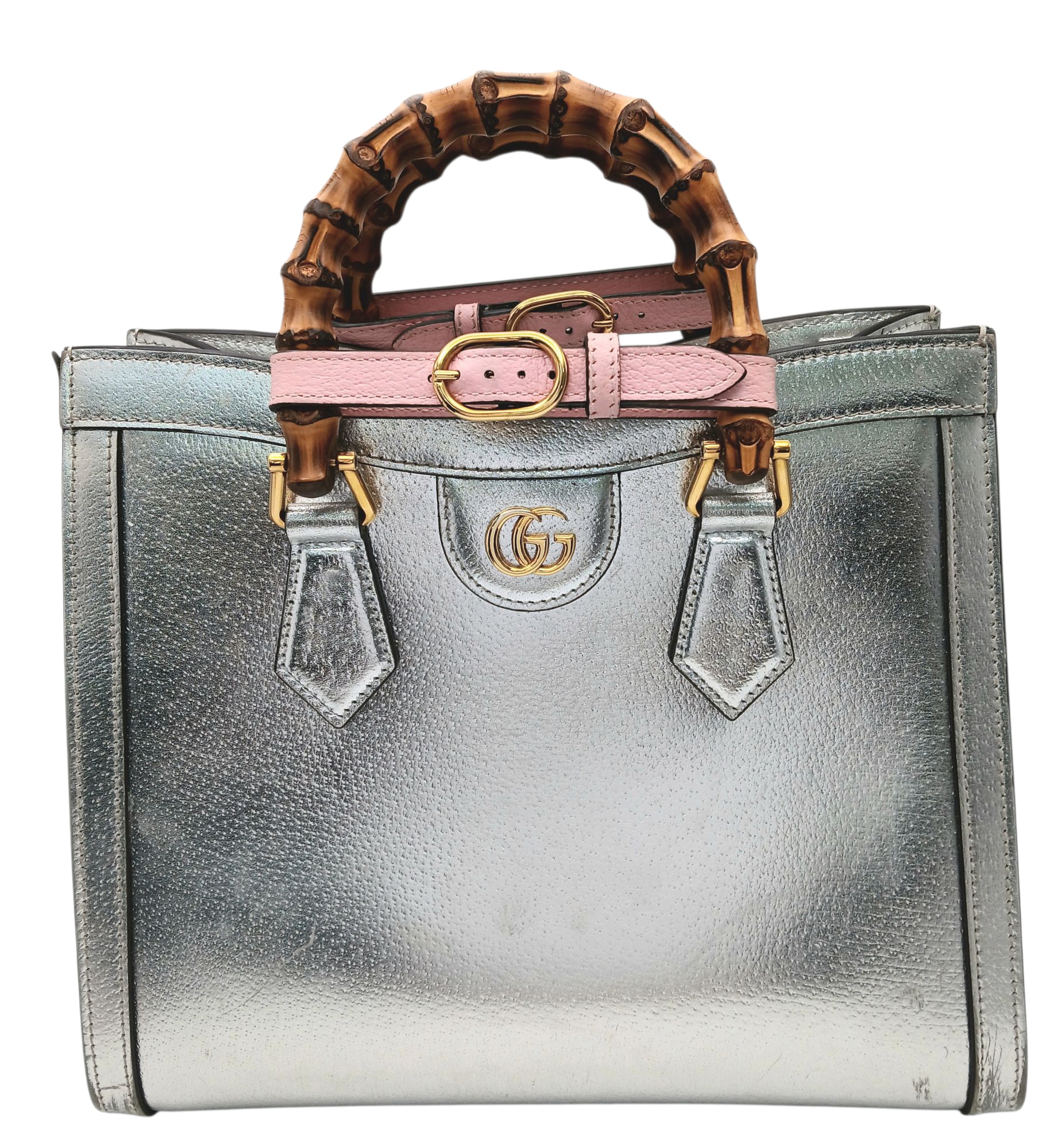 A Gucci Diana Metallic Silver Leather Bamboo Handle Tote Bag. Metallic silver leather exterior with gold-toned hardware, dual bamboo top handles, magnetic snap closure and removable pink leather belt details. Beigh textile interior features one compartment with an opened slip pocket. Comes with a detachable shoulder strap and Gucci orange leather belts. Some signs of wear including creasing, scratches to leather, and minor scuffs exterior and interior. Approx 26cm width x 23cm height x 11cm depth. Please see photos or request a condition report. Ref: STK022985
