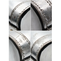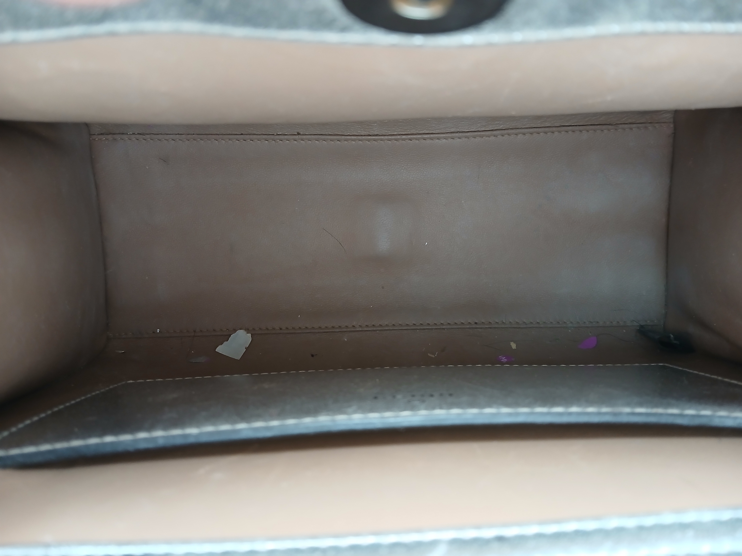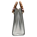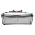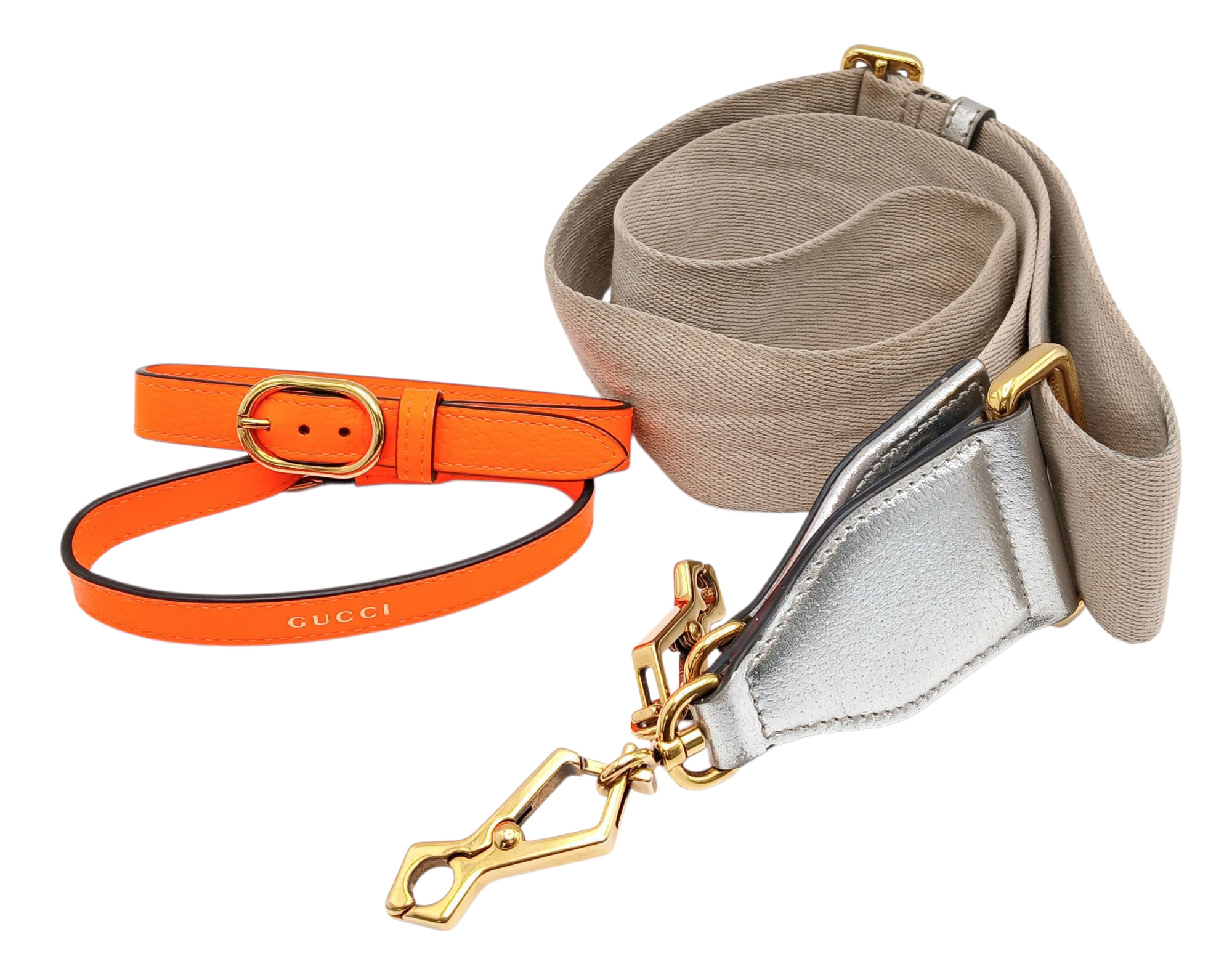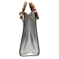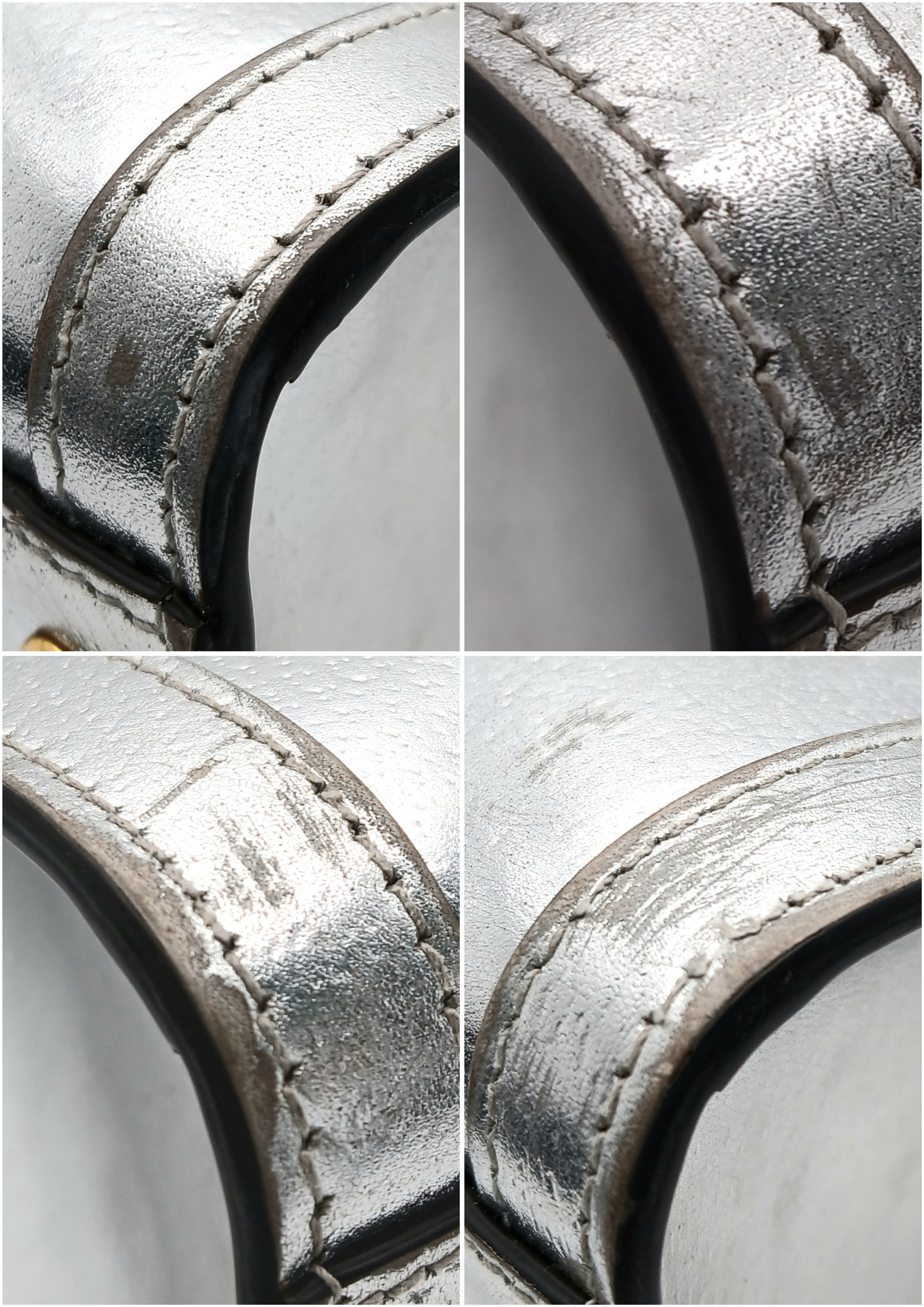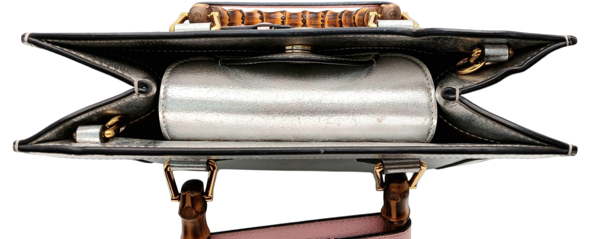 A Gucci Diana Metallic Silver Leather Bamboo Handle Tote Bag. Metallic silver leather exterior with gold-toned hardware, dual bamboo top handles, magnetic snap closure and removable pink leather belt details. Beigh textile interior features one compartment with an opened slip pocket. Comes with a detachable shoulder strap and Gucci orange leather belts. Some signs of wear including creasing, scratches to leather, and minor scuffs exterior and interior. Approx 26cm width x 23cm height x 11cm depth. Please see photos or request a condition report. Ref: STK022985