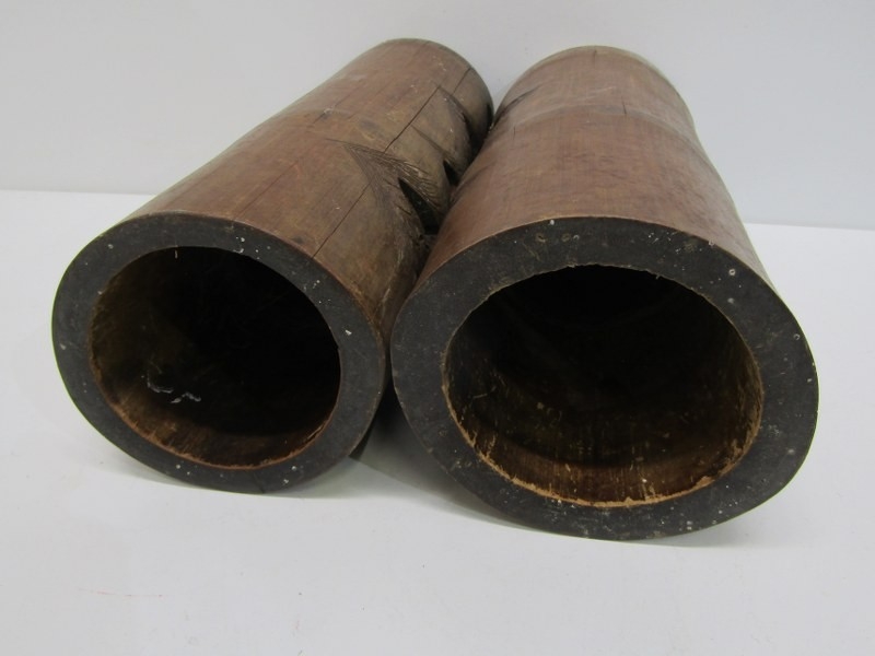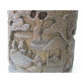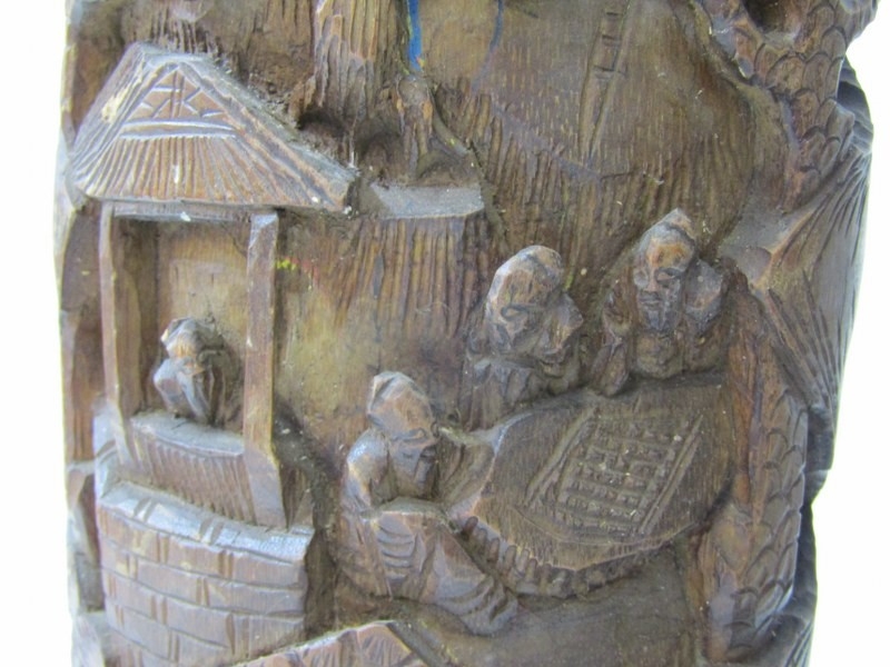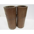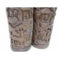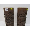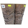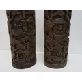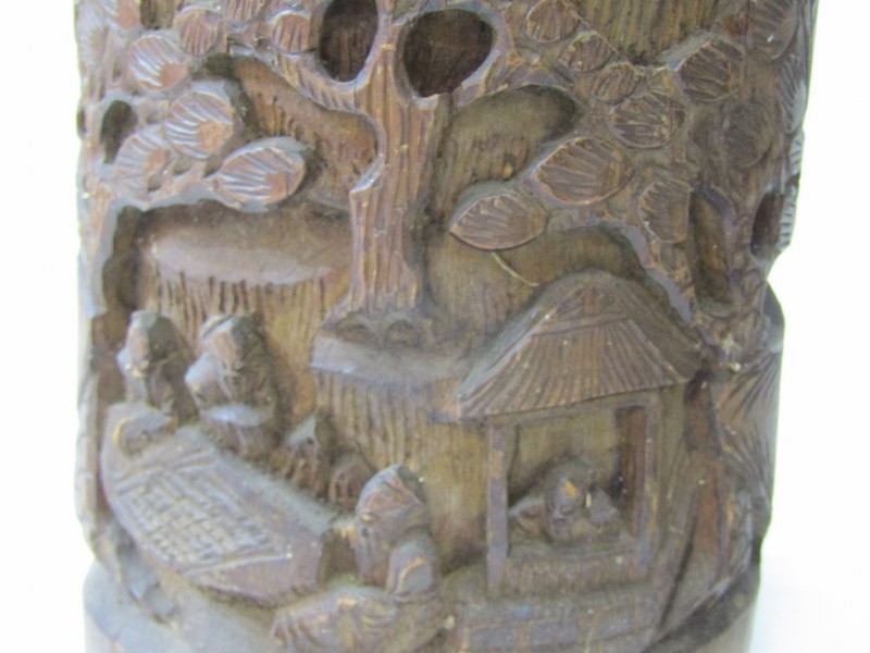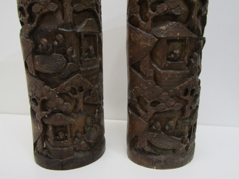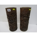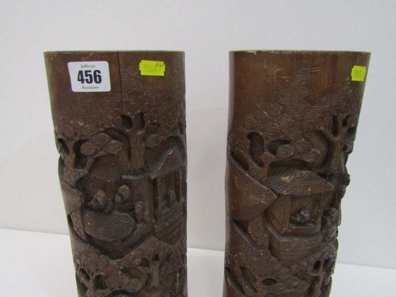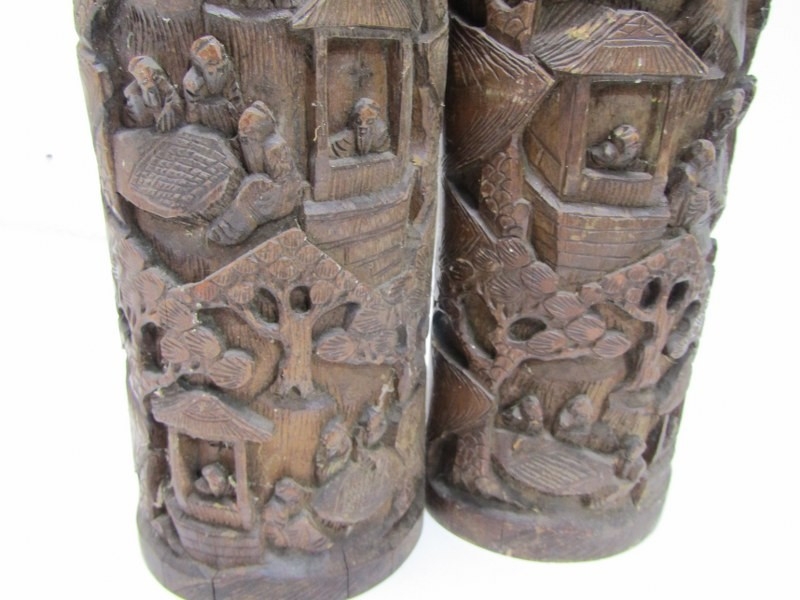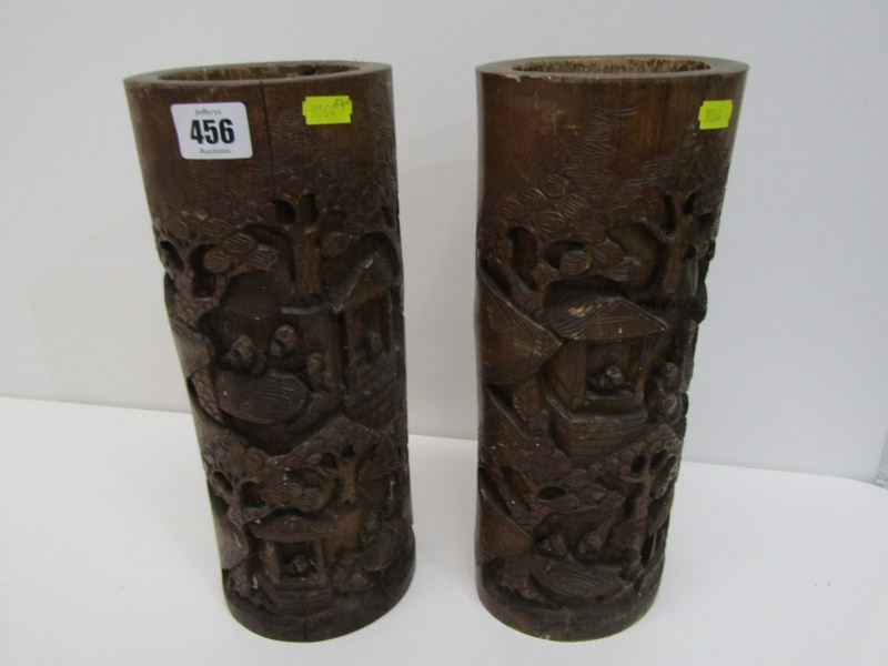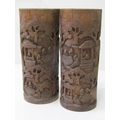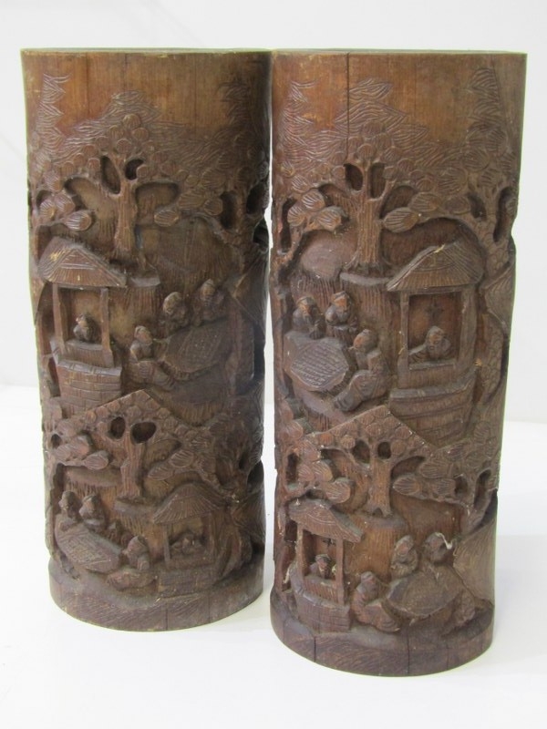 ORIENTAL BRUSH POTS, a pair of 19th Century Chinese bamboo brush pots, both ornately carved with figures in a garden landscape in relief, 30cm height