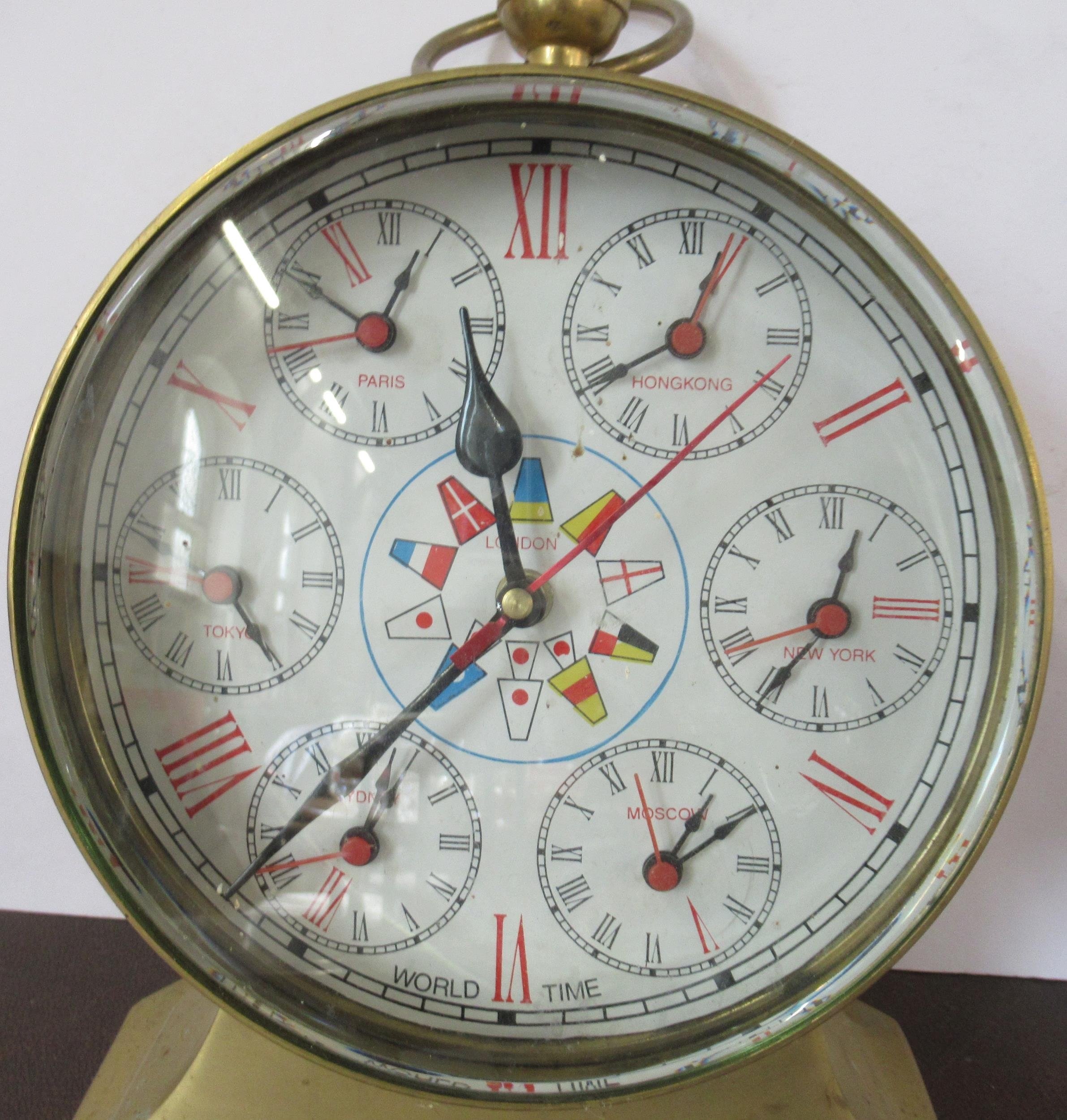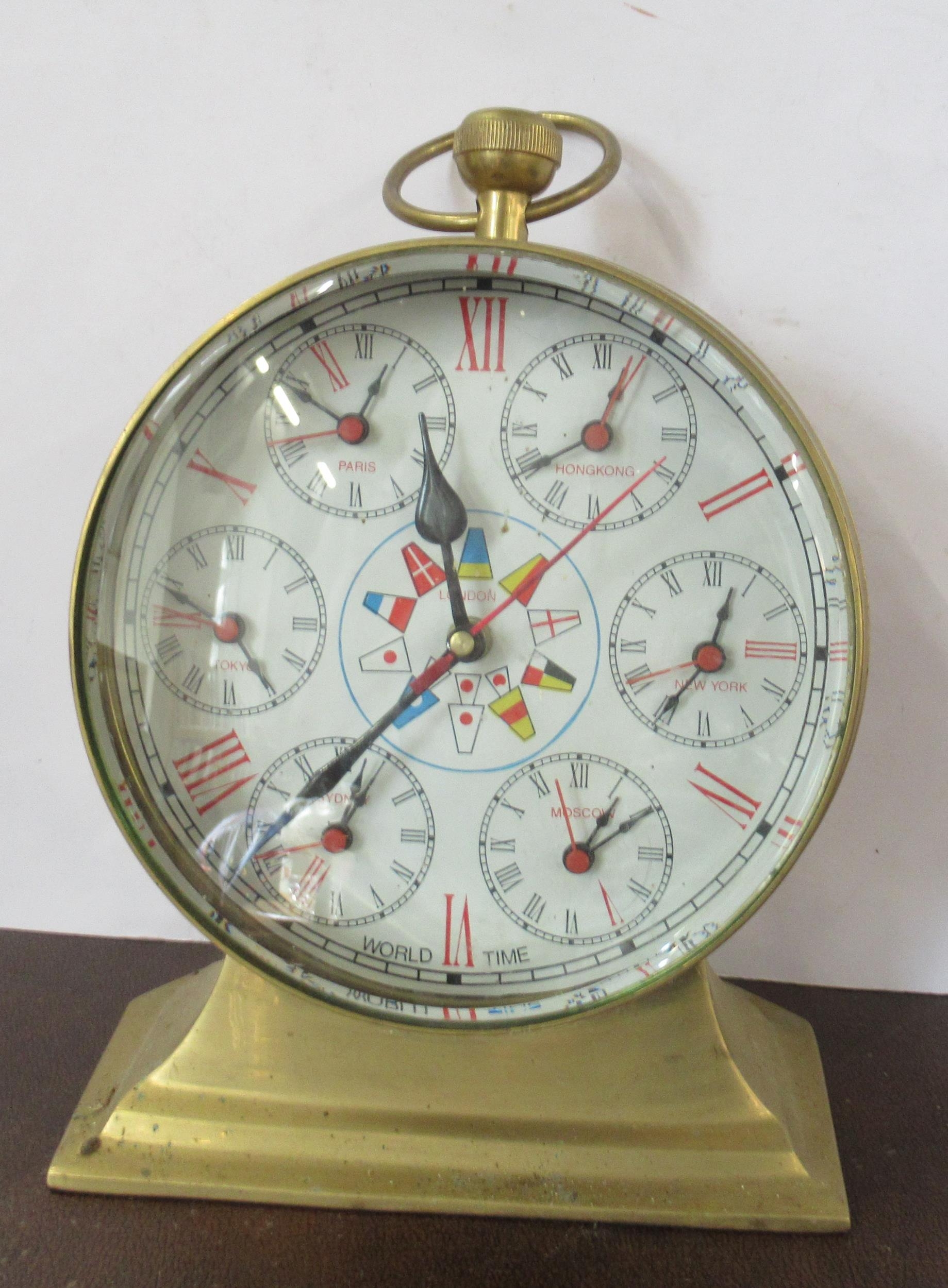 A brass cased World Time mantel clock, with Roman numerals, height 12ins