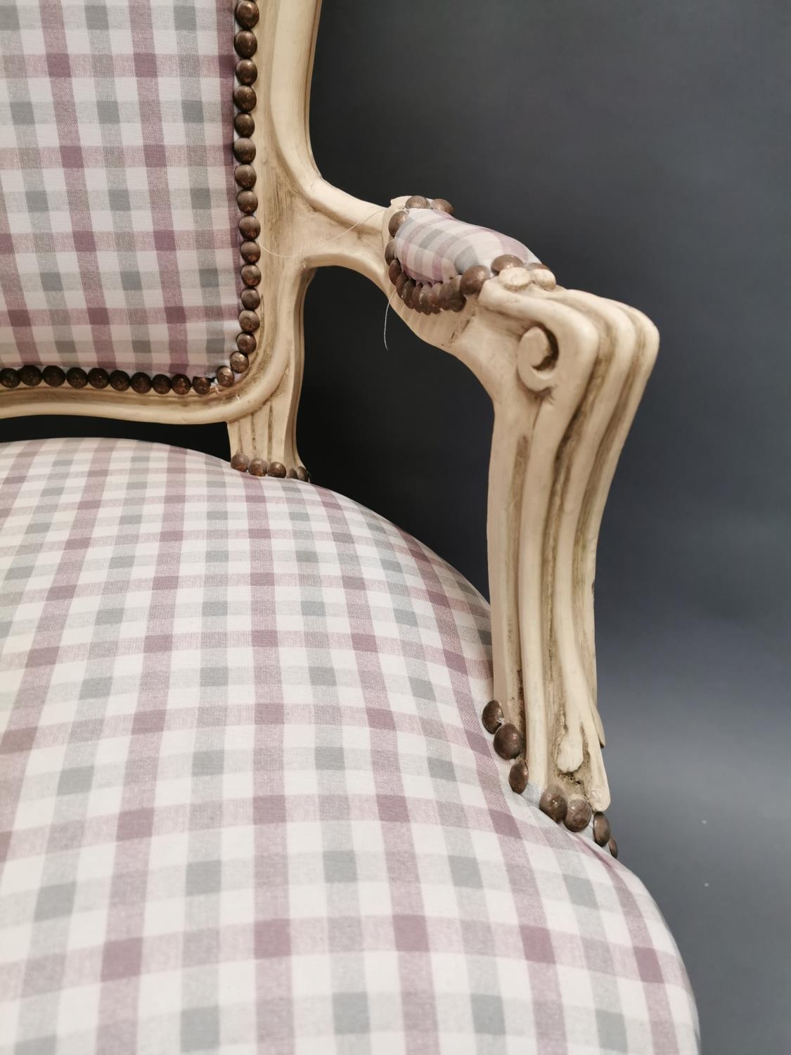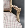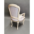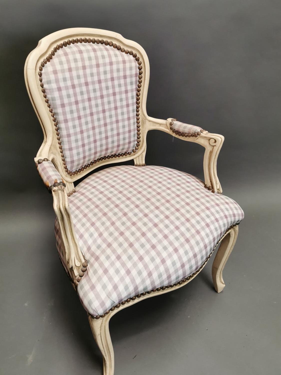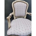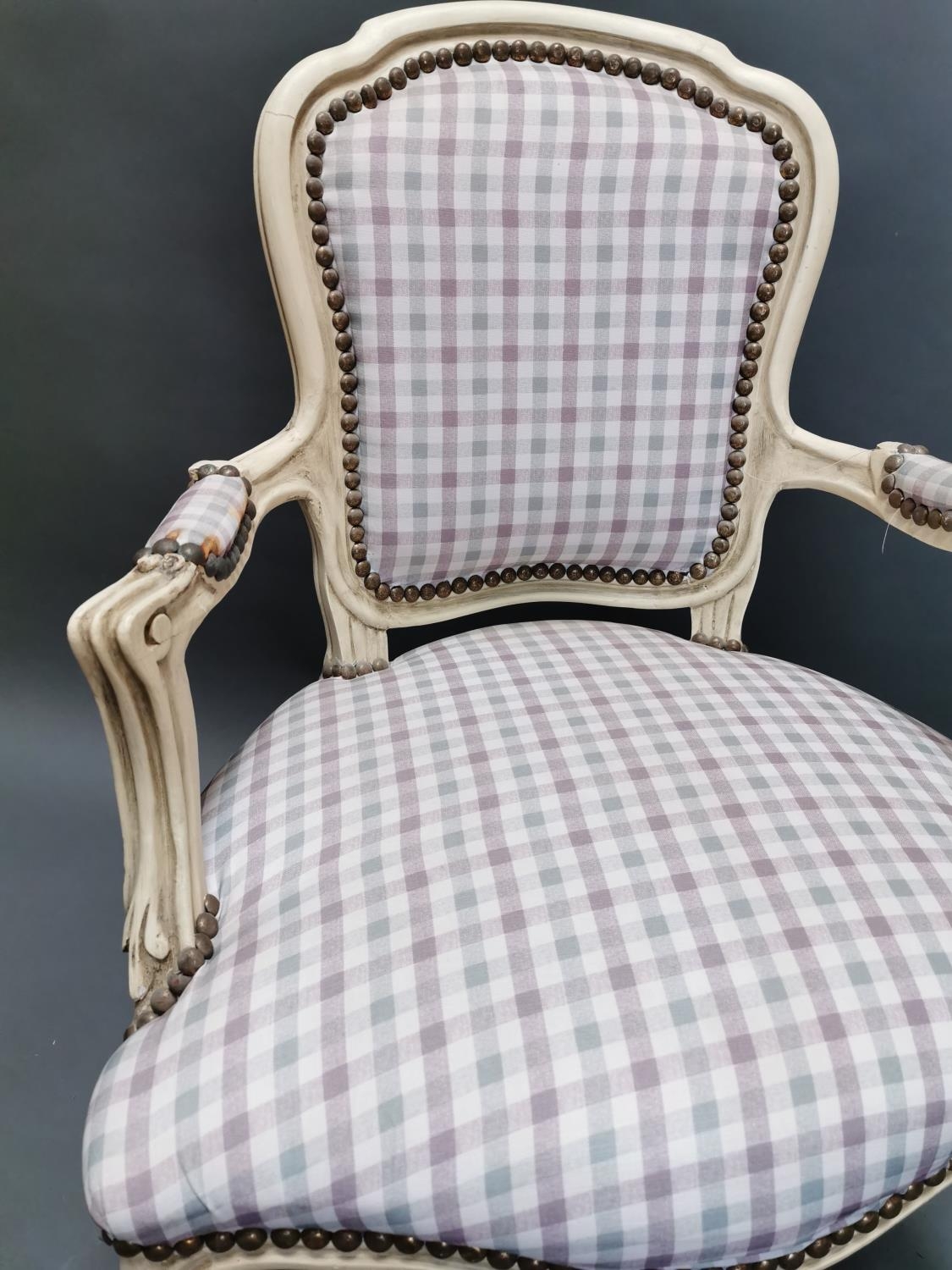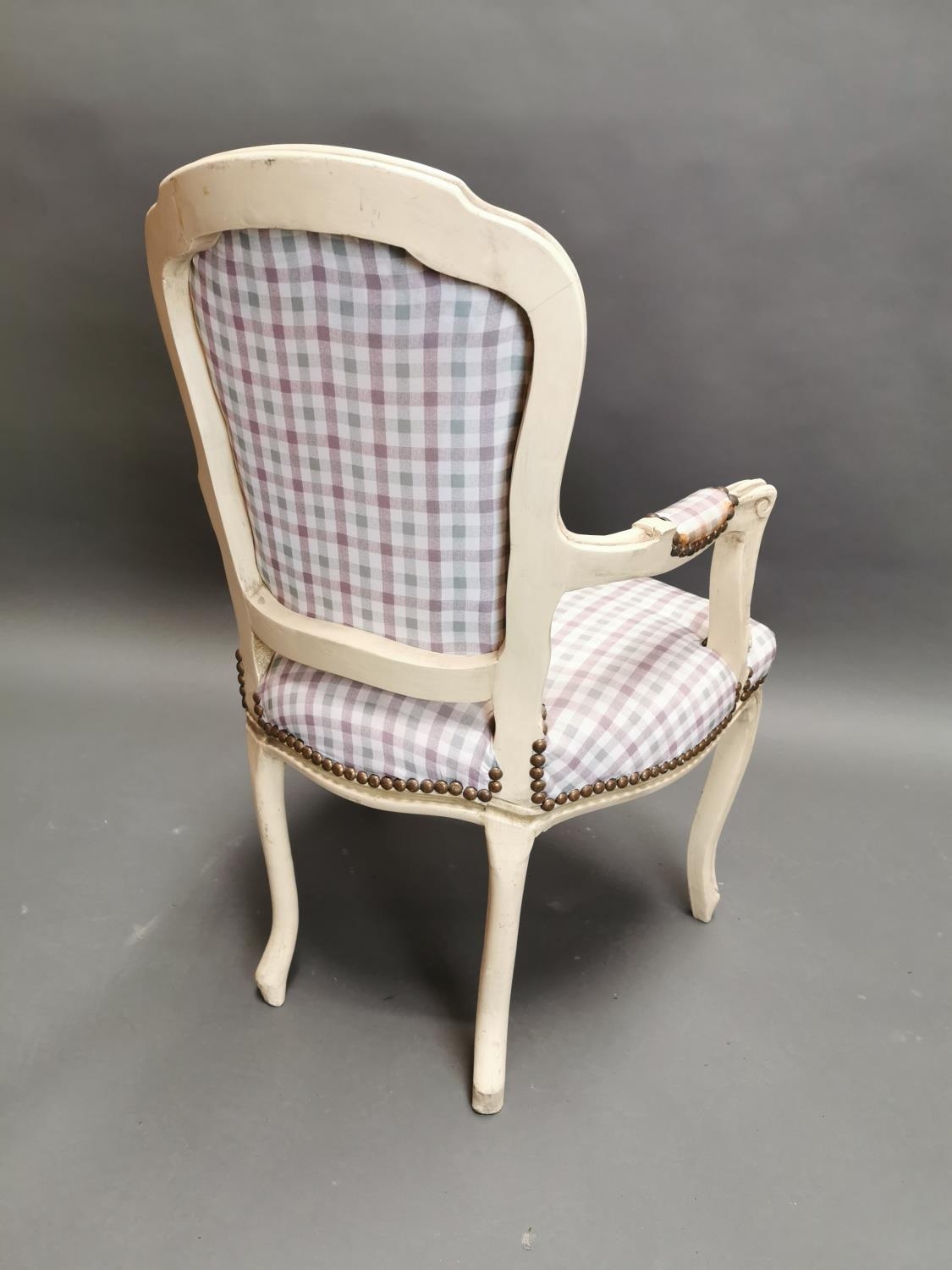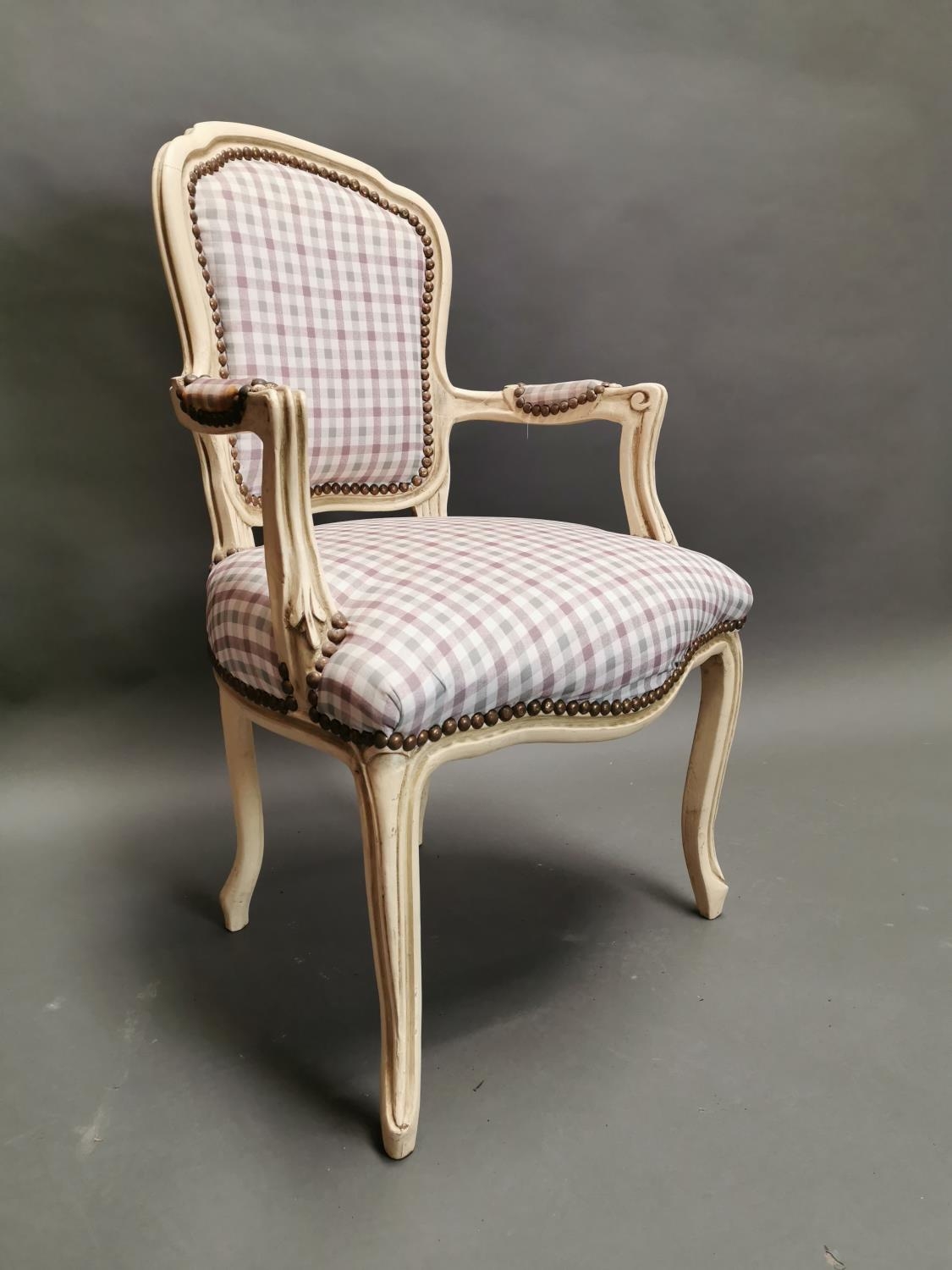 Painted pine and upholstered arm chair in the French style {95 cm H x 61 cm W x 53 cm D}.