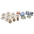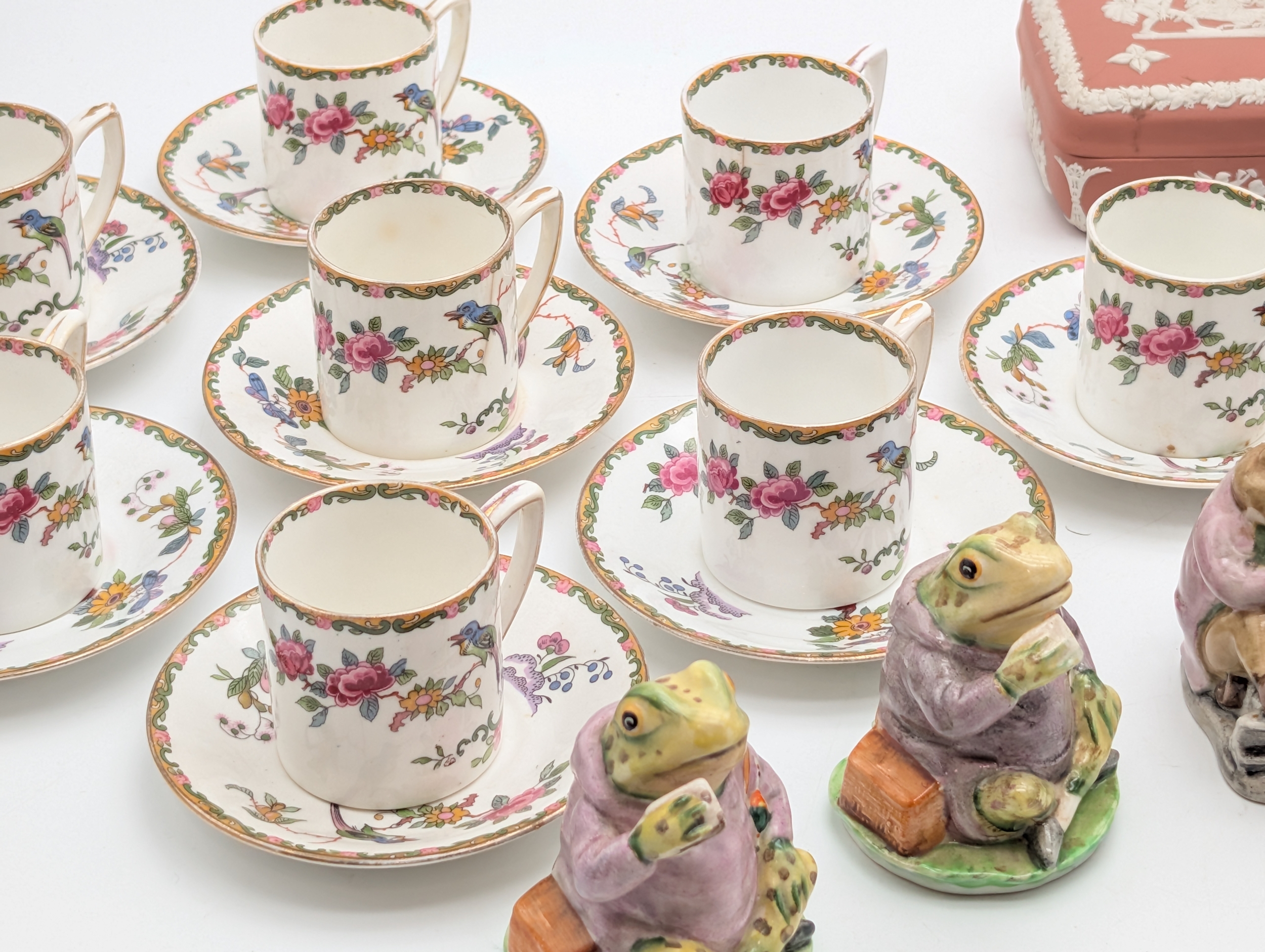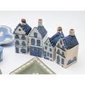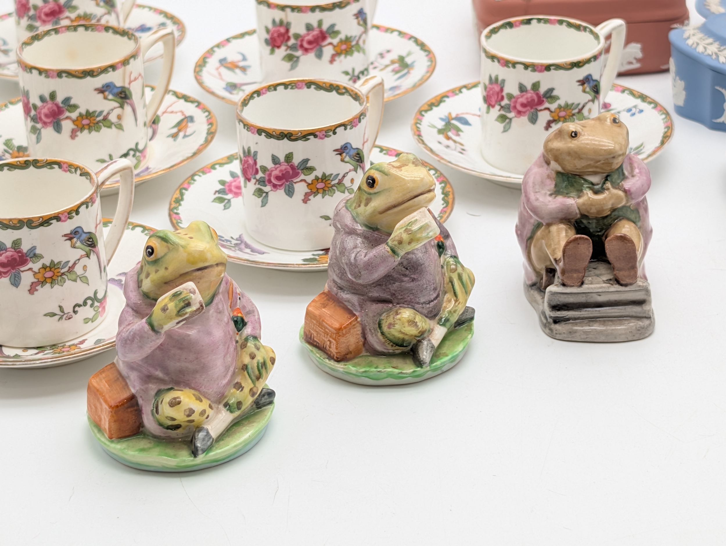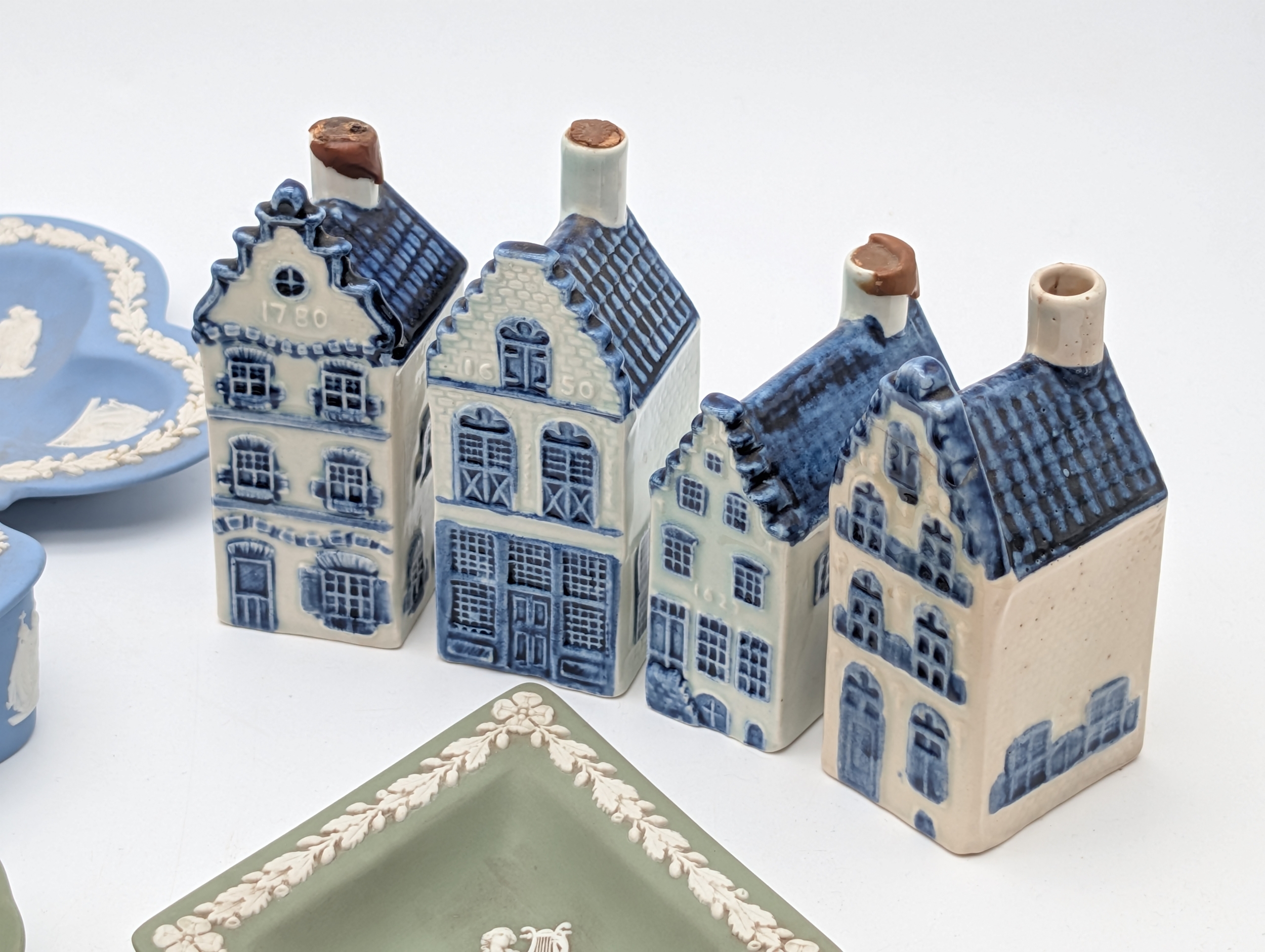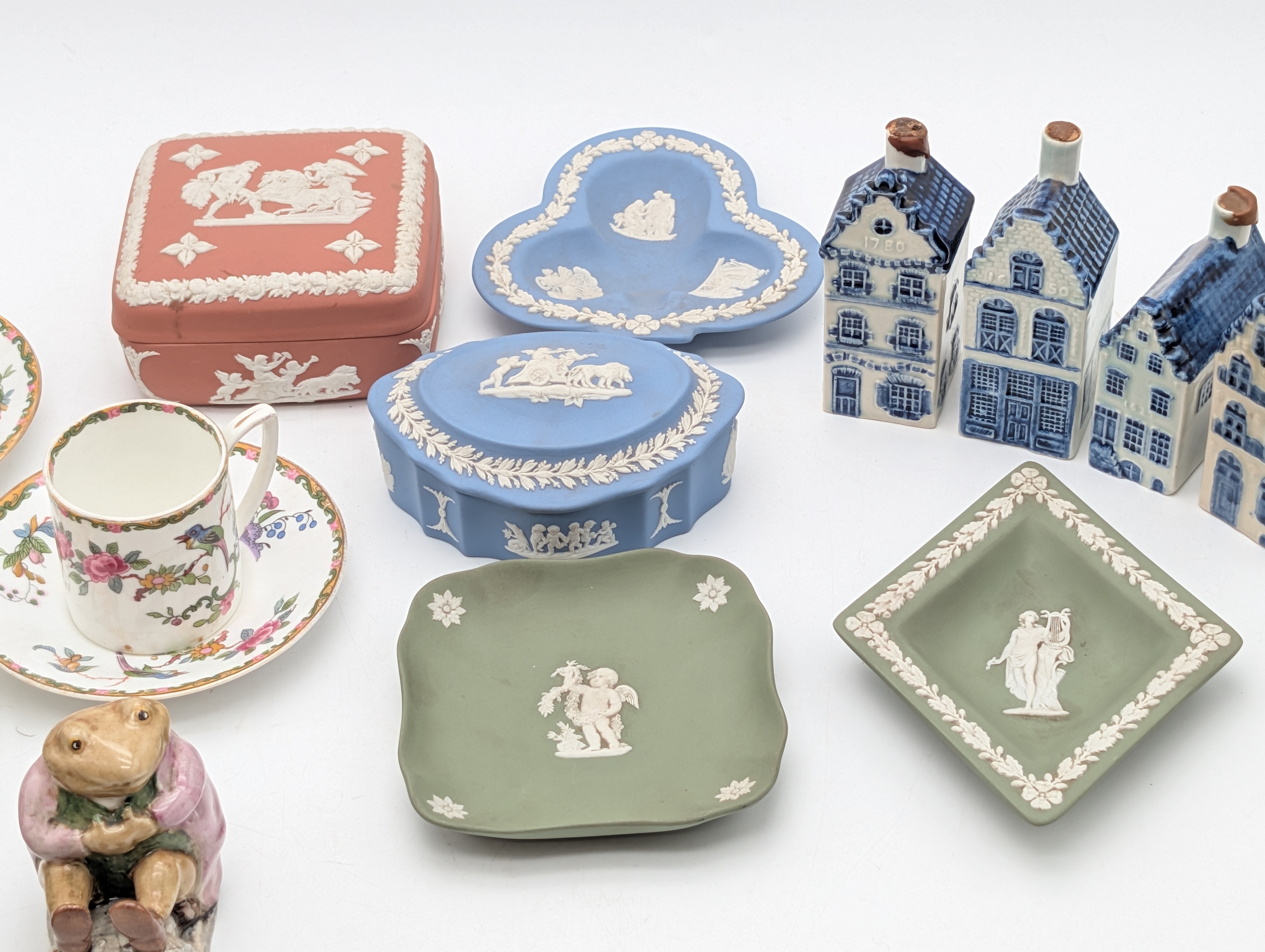 Mixed ceramics and collectables, including KLM Delft houses, Wedgwood Jasperware, Grafton China and Beatrix Potter figures Comprising a group of KLM Delft Blue miniature houses, a collection of Wedgwood Jasperware items including lidded boxes and dishes, a Grafton China coffee can and saucer set, and three Royal Albert Beatrix Potter figures. [General good condition]