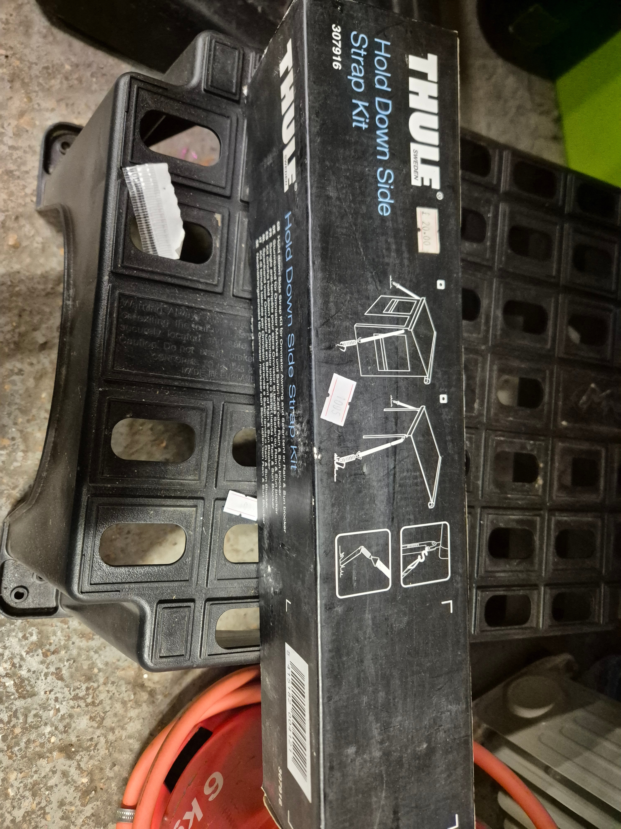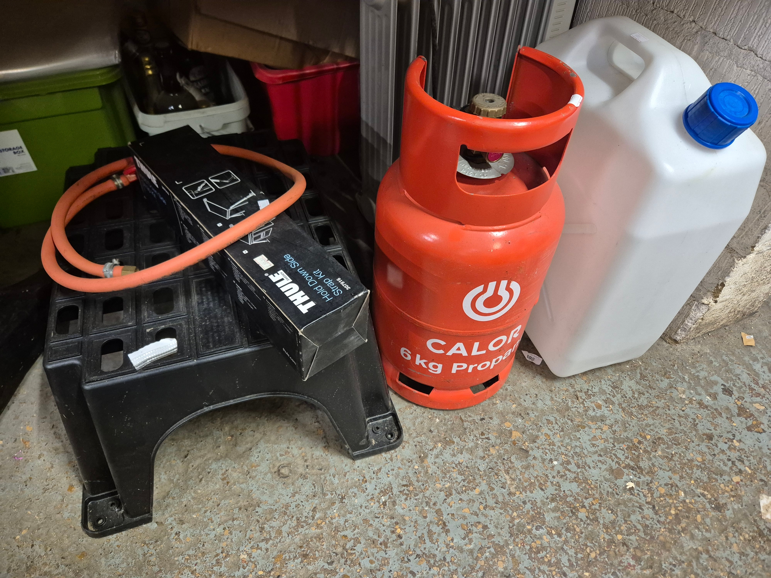Caravan lot to include gas bottle, water carrier, large step and Thule hold down side strap kit