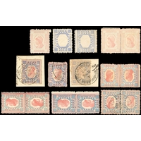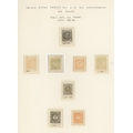 1884-88 Numerals: 1885-86 engraved imperforate die proofs for the unissued 10r value, two in the design adopted for the 50r, one for the 100r and five others similar in black or in colours, five are dated in the bottom margin