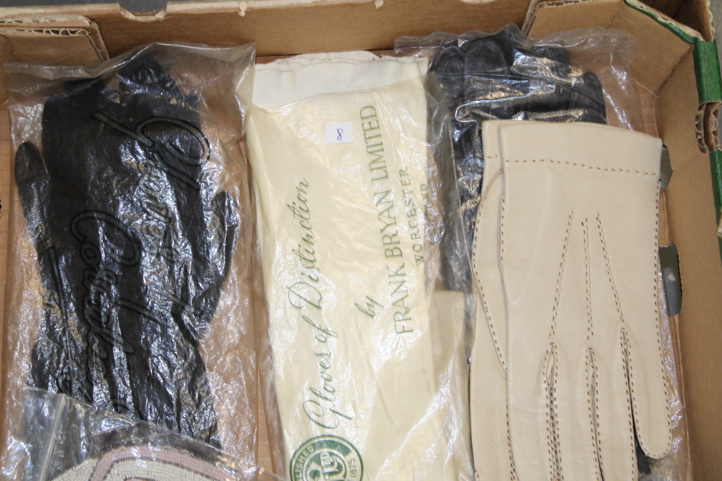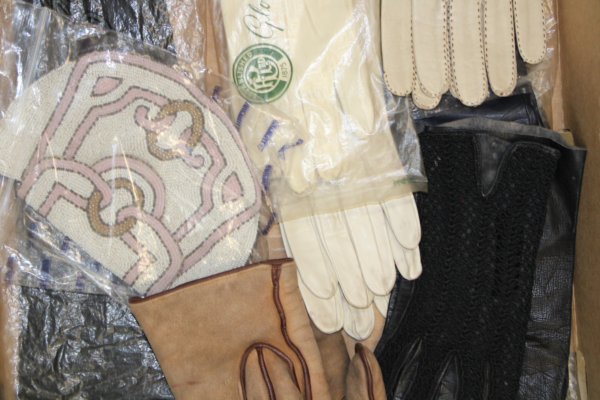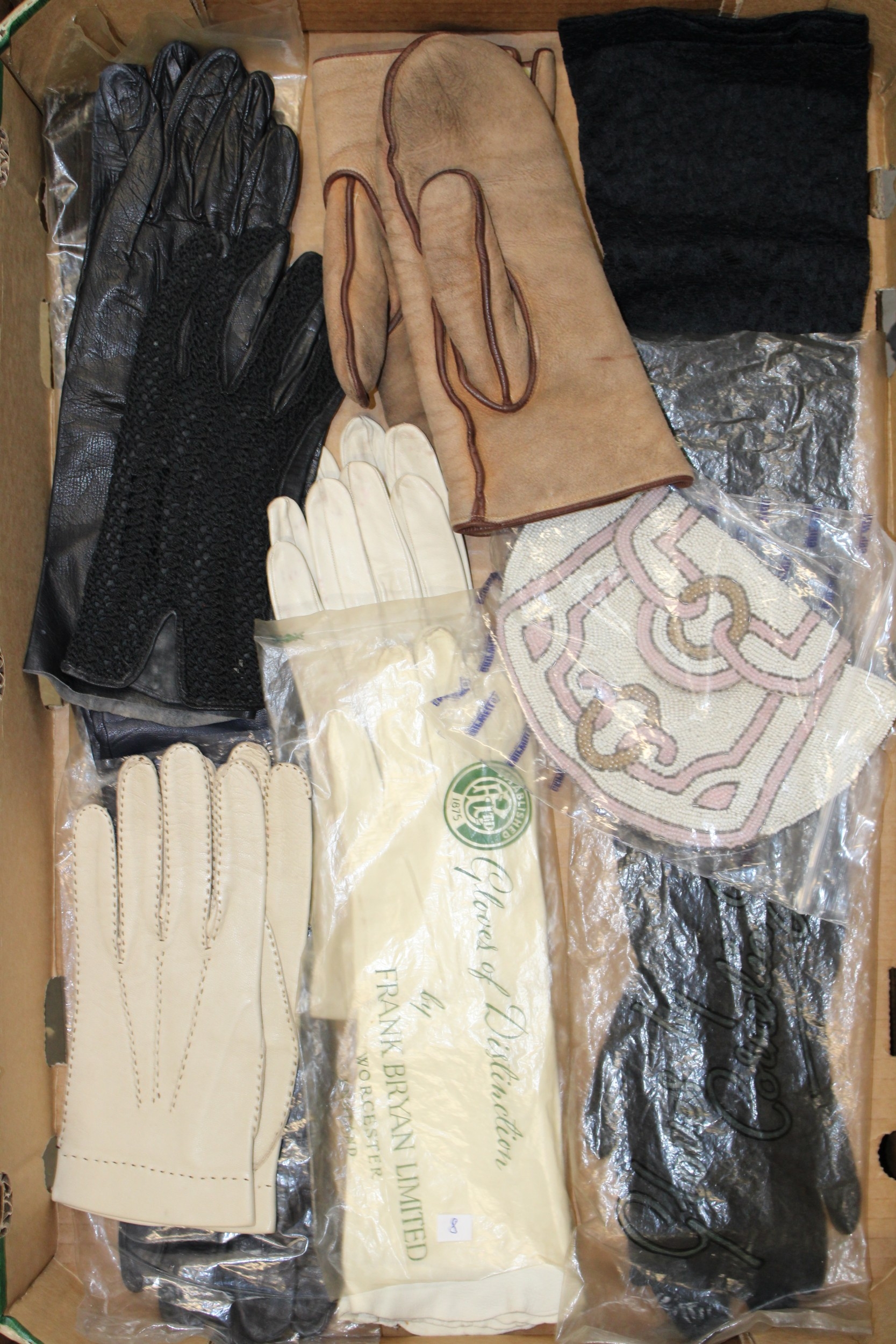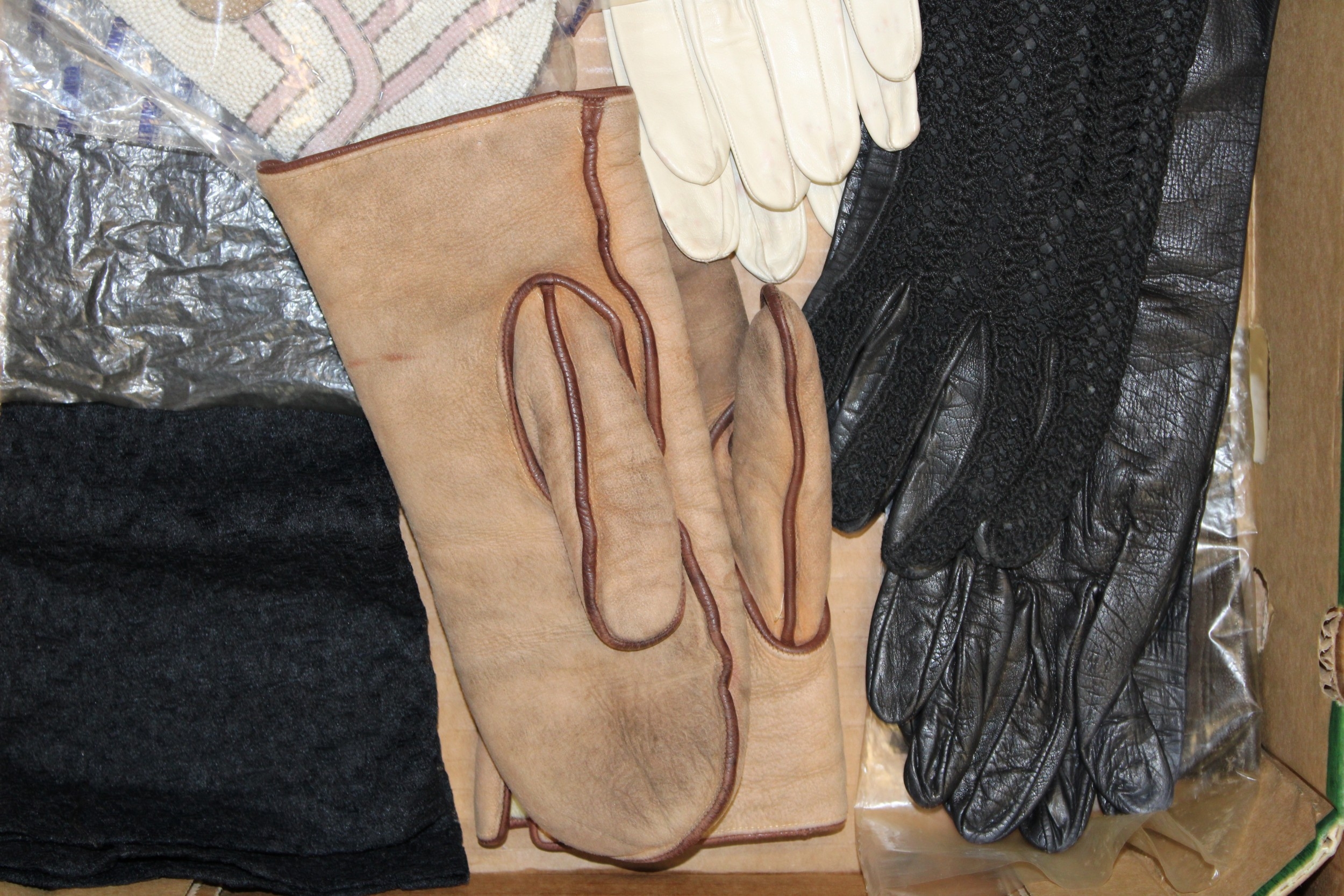 A collection of lady's gloves to include kid leather and calf skin examples together with a vintage beadwork purse, (Qty).
