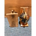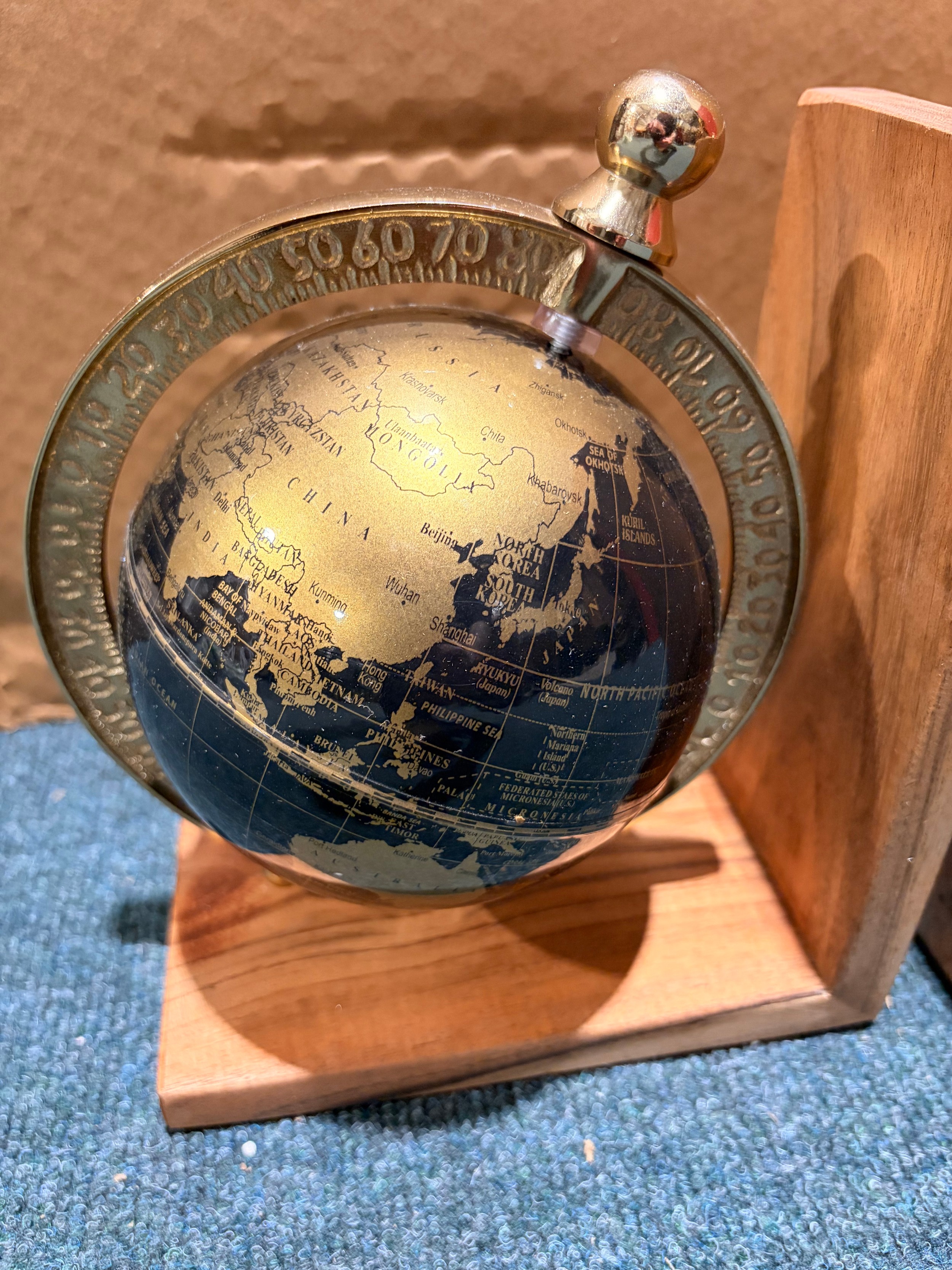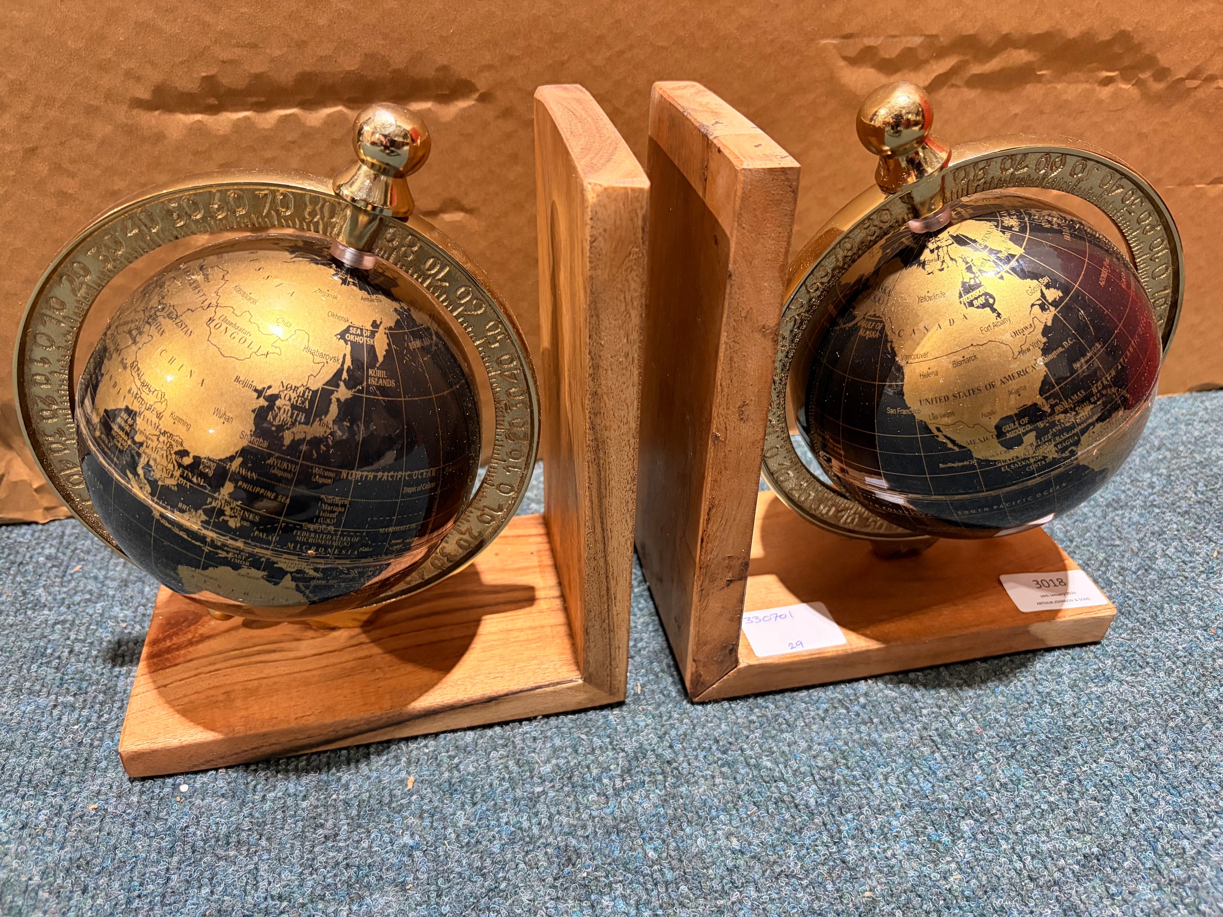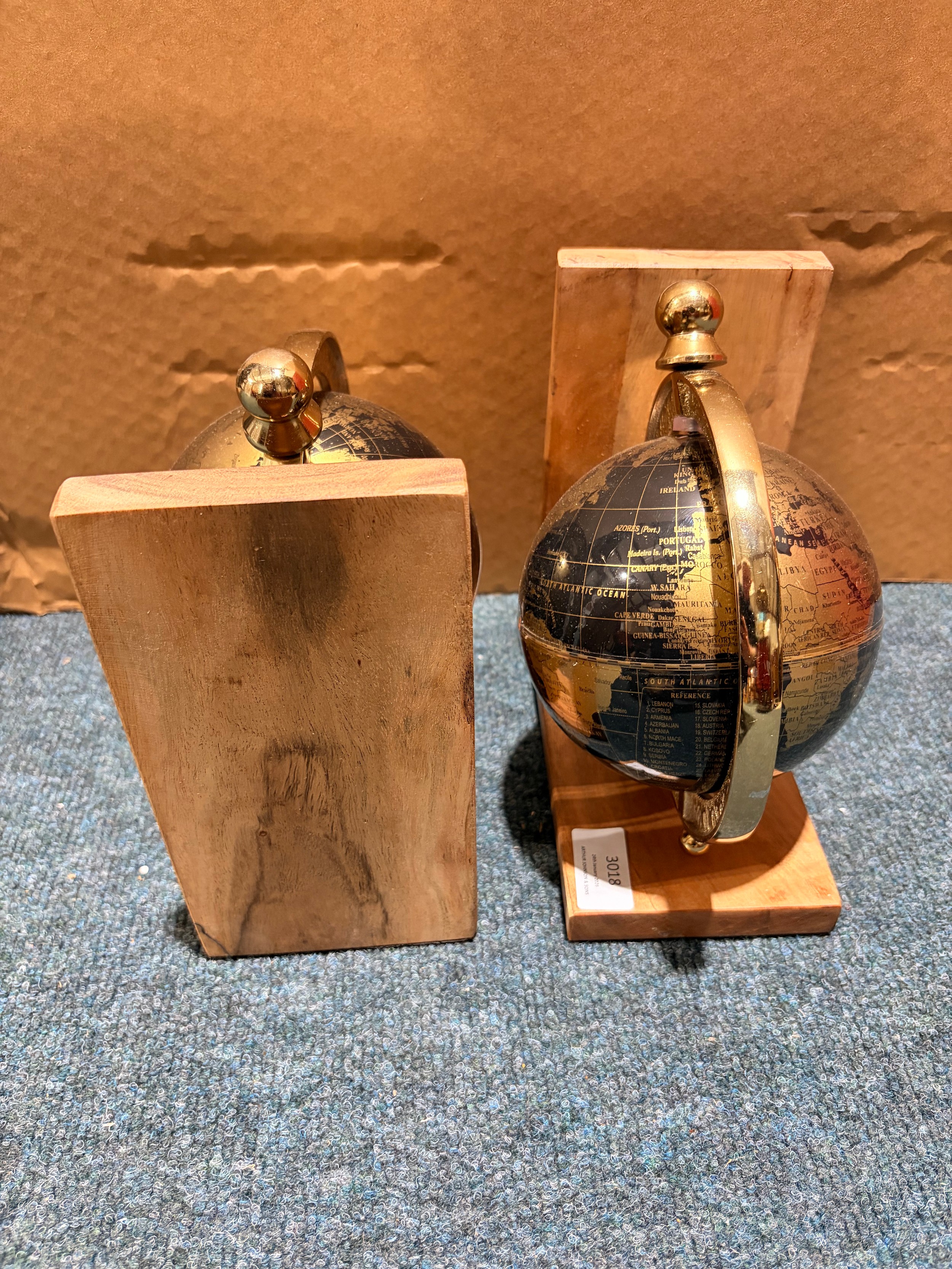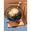 A pair of black and gold effect globe bookends