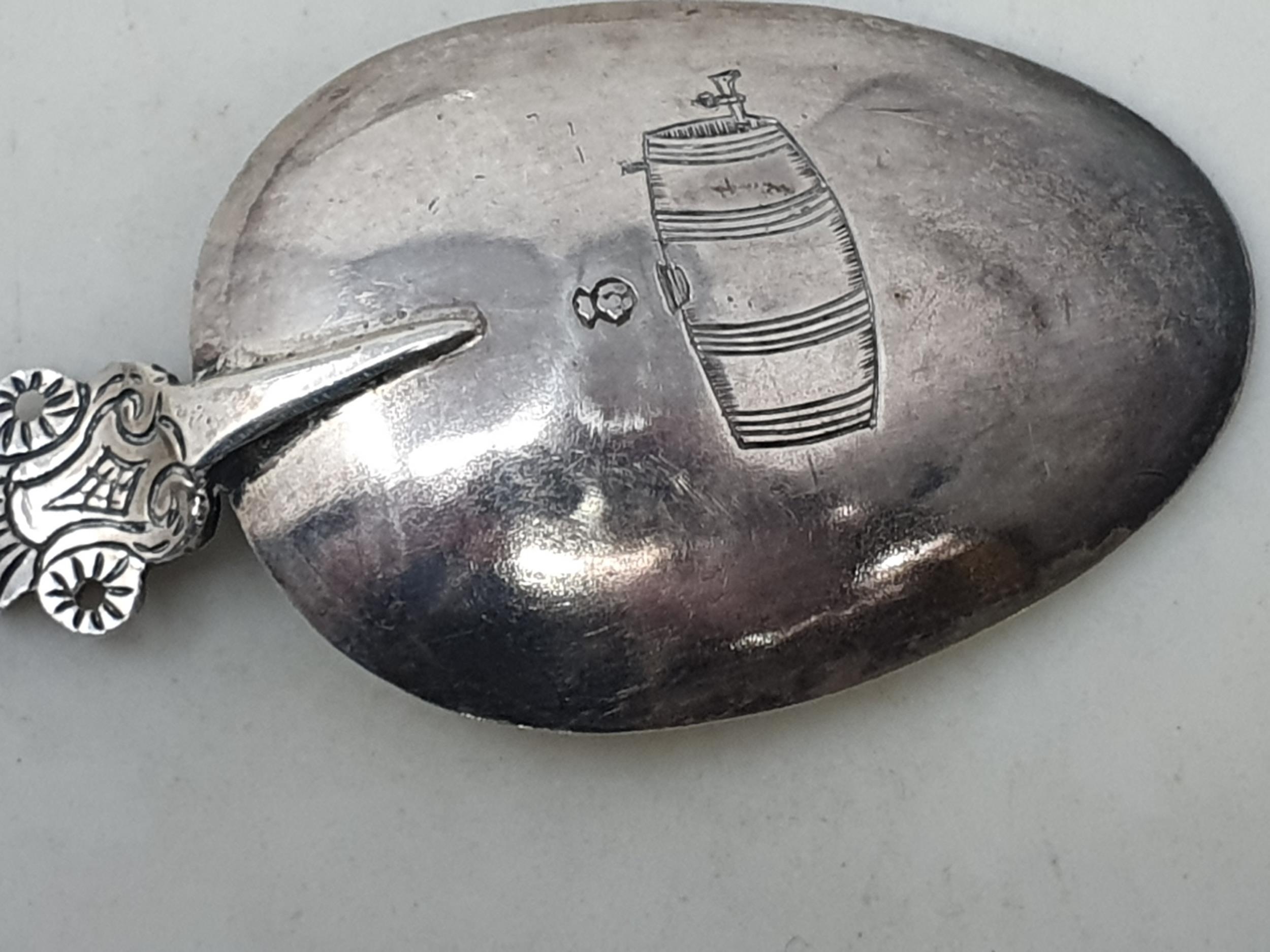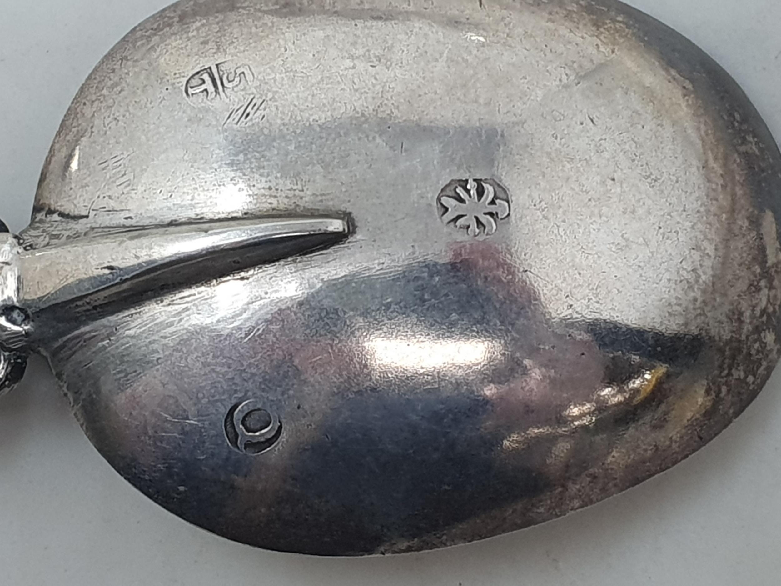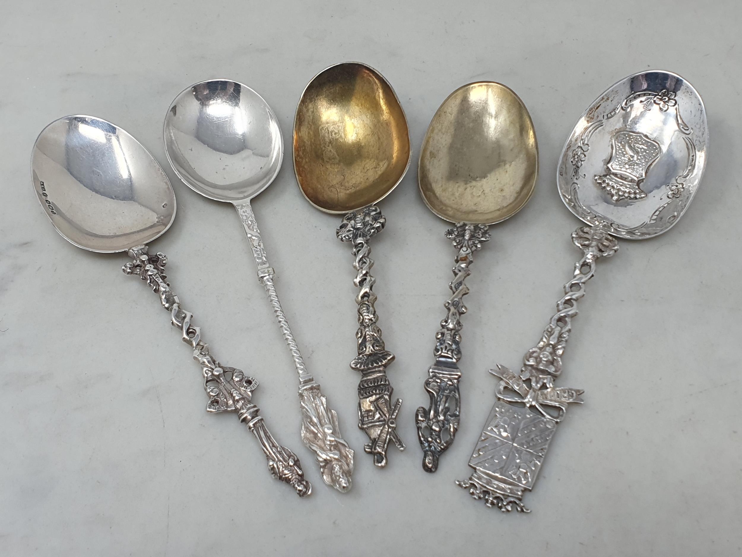 Five Continental silver Spoons with ornate stems, one with import mark Sheffield 1896, 250gms