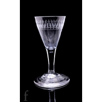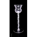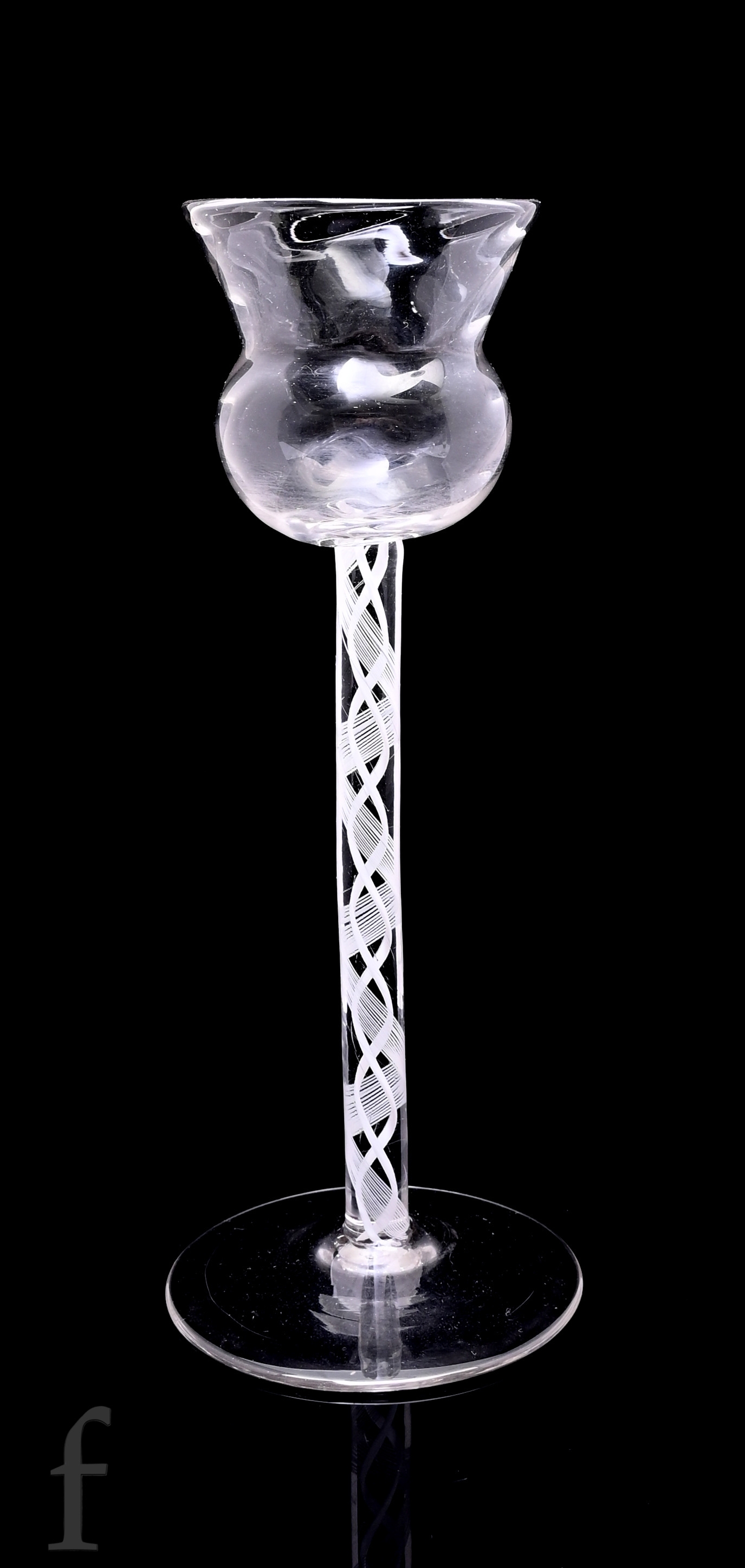 A 19th Century drinking glass, the wrythen fluted thistle bowl above a double series opaque twist stem with twelve spiral threads outside a pair of tapes, raised to a shallow conical foot, height 17cm.