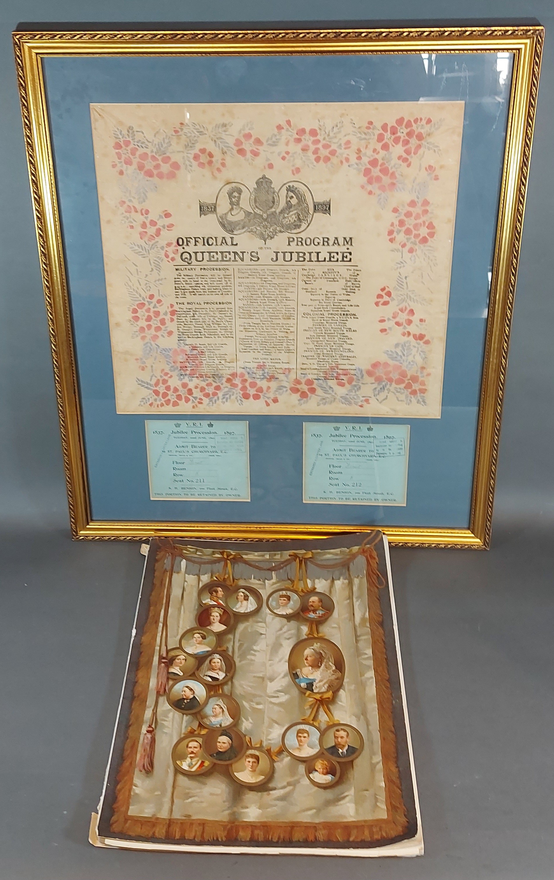 A framed Queen Victoria Jubilee programme with two tickets together with a copy of The Illustrated London News Diamond Jubilee 1897, a 1971 Pirelli calendar, six framed silk work pictures and a folio of pictures and prints