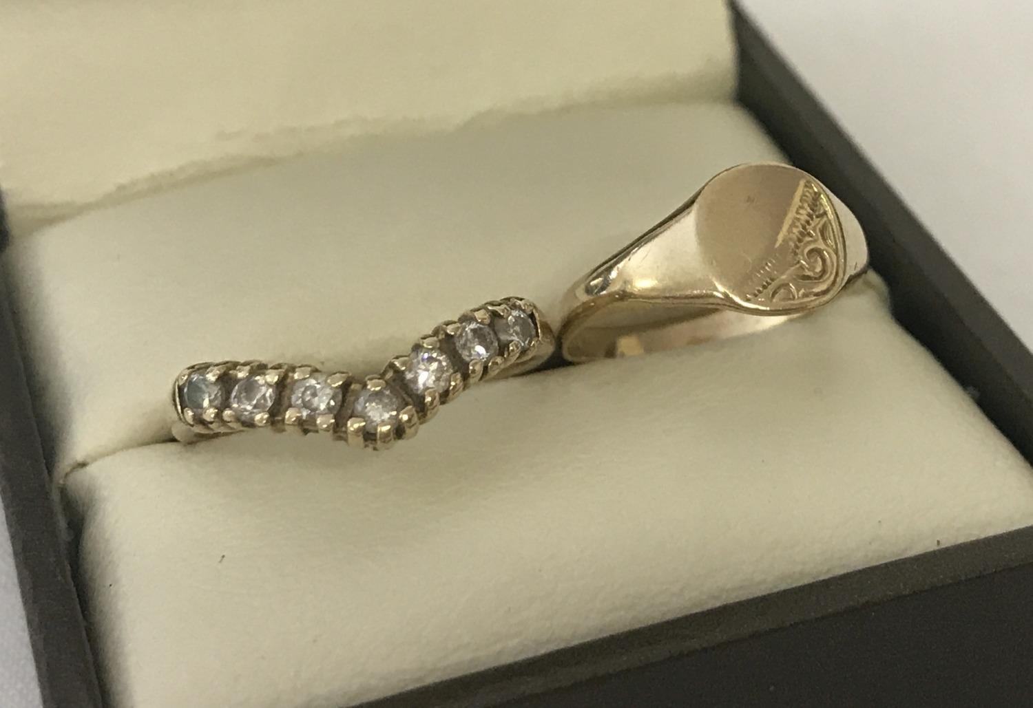 2 9ct gold children's rings. A signet ring with engraved detail to top and empty cartouche. Together with a wishbone style ring, set with cubic zirconia stones. Sizes F and G ½.