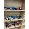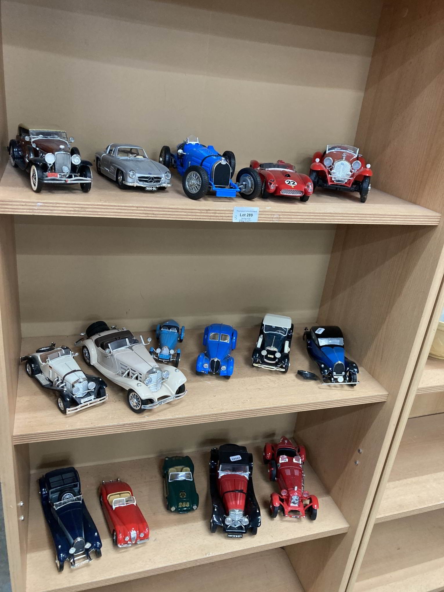 3 shelves die cast and plastic models incl. Burago Jaguar SS-100 1937, Bugatti Atlantic 1936, Mercedes SSX, Ferrari 250 Testa Rossa, Alfa Romeo 2300 Spider 1932 etc and other makes (some as found)