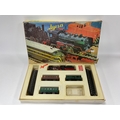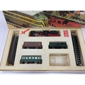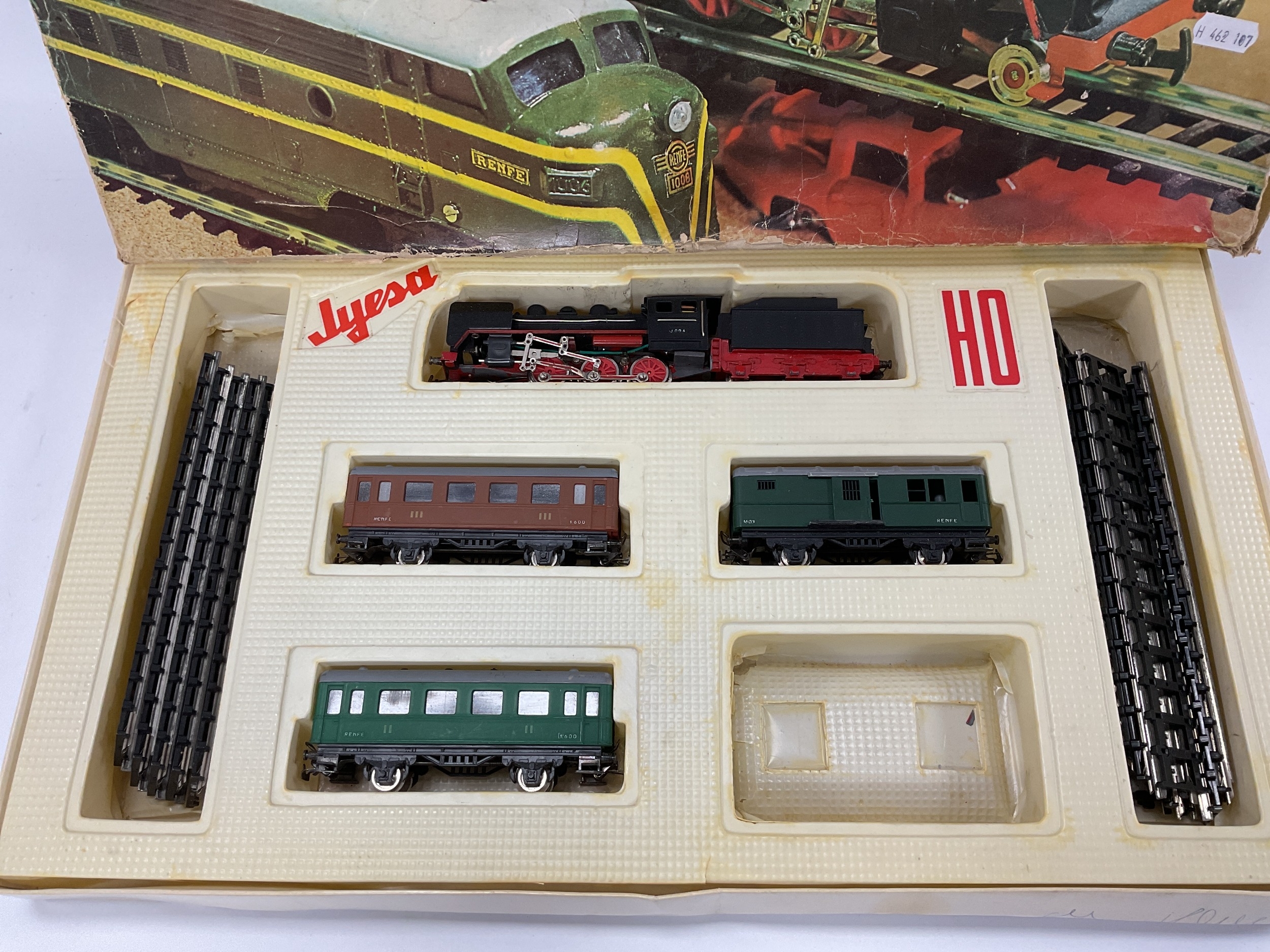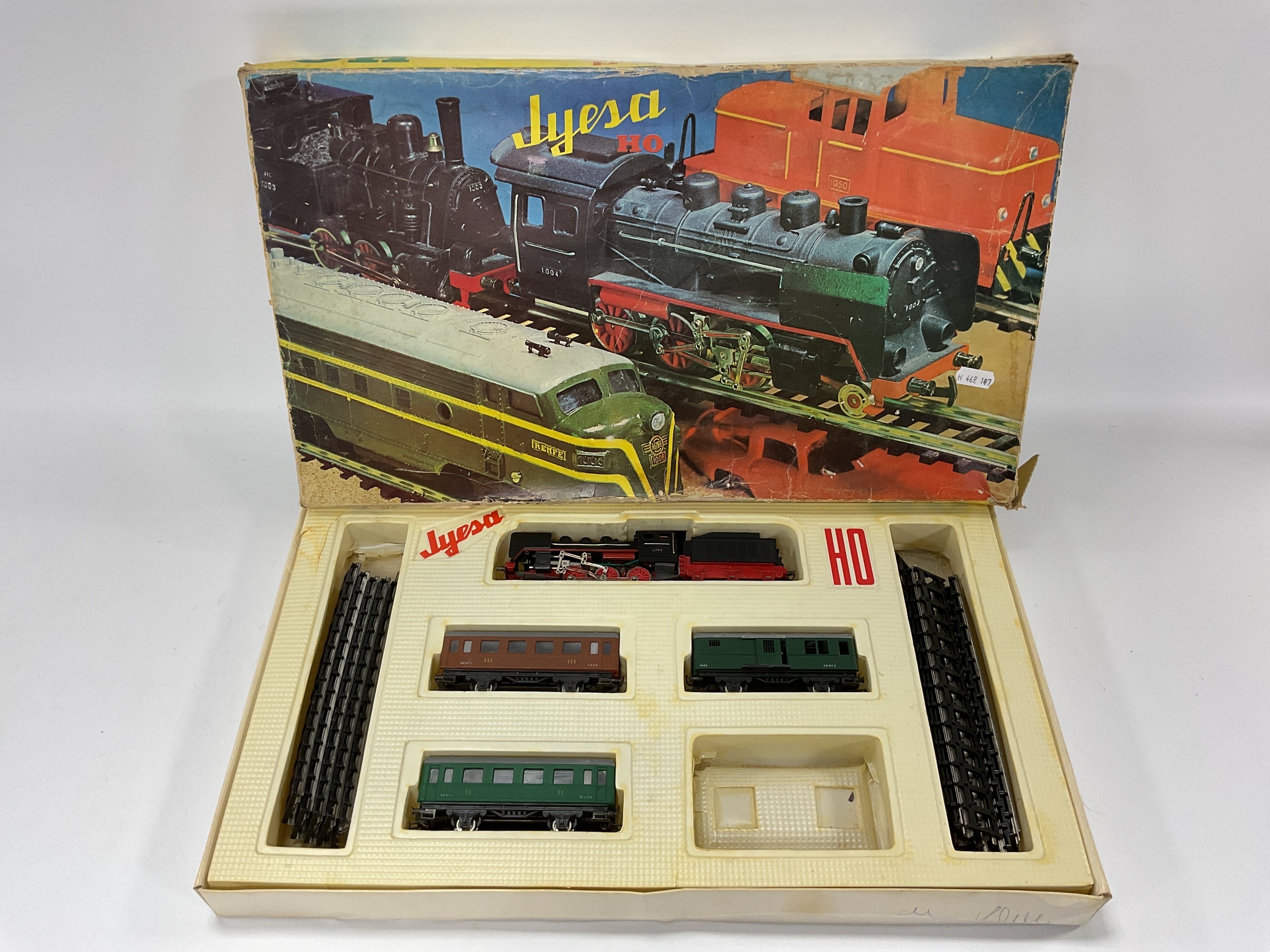 A boxed Jyesa (Spanish) HO scale train set including a 2-6-0 locomotive (untested), three four-wheel coaches and some track, all playworn, box in poor condition.