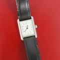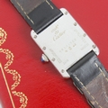 A Must De Cartier silver tank wristwatch, REF 2416, the rectangular dial with circular Arabic numeral detail, set to plain polished case, stamped to reverse 'Must De Cartier argent 2416 - 681215cc' 3cm long, upon associated leather strap, 22cm long, gross weight 27gms (including movement and strap) with original Cartier strap (at fault) and booklet