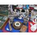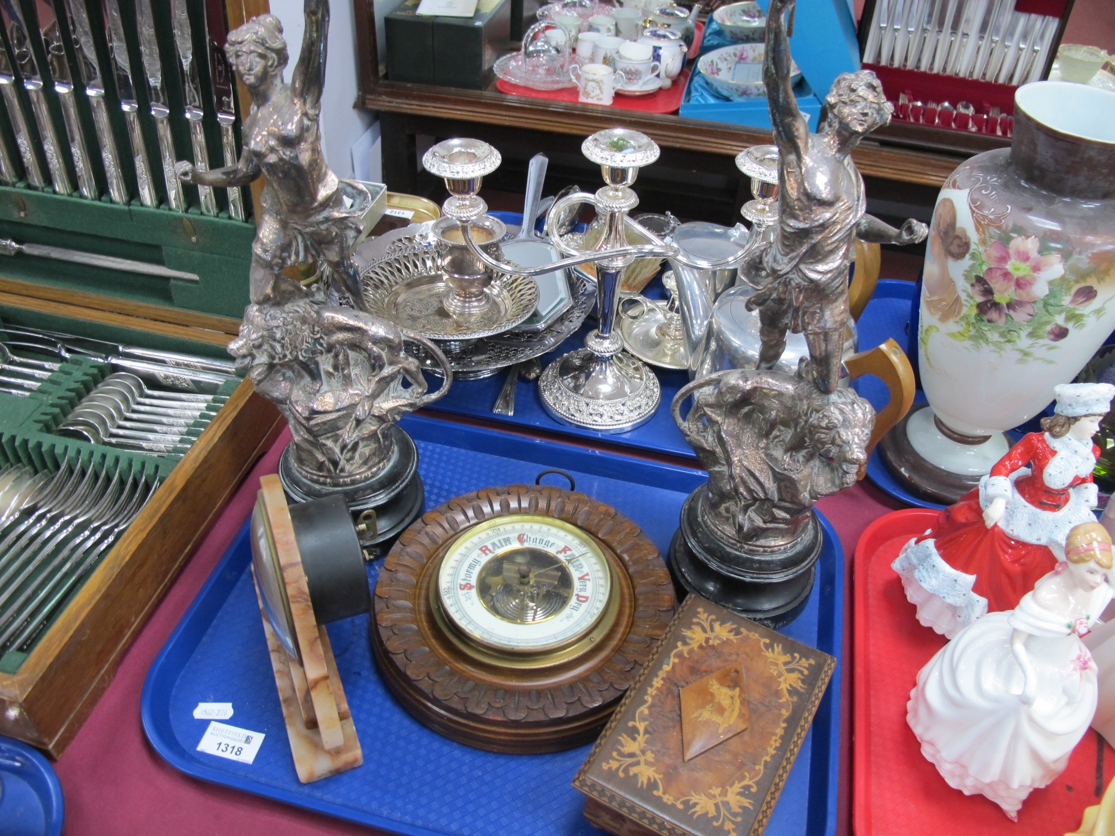 XIX century pair of French plated soft metal, figures Le Pouvoir, La Force, alabaster mantel clock and Anaroid barometer. 1 Tray.