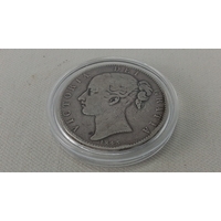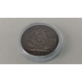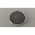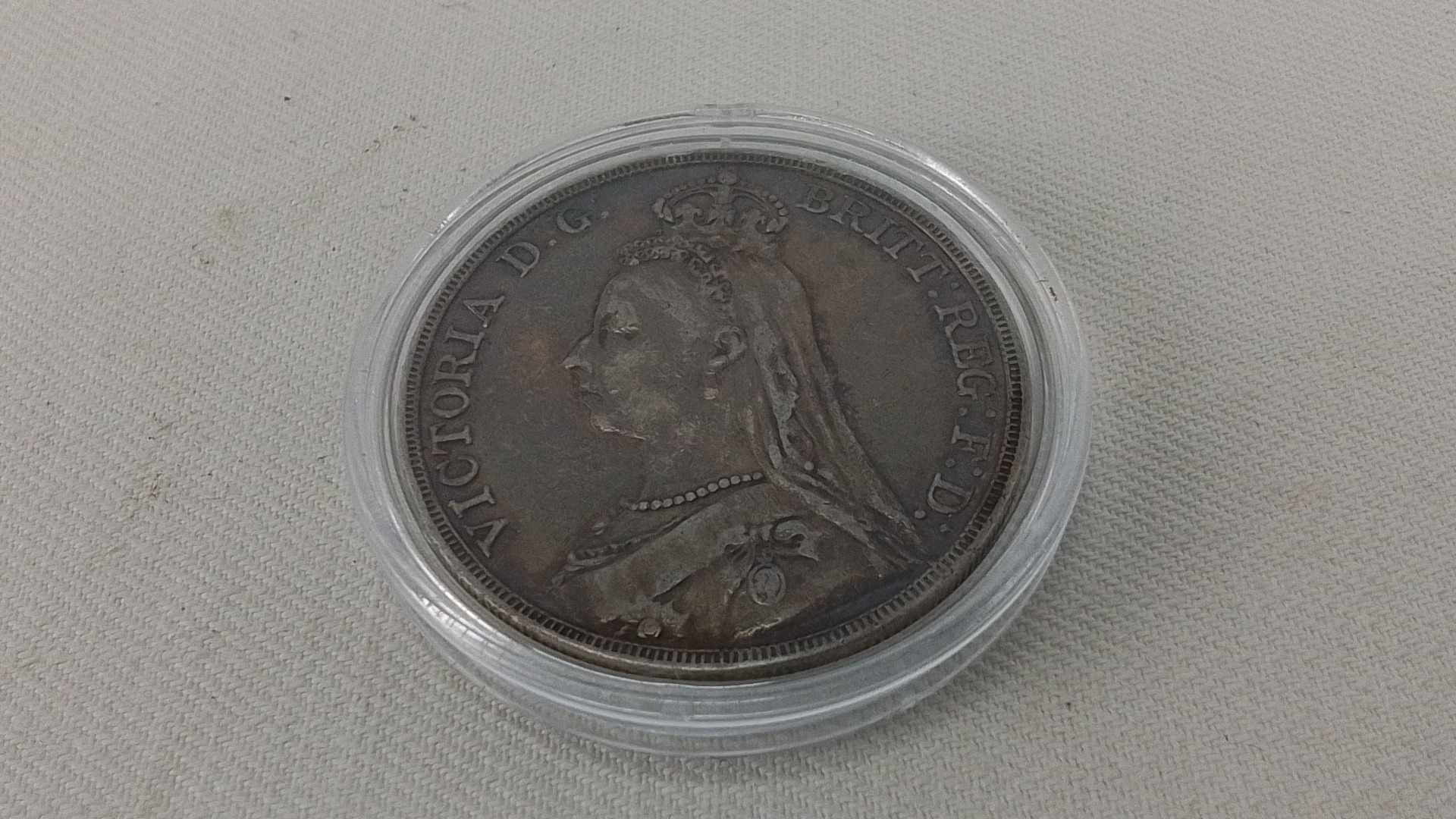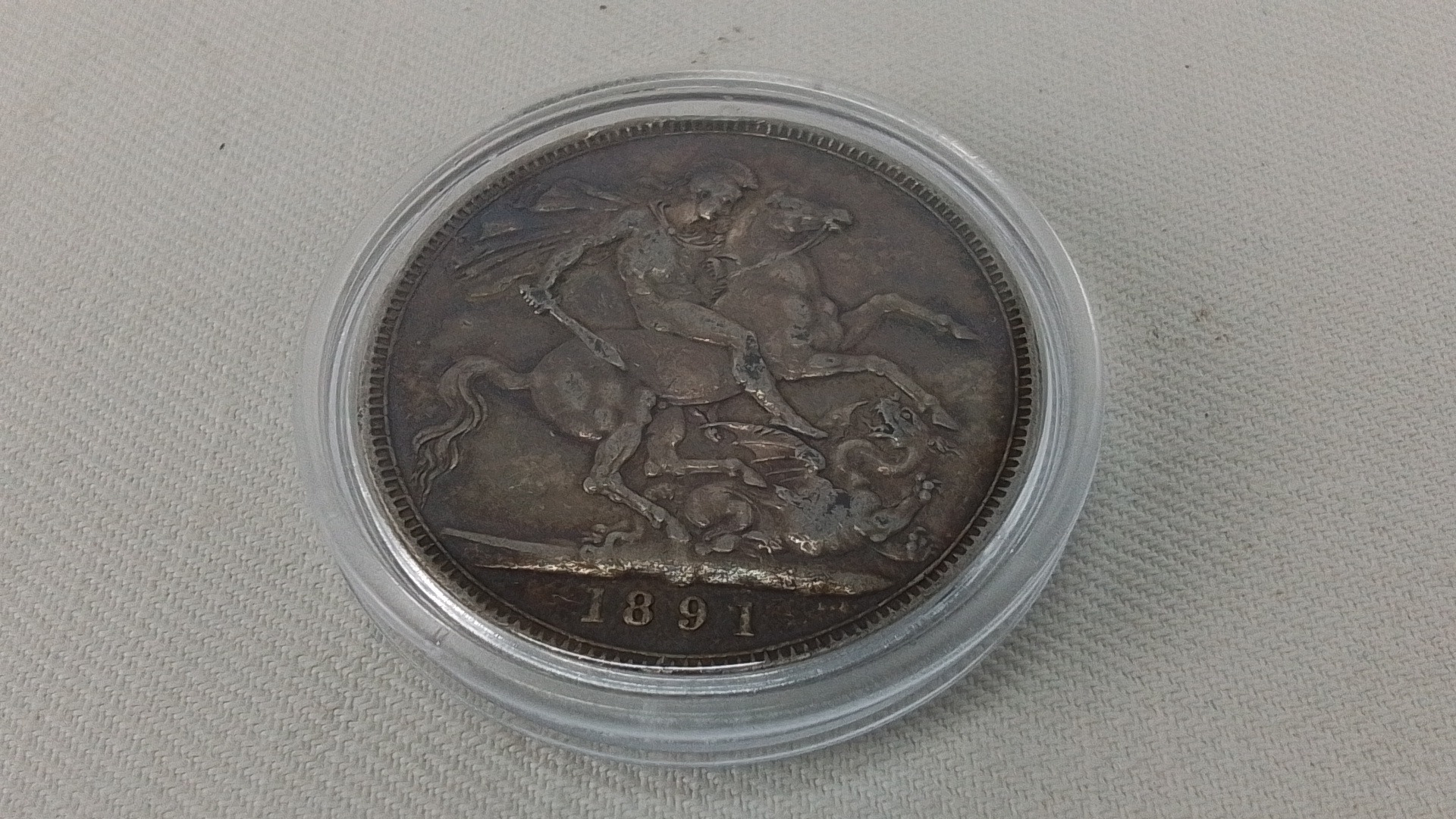 An 1891 British silver Crown, featuring St George and the Dragon reverse and the veiled head portrait of Queen Victoria with 'VICTORIA D:G: BRITT: REG: F:D:' legend, in a capsule.