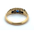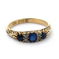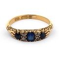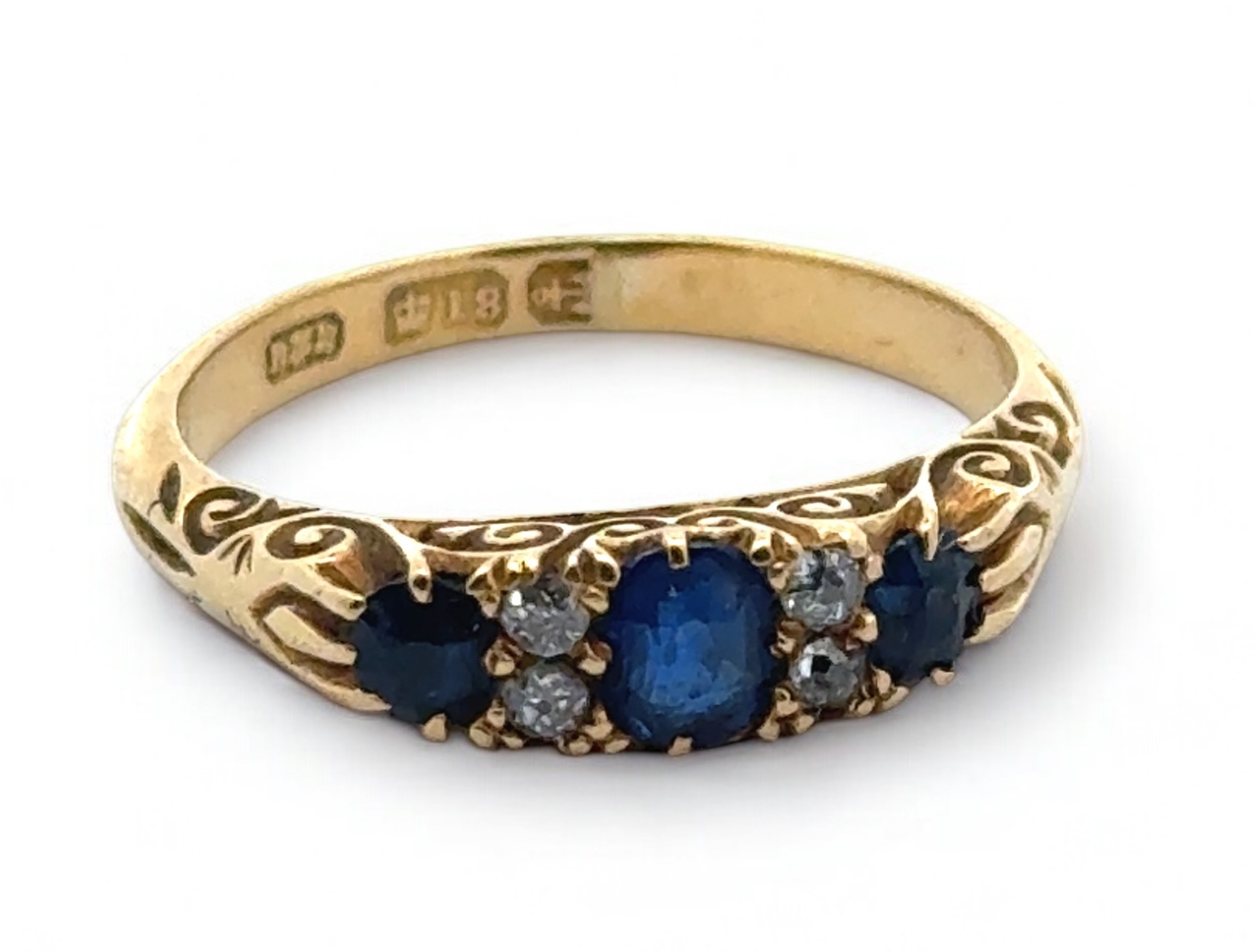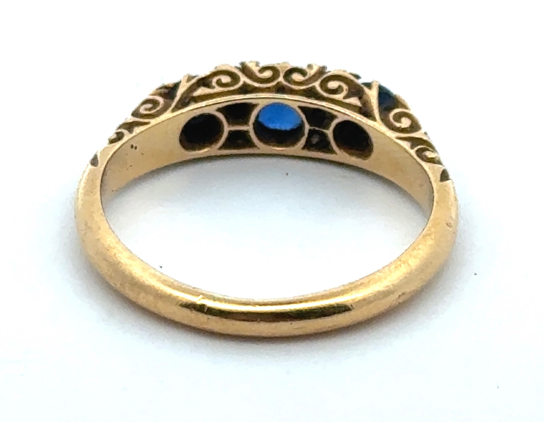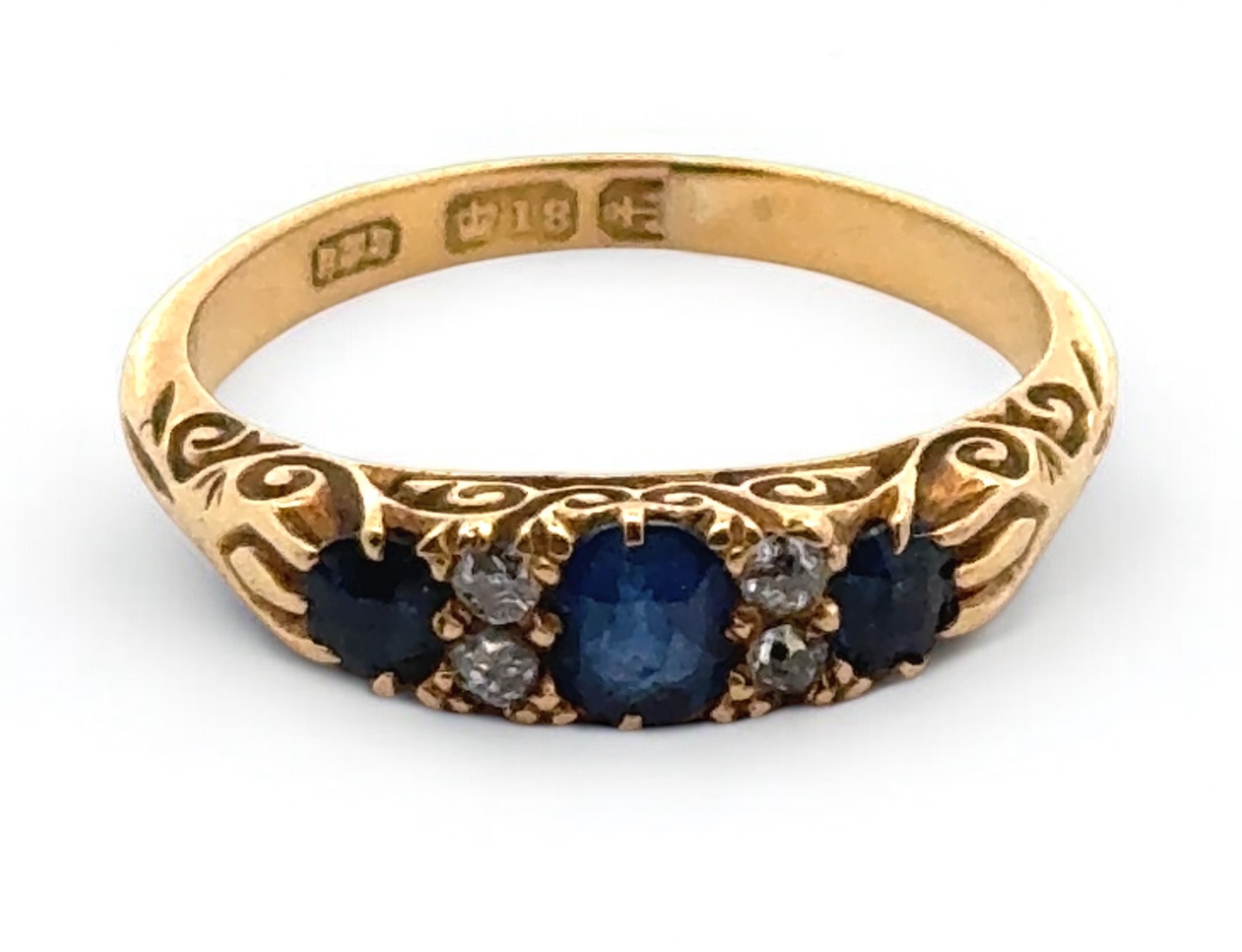 A sapphire and old cut diamond ring with scroll mount, size L. Hallmarked 18ct, Birmingham. Other hallmarks missing due to resize or repair to shank. Central sapphire with a couple of scratches to table and facet edge wear visible with loupe.