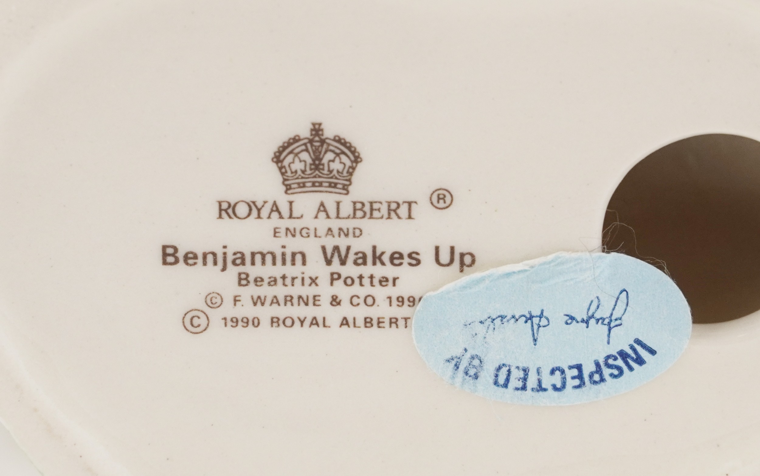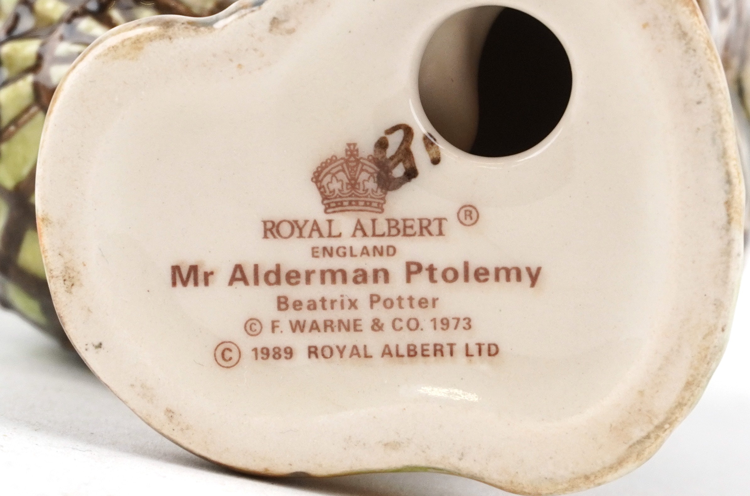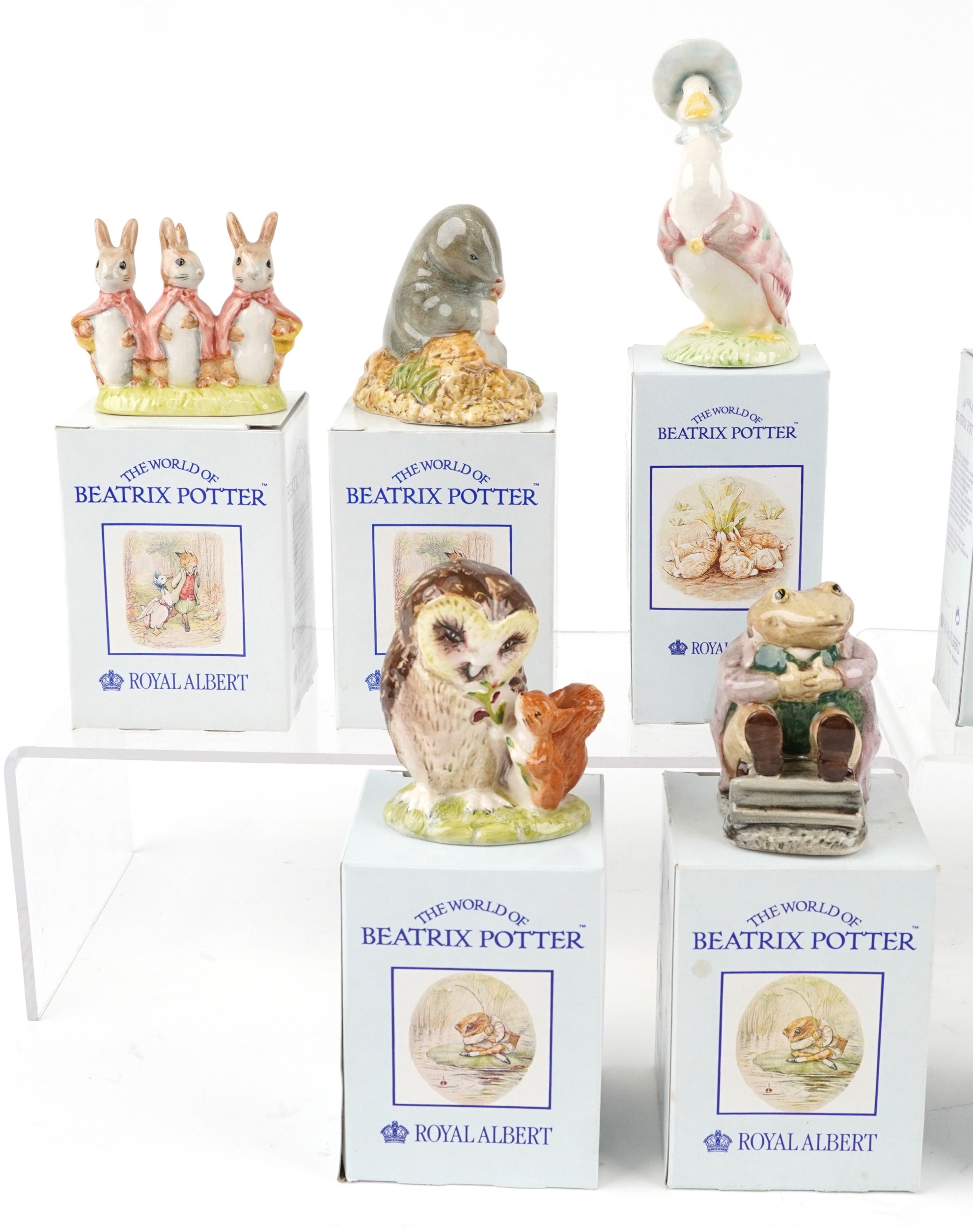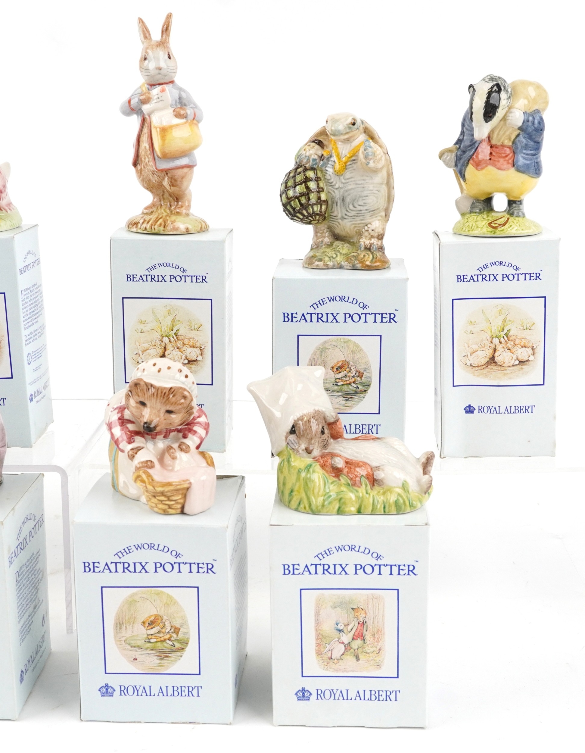 Ten Royal Albert Beatrix Potter figures with boxes including Jemima Puddleduck, Mr. Alderman Ptolemy, Benjamin Wakes Up and Tommy Brock, the largest 9.5cm high.
