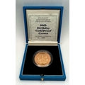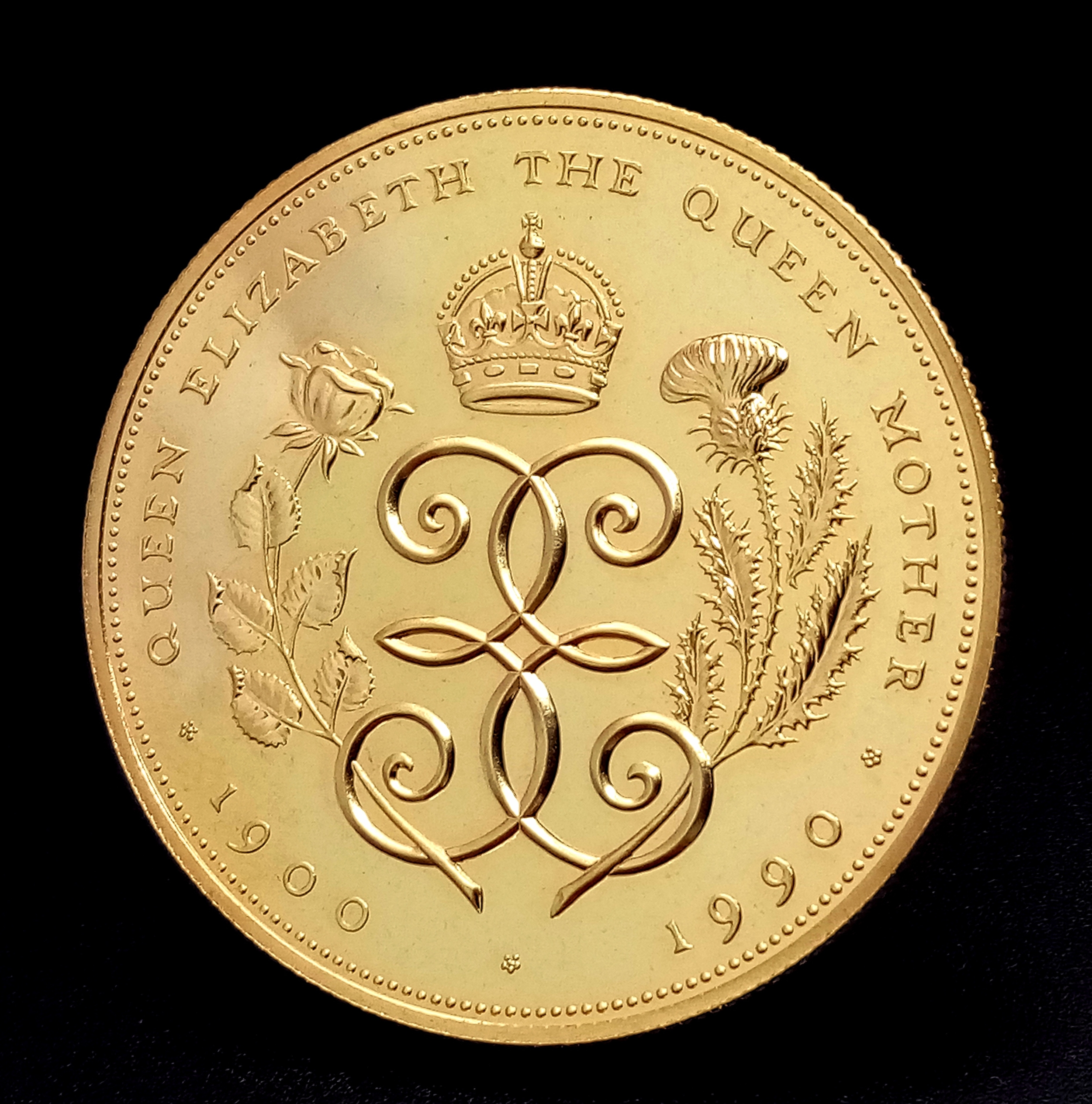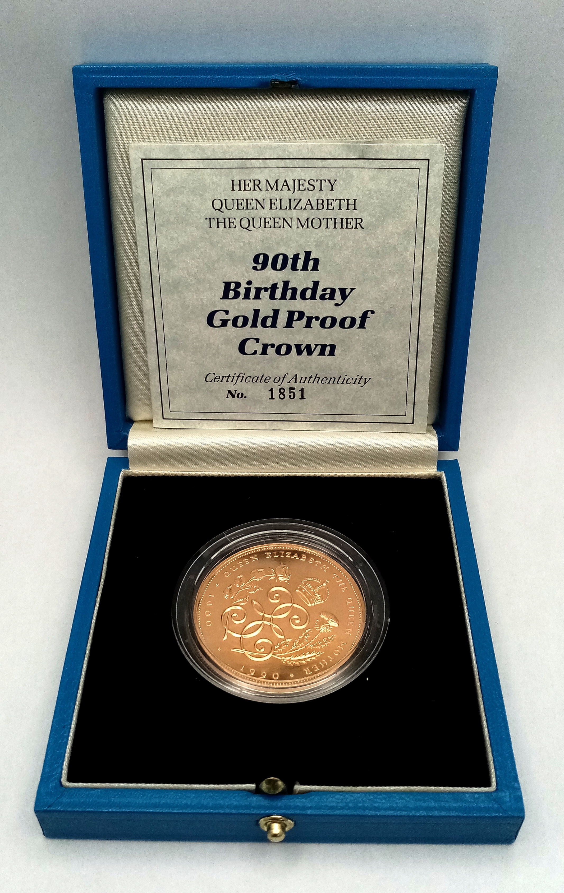 A Commemorative 90th Birthday Gold Proof £5 Crown Coin for The Queen Mother. 22k gold. Limited edition, number 1851 of 2500. Comes with certificate of authenticity and presentation case. 39.94g. A wonderful coin collectible or gift to hand down to loved ones.