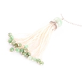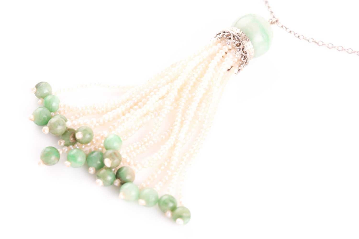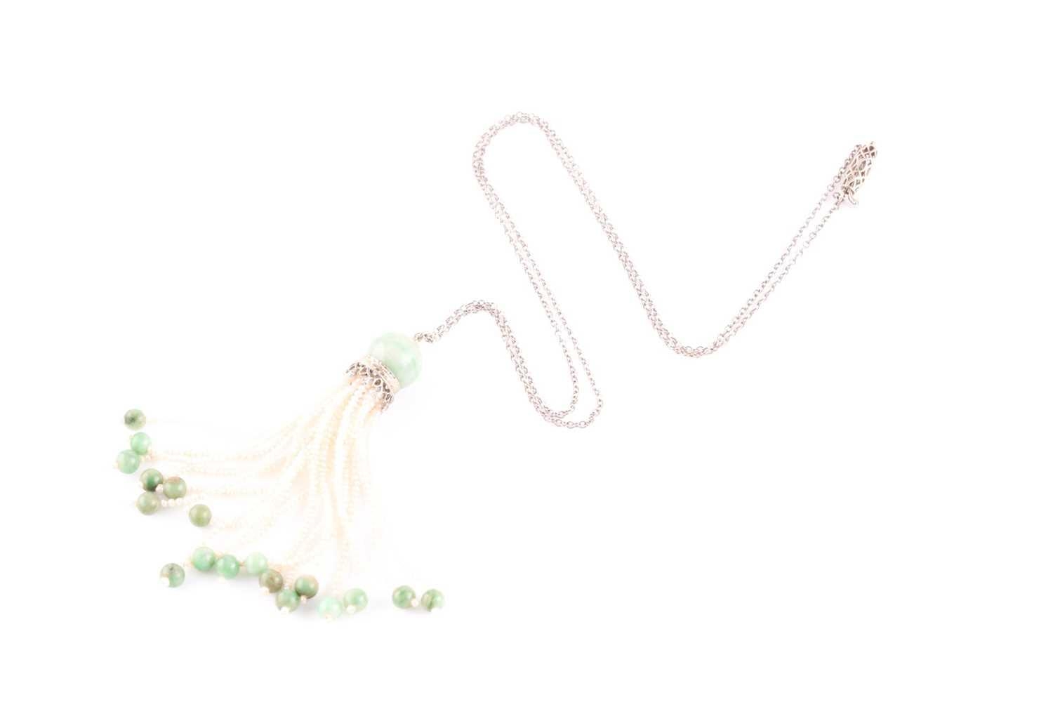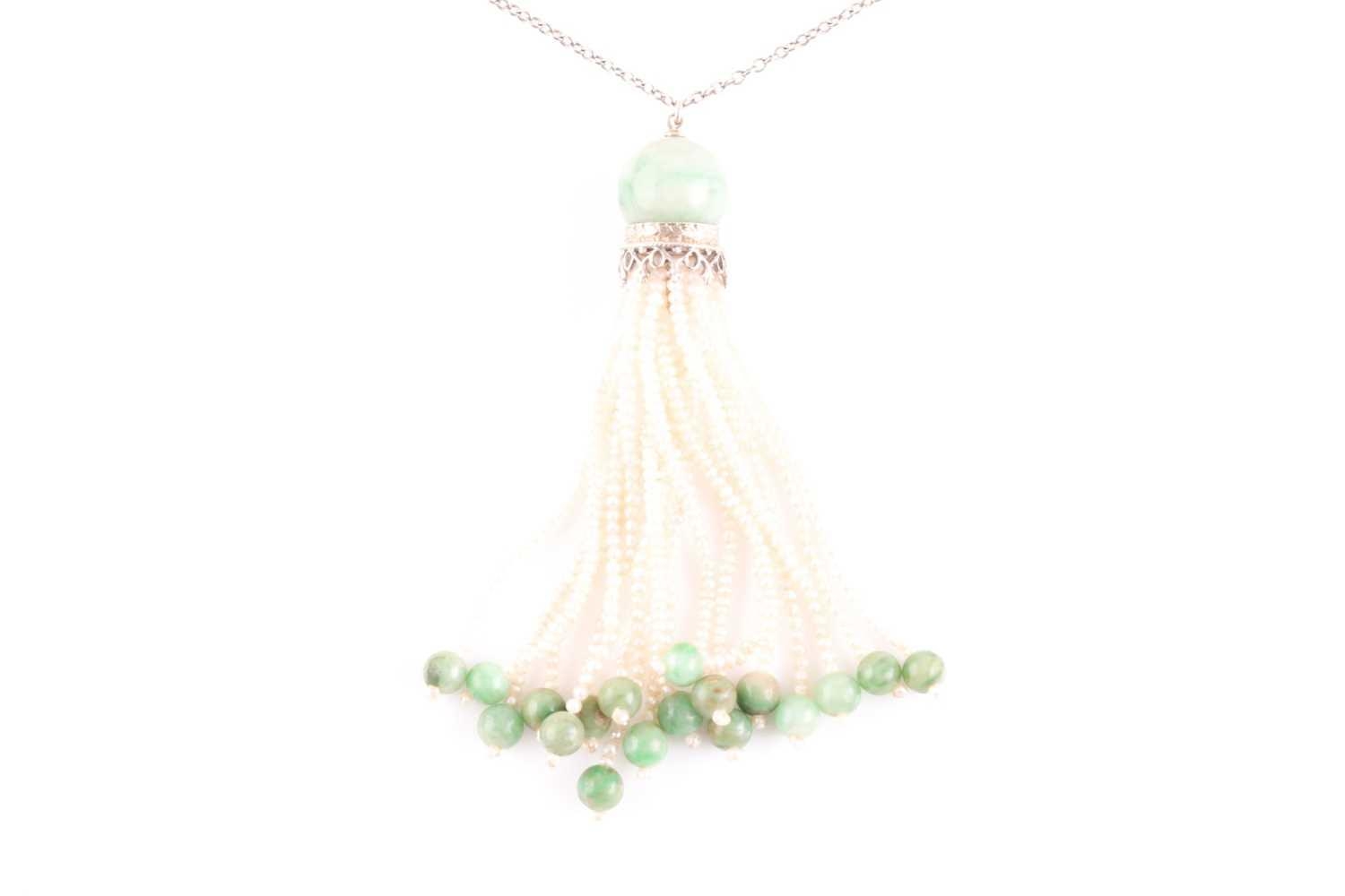 An Art Deco jade and seed pearl tassel pendant necklace, set with a rounded jade bead suspended with seed pearl strands with smaller jade beads, the pendant 6 cm long, suspended on a 14ct white gold chain necklace with barrel clasp, chain 47 cm.