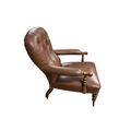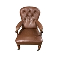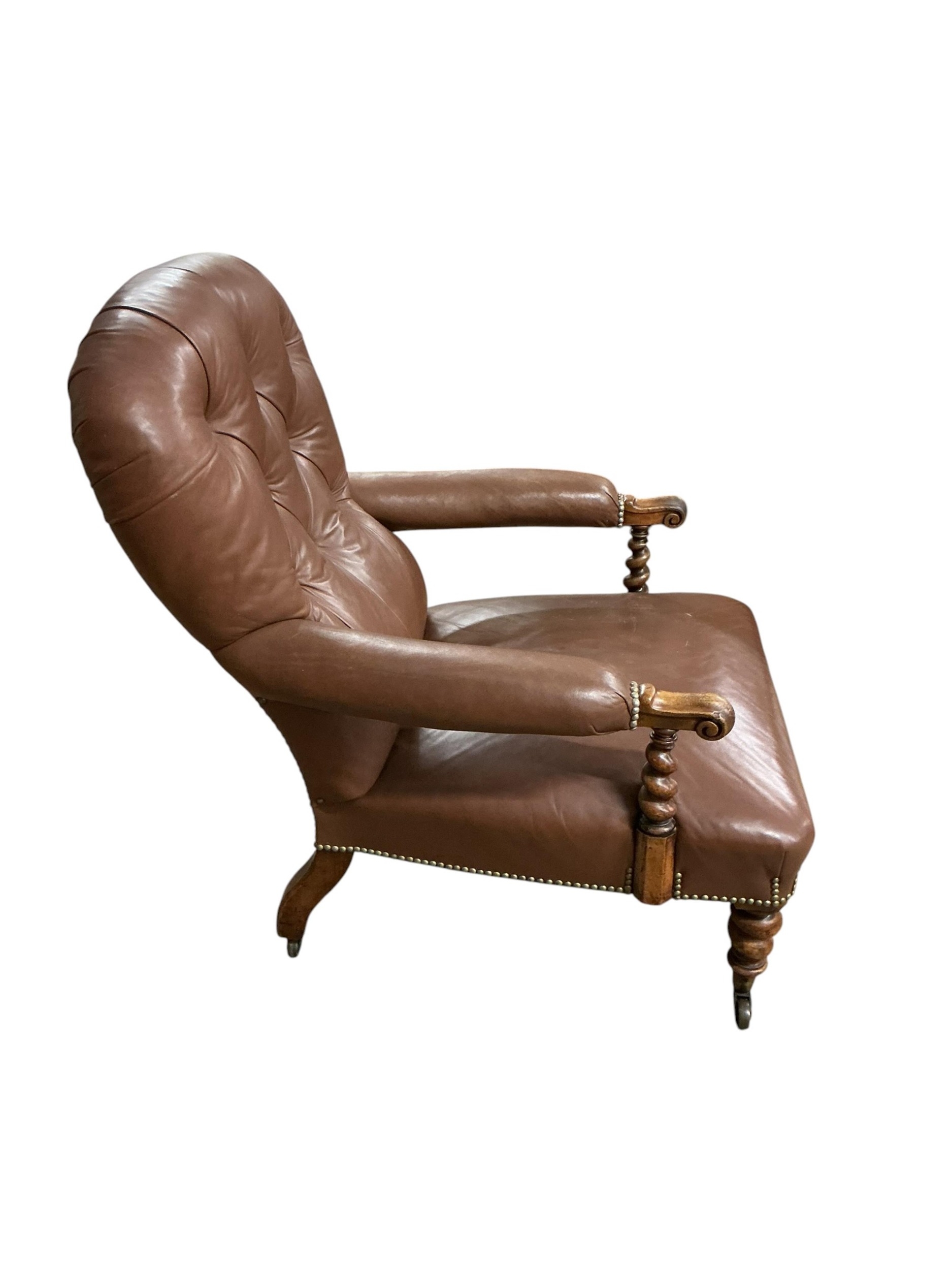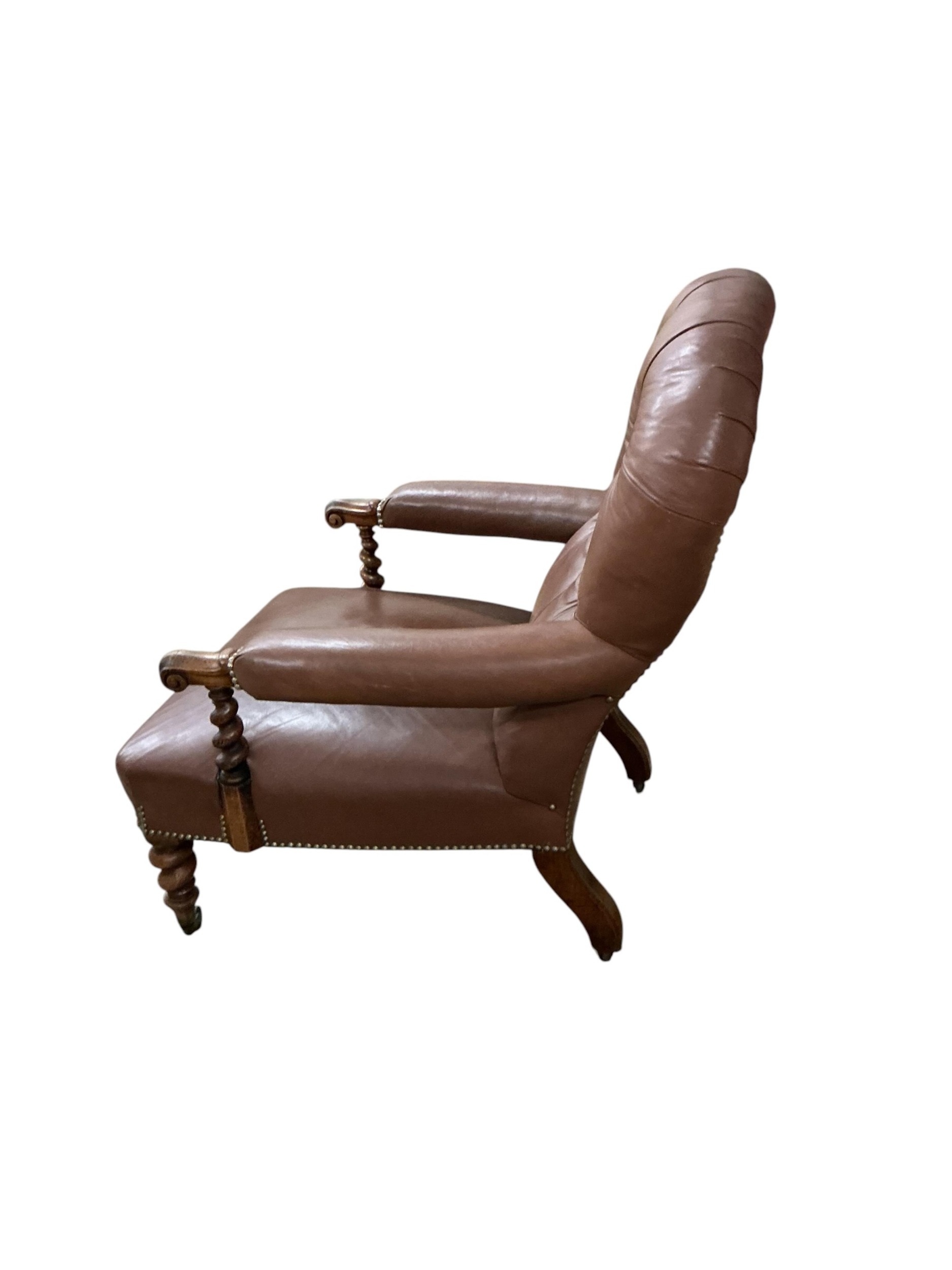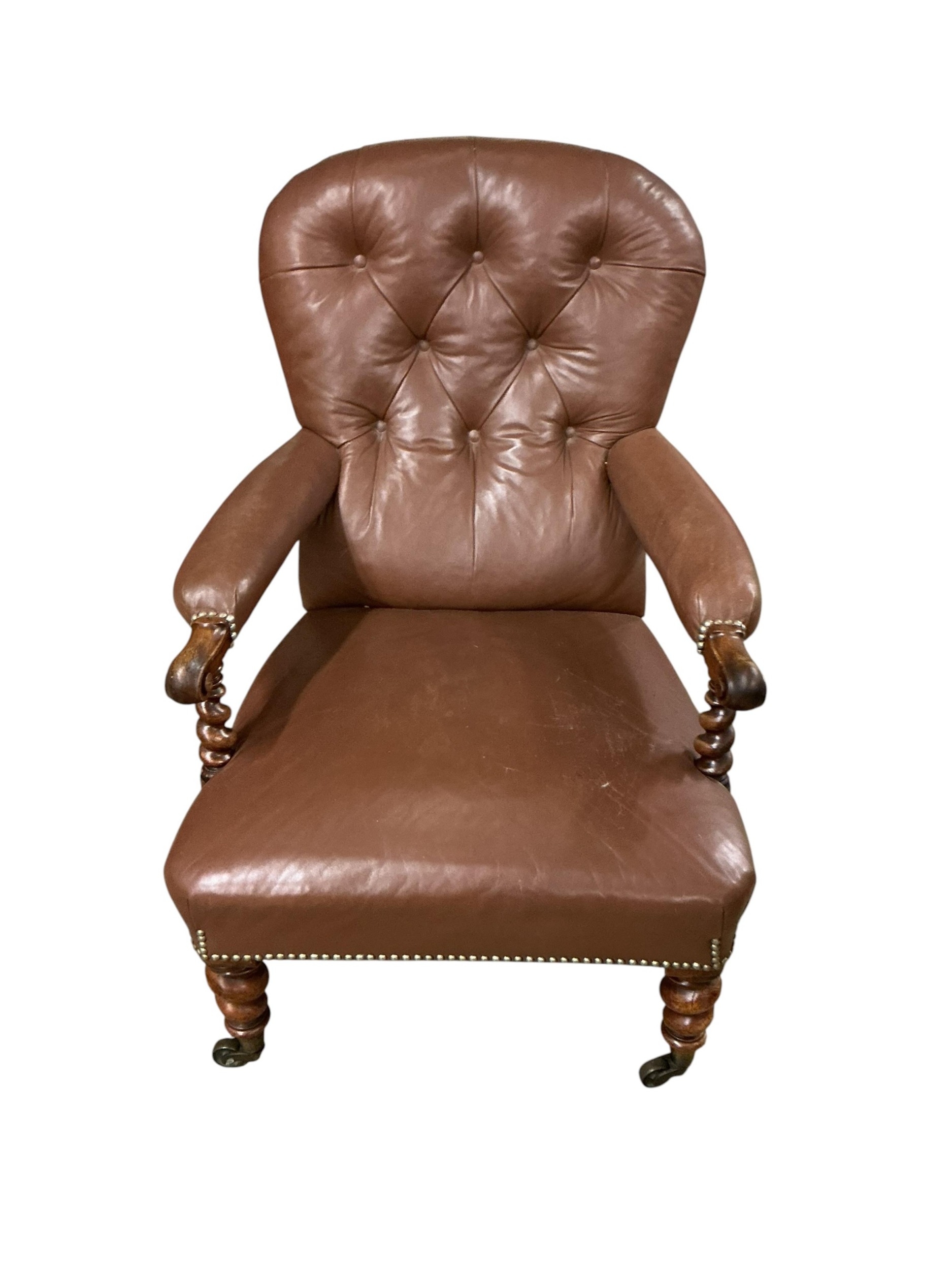 A Victorian walnut and leather upholstered library armchair with barley twist supports and legs, width 70cm, depth 70cm, height 90cm