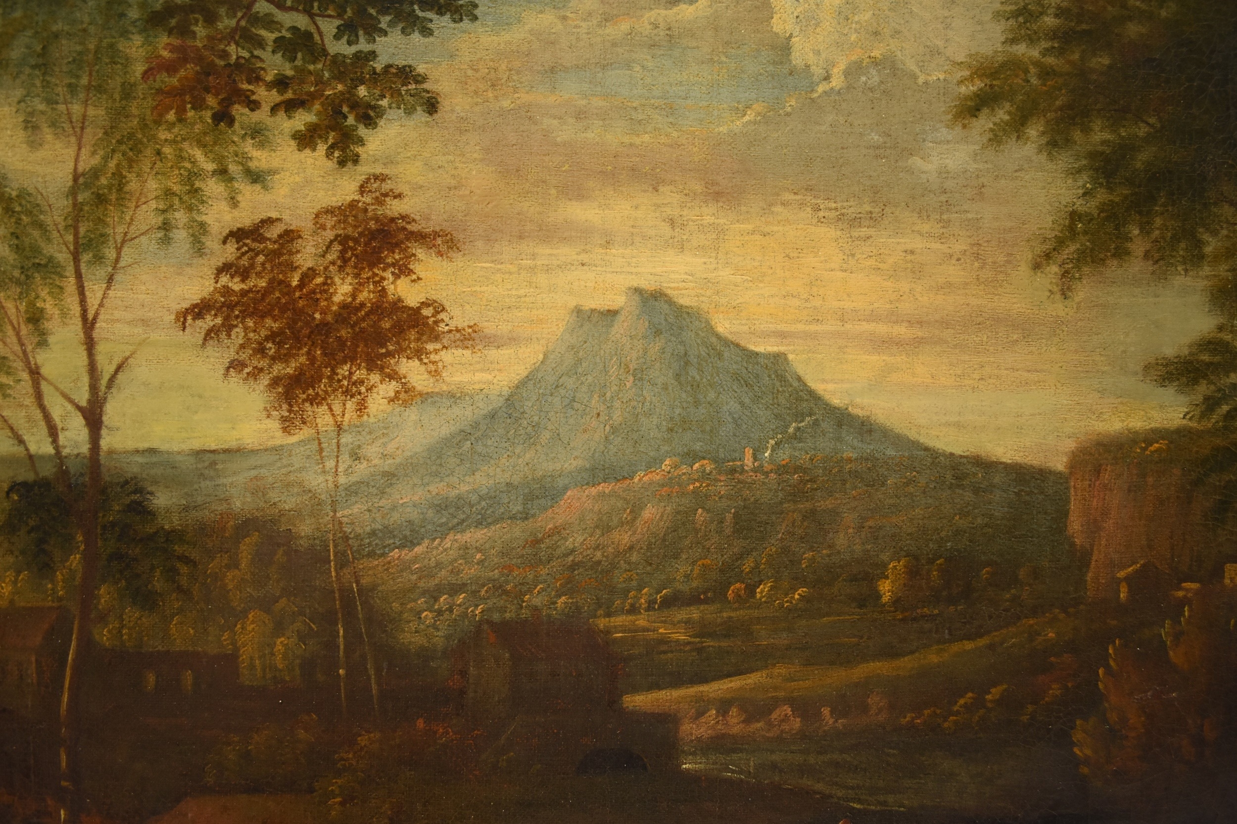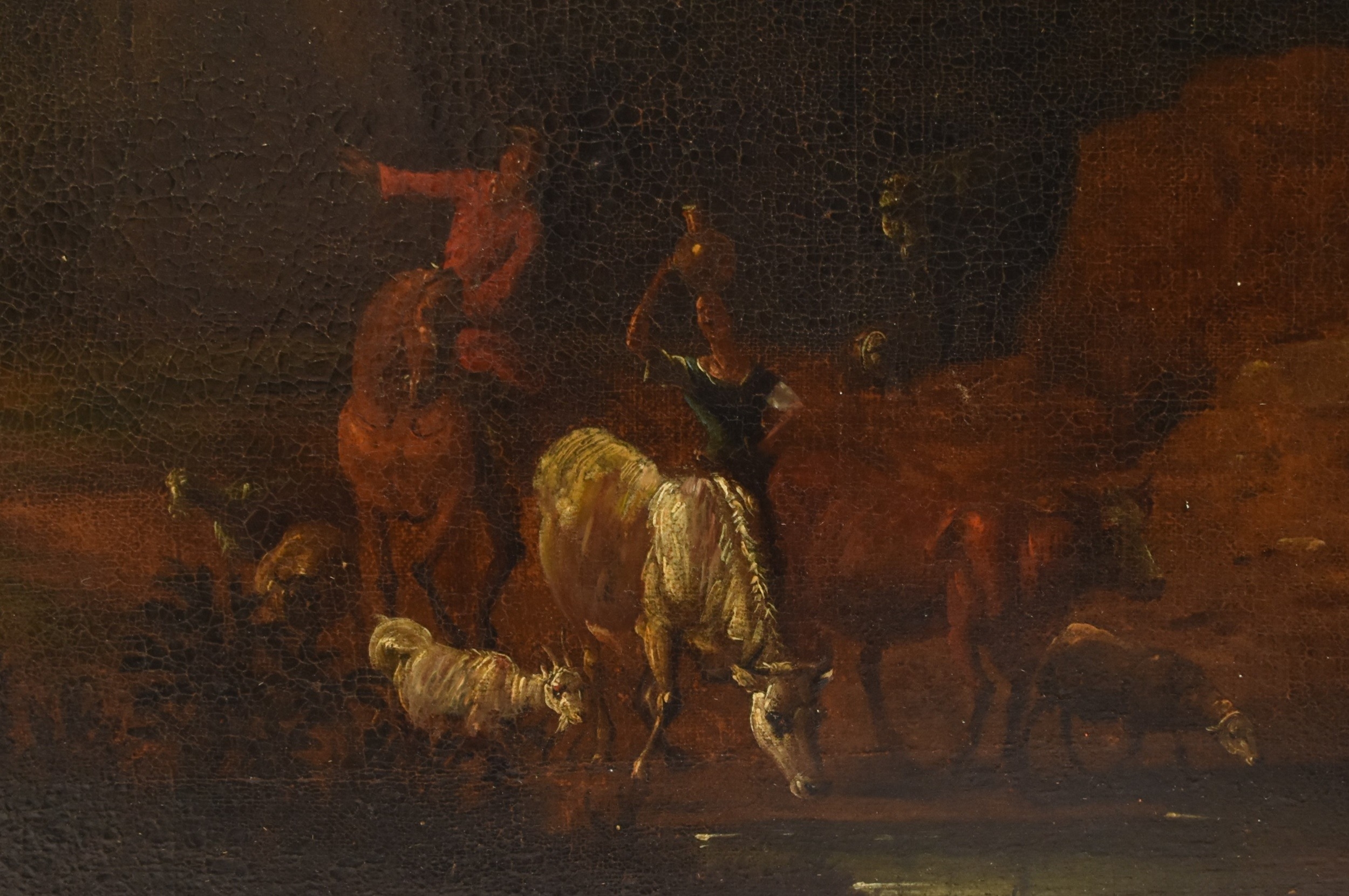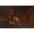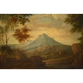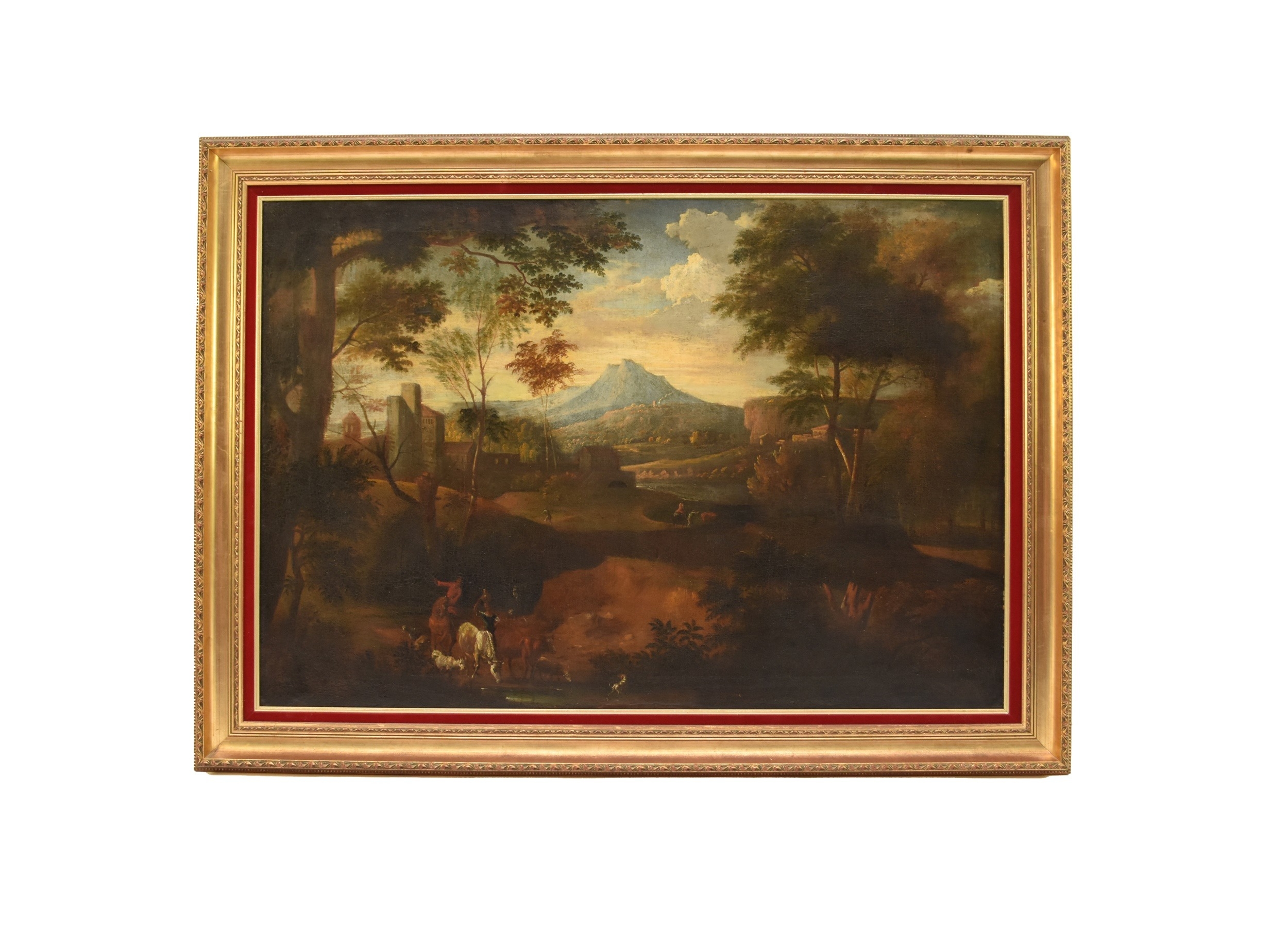 Manner of Jan Frans van Bloemen (1662-1749) An Extensive Italianate Landscape, showing peasants watering their animals at the river on the outskirts of a walled town, a mountainous landscape beyond, oil on canvas, 80 x 66 cm, frame 98 x 135 cm