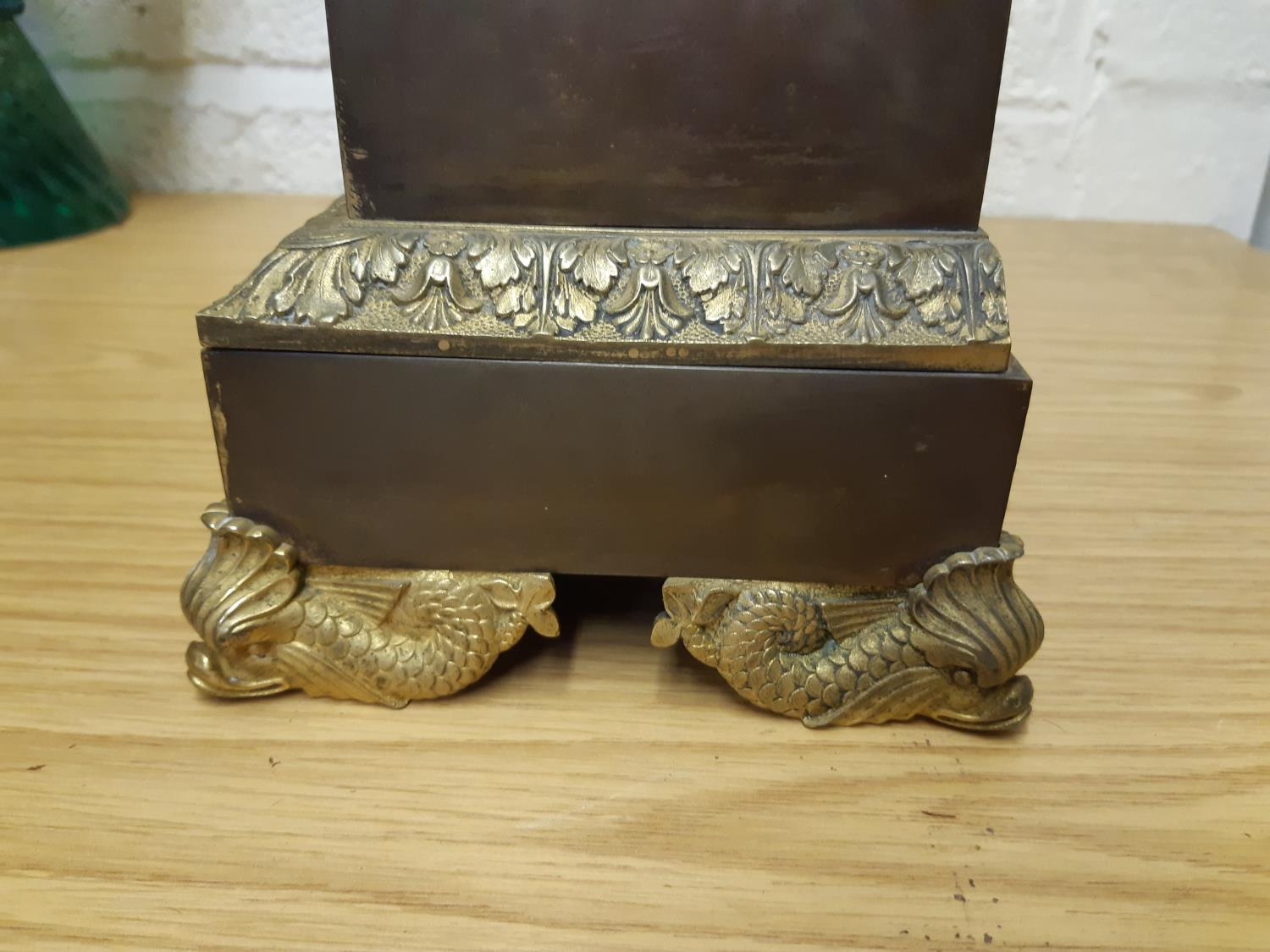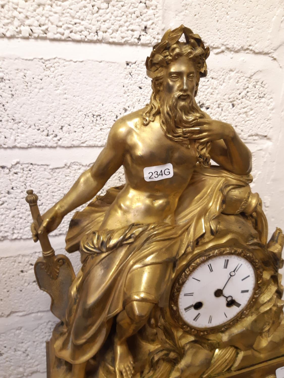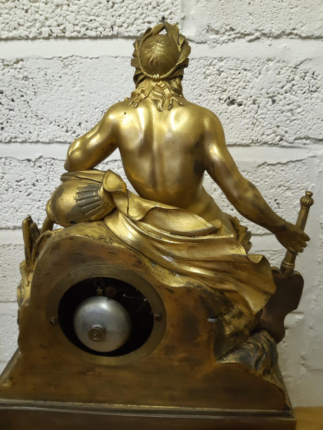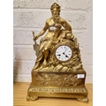 An impressive 19th century gilt metal chiming French mantel clock featuring Roman iconography to include Roman military helmet, SPQR aquila, Romulus and Remus being suckled by the she-wolf, River god Tiberinus holding rudder, stroking his beard and leaning on amphora, and acanthus leaf border to base. The body of the clock is then supported on four mythical sea creature feet.