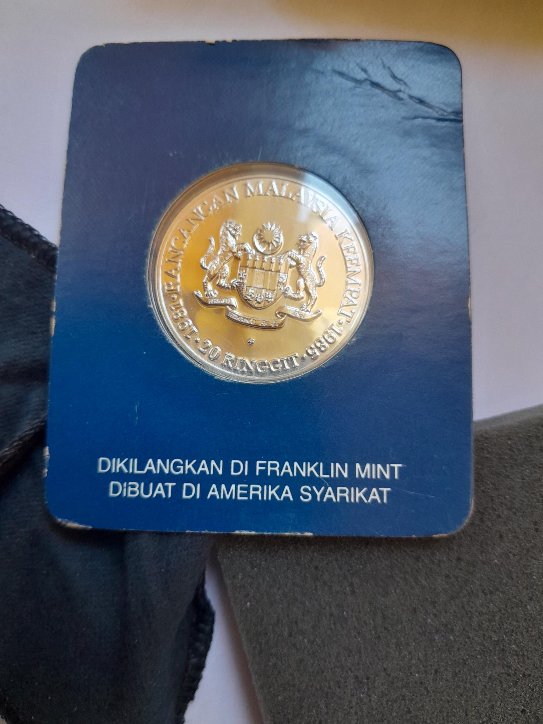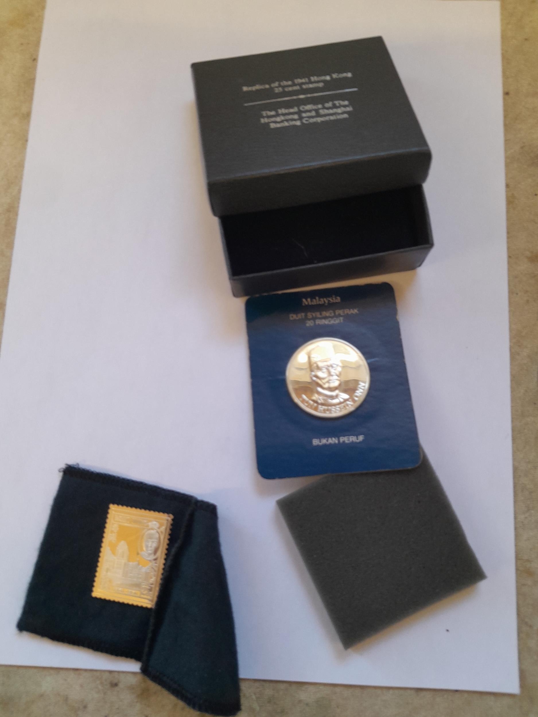 Commemorative coin : Franklin Mint 500 silver Malaysia Duit Syiling Perak 20 Rinnit & Replica of 1941 Honk Kong stamp in 925 silver